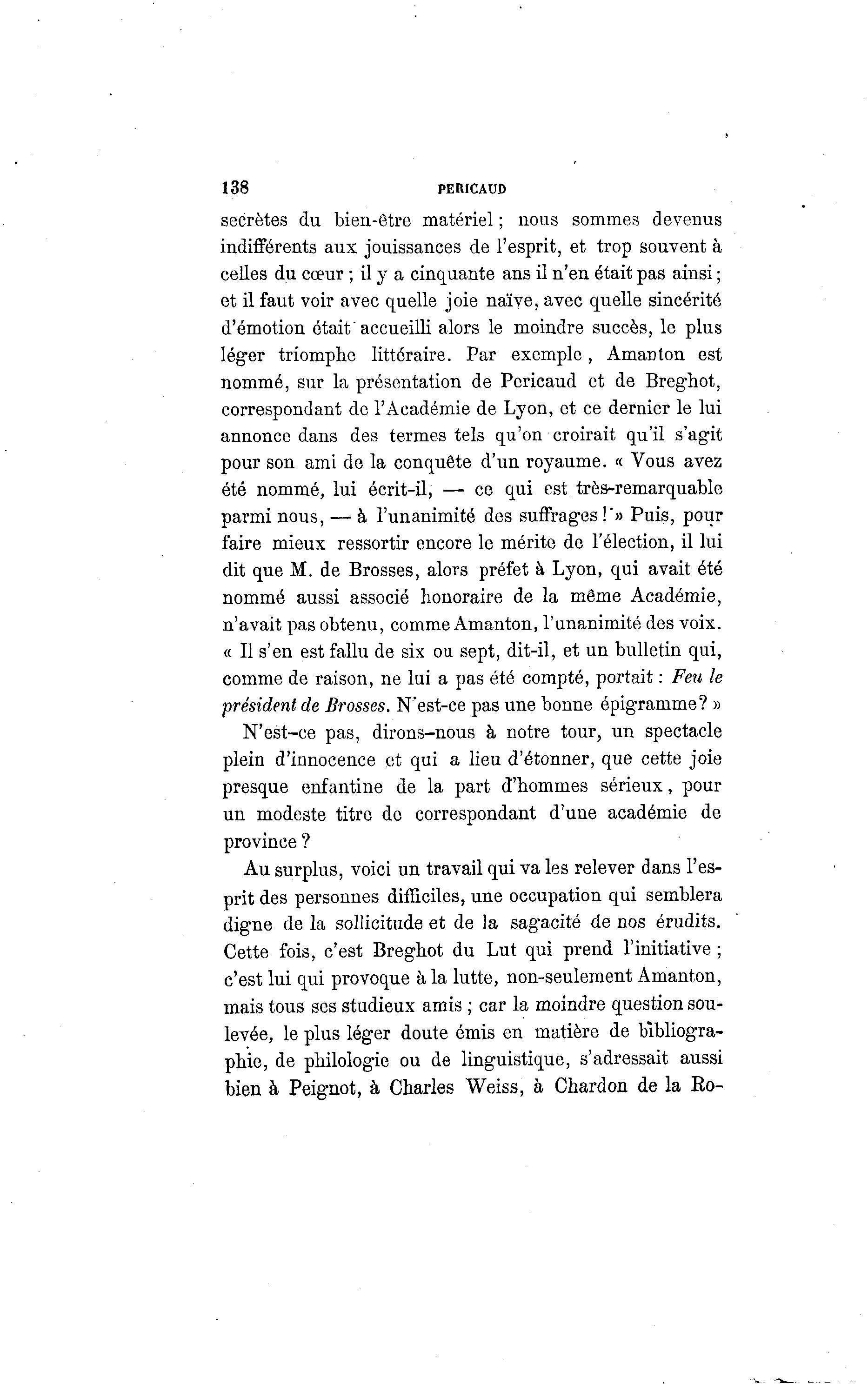 138 PERICAUD secrètes du bien-être matériel ; nous sommes devenus indifférents aux jouissances de l'esprit, et trop souvent à celles du cœur ; il y a cinquante ans il n'en était pas ainsi ; et il faut voir avec quelle joie naïve, avec quelle sincérité d'émotion était'accueilli alors le moindre succès, le plus léger triomphe littéraire. Par exemple , Aman ton est nommé, sur la présentation de Pericaud et de Breghot, correspondant de l'Académie de Lyon, et ce dernier le lui annonce dans des termes tels qu'on croirait qu'il s'agit pour son ami de la conquête d'un royaume. « Vous avez été nommé, lui écrit-il, — ce qui est très-remarquable parmi nous, — à l'unanimité des suffrages !'» Puis, pour faire mieux ressortir encore le mérite de l'élection, il lui dit que M. de Brosses, alors préfet à Lyon, qui avait été nommé aussi associé honoraire de la même Académie, n'avait pas obtenu, comme Amanton, l'unanimité des voix. « Il s'en est fallu de six ou sept, dit-il, et un bulletin qui, comme de raison, ne lui a pas été compté, portait : Feu le président de Brosses. N'est-ce pas une bonne épigramme? » N'est-ce pas, dirons-nous à notre tour, un spectacle plein d'innocence et qui a lieu d'étonner, que cette joie presque enfantine de la part d'hommes sérieux, pour un modeste titre de correspondant d'une académie de province ? Au surplus, voici un travail qui va les relever dans l'es- prit des personnes difficiles, une occupation qui semblera digne de la sollicitude et de la sagacité de nos érudits. Cette fois, c'est Breghot du Lut qui prend l'initiative ; c'est lui qui provoque à la lutte, non-seulement Amanton, mais tous ses studieux amis ; car la moindre question sou- levée, le plus léger doute émis en matière de bibliogra- phie, de philologie ou de linguistique, s'adressait aussi bien à Peignot, à Charles Weiss, à Chardon de la Ro-