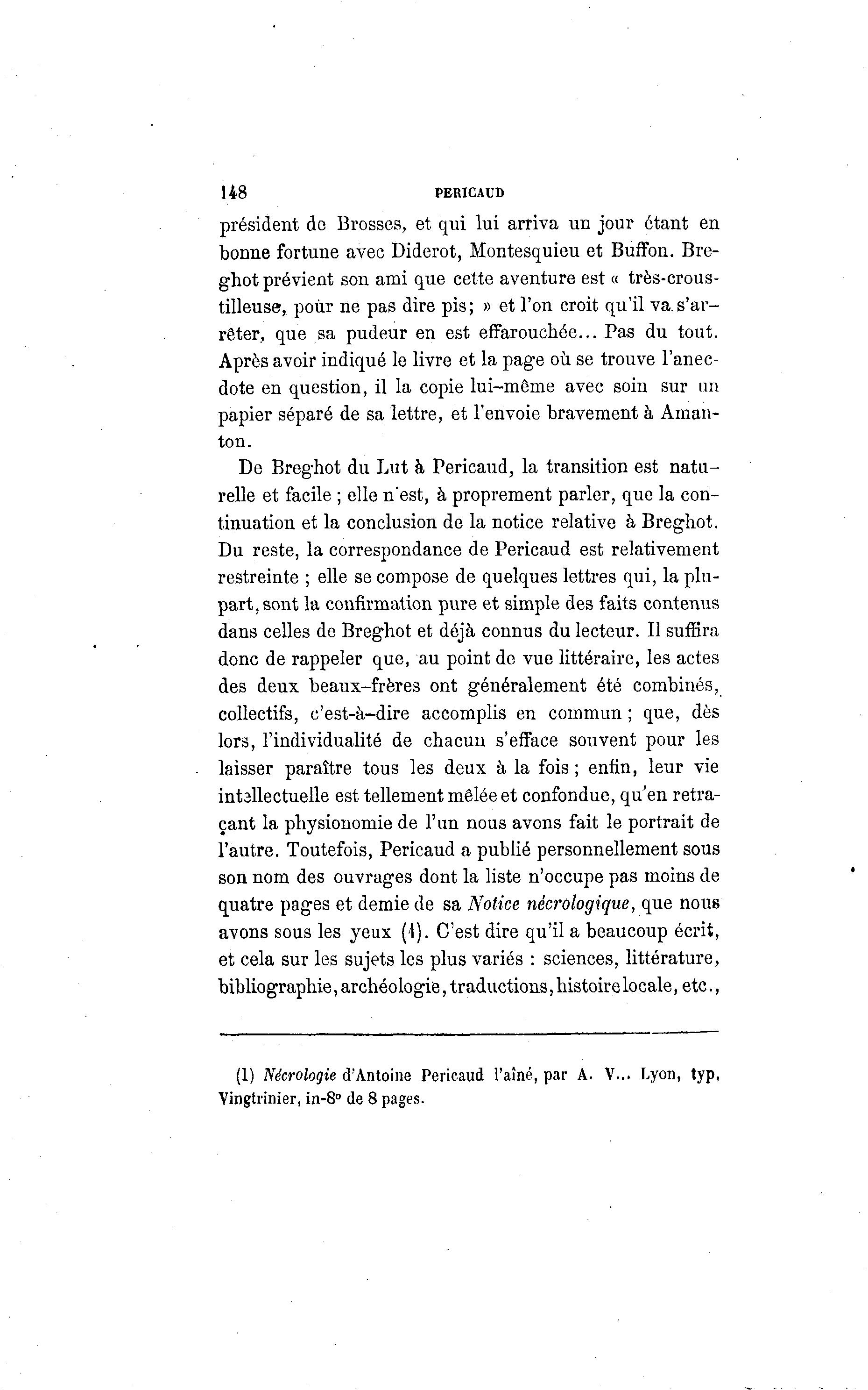 148 PERICAUD président de Brosses, et qui lui arriva un jour étant en bonne fortune avec Diderot, Montesquieu et Buffon. Bre- ghot prévient son ami que cette aventure est « très-crous- tilleuse, pour ne pas dire pis; » et l'on croit qu'il va.s'ar- rêter, que sa pudeur en est effarouchée... Pas du tout. Après avoir indiqué le livre et la page où se trouve l'anec- dote en question, il la copie lui-même avec soin sur un papier séparé de sa lettre, et l'envoie bravement à Aman- ton. De Breghot du Lut à Pericaud, la transition est natu- relle et facile ; elle n'est, à proprement parler, que la con- tinuation et la conclusion de la notice relative à Breghot. Du reste, la correspondance de Pericaud est relativement restreinte ; elle se compose de quelques lettres qui, la plu- part, sont la confirmation pure et simple des faits contenus dans celles de Breghot et déjà connus du lecteur. Il suffira donc de rappeler que, au point de vue littéraire, les actes des deux beaux-frères ont généralement été combinés, collectifs, c'est-à -dire accomplis en commun ; que, dès lors, l'individualité de chacun s'efface souvent pour les laisser paraître tous les deux à la fois ; enfin, leur vie intellectuelle est tellement mêlée et confondue, qu'en retra- çant la physionomie de l'un nous avons fait le portrait de l'autre. Toutefois, Pericaud a publié personnellement sous son nom des ouvrages dont la liste n'occupe pas moins de quatre pages et demie de sa Notice nécrologique, que nous avons sous les yeux (\). C'est dire qu'il a beaucoup écrit, et cela sur les sujets les plus variés : sciences, littérature, bibliographie, archéologie, traductions, histoire locale, etc., (1) Nécrologie d'Antoine Pericaud l'aîné, par A. V... Lyon, typ, Vingtrinier, in-8° de 8 pages.