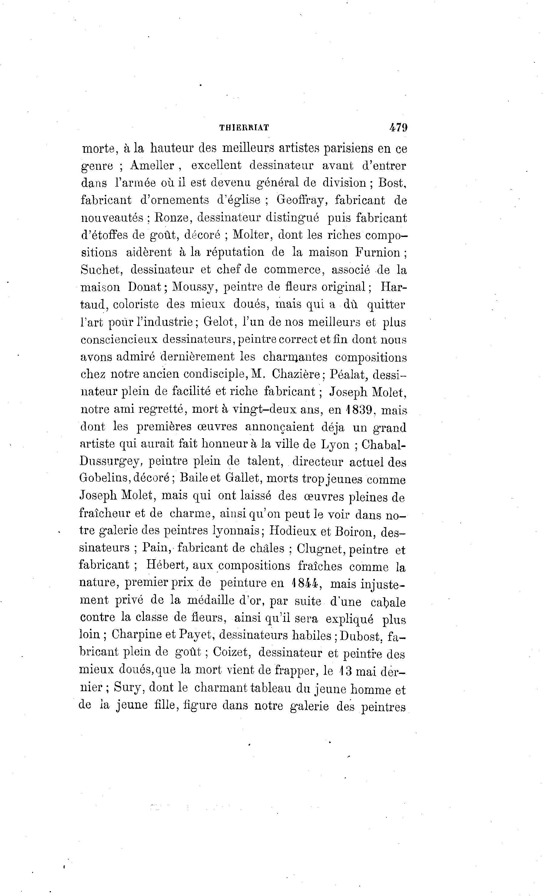 THIERRIAT 479 morte, à la hauteur des meilleurs artistes parisiens en ce genre ; Ameller , excellent dessinateur avant d'entrer dans l'armée où il est devenu général de division ; Bost, fabricant d'ornements d'église ; Geoffray, fabricant de nouveautés ; Ronze, dessinateur distingué puis fabricant d'étoffes de goût, décoré ; Molter, dont les riches compo- sitions aidèrent à la réputation de la maison Furnion ; Suchet, dessinateur et chef de commerce, associé de la maison Donat ; Moussy, peintre de fleurs original ; Har- taud, coloriste des mieux doués, mais qui a dû quitter l'art pour l'industrie ; Gelot, l'un de nos meilleurs et plus consciencieux dessinateurs, peintre correct et fin dont nous avons admiré dernièrement les charmantes compositions chez notre ancien condisciple, M. Chazière; Péalat, dessi- nateur plein de facilité et riche fabricant ; Joseph Molet, notre ami regretté, mort à vingt-deux ans, en 1839, mais dont les premières œuvres annonçaient déjà un grand artiste qui aurait fait honneur à la ville de Lyon ; Chabal- Dussurgey, peintre plein de talent, directeur actuel des Gobelins, décoré; Baileet Gallet, morts trop jeunes comme Joseph Molet, mais qui ont laissé des œuvres pleines de fraîcheur et de charme, ainsi qu'on peut le voir dans n o - tre galerie des peintres lyonnais; Hodieux et Boiron, des- sinateurs ; Pain, fabricant de châles ; Clugnet, peintre et fabricant ; Hébert, aux compositions fraîches comme la nature, premier prix de peinture en 1844, mais injuste- ment privé de la médaille d'or, par suite d'une cabale contre la classe de fleurs, ainsi qu'il sera expliqué plus loin ; Charpine et Payet, dessinateurs habiles ; Dubost. fa- bricant plein de goût ; Coizet, dessinateur et peintre des mieux doués, que la mort vient de frapper, le 13 mai der- nier ; Sury, dont le charmant tableau du jeune homme et de la jeune fille, figure dans notre galerie des peintres