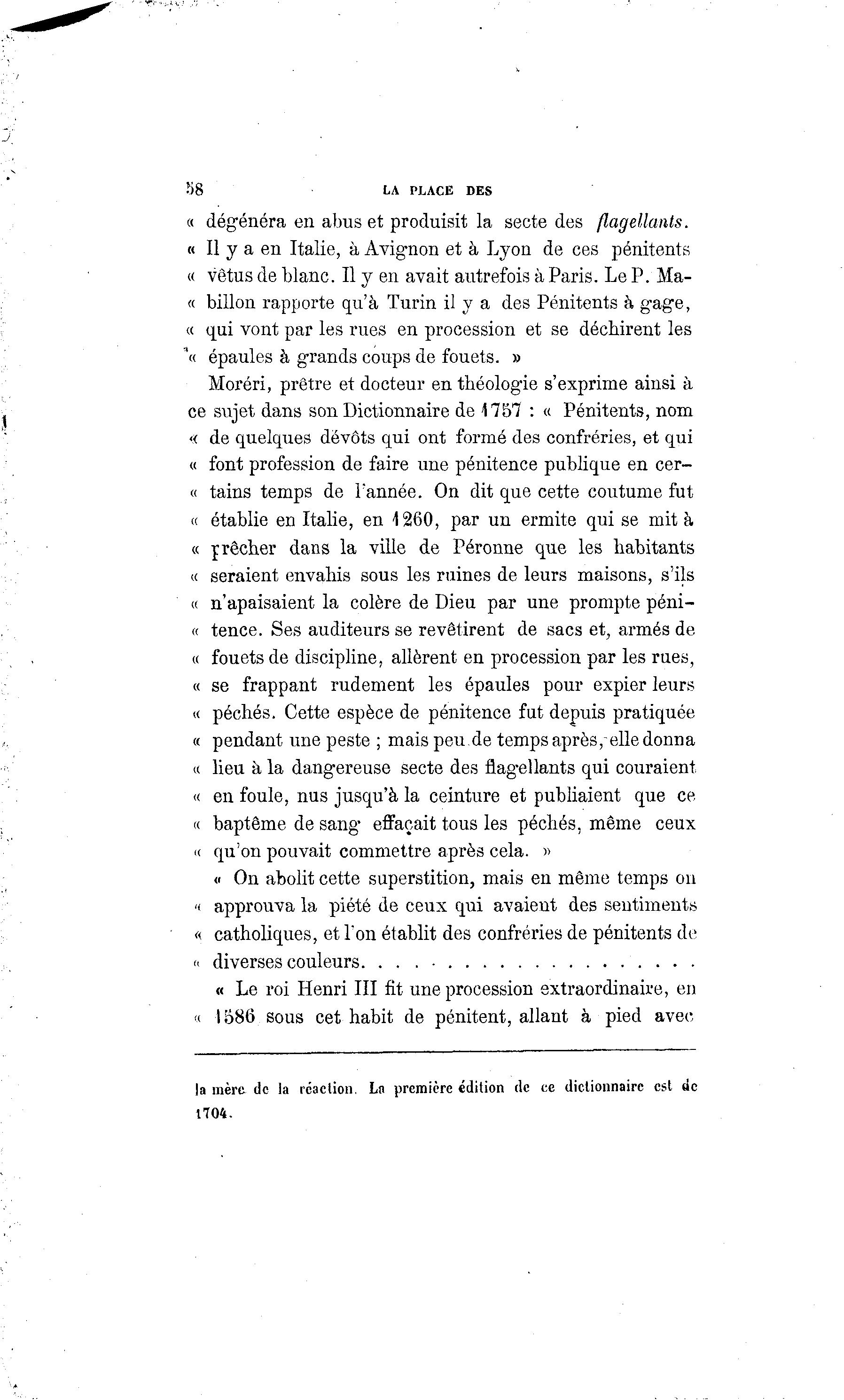 58 LA PLACE DES « dégénéra en abus et produisit la secte des flagellants. «Il y a en Italie, à Avignon et à Lyon de ces pénitents « vêtus de blanc. Il y en avait autrefois à Paris. Le P. Ma- te billon rapporte qu'à Turin il y a des Pénitents à gage, «qui vont par les rues en procession et se déchirent les '« épaules à grands coups de fouets. » Moréri, prêtre et docteur en théologie s'exprime ainsi à ce sujet dans son Dictionnaire de 1757 : « Pénitents, nom « de quelques dévots qui ont formé des confréries, et qui « font profession de faire une pénitence publique en cer- « tains temps de l'année. On dit que cette coutume fut « établie en Italie, en 1260, par un ermite qui se mit à « pêcher