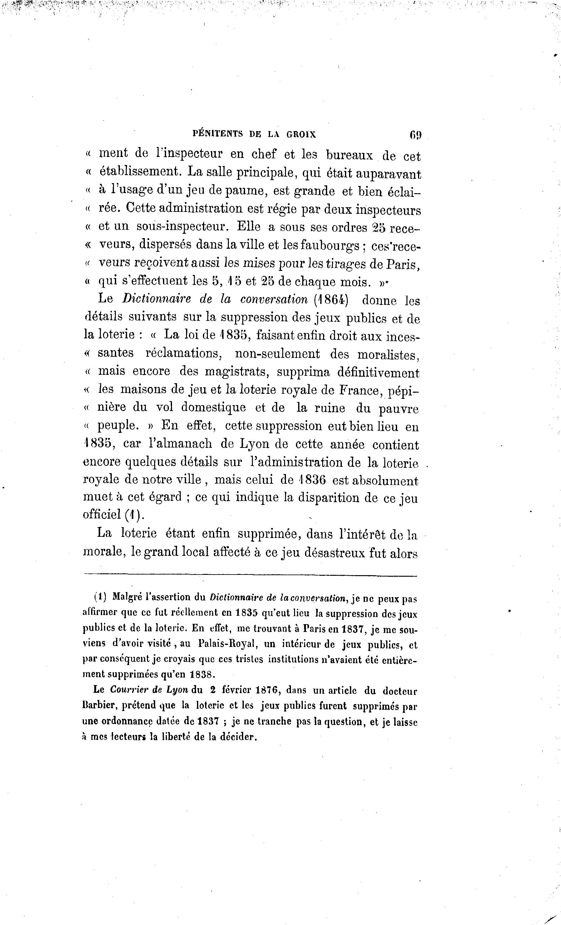 PÉNITENTS DE LA GR01X f>!) « ment de l'inspecteur en chef et les bureaux de cet « établissement. La salle principale, qui était auparavant « à l'usage d'un jeu de paume, est grande et bien éclai- « rée. Cette administration est régie par deux inspecteurs « et un sous-inspecteur. Elle a sous ses ordres 25 rece- « veurs, dispersés dans la ville et les faubourgs ; ces'rece- « veurs reçoivent aussi les mises pour les tirages de Paris, o qui s'effectuent les 5, \ 5 et 25 de chaque mois. »• Le Dictionnaire de la conversation (1864) donne les détails suivants sur la suppression des jeux publics et de la loterie : « La loi de 1835, faisant enfin droit aux inces- « santés réclamations, non-seulement des moralistes, a mais encore des magistrats, supprima définitivement « les maisons de jeu et la loterie royale de France, pépi- (( nière du vol domestique et de la ruine du pauvre « peuple. » En effet, cette suppression eut bien lieu en 1835, car l'almanach de Lyon de cette année contient encore quelques détails sur l'administration de la loterie royale de notre ville , mais celui de 1836 est absolument muet à cet égard ; ce qui indique la disparition de ce jeu officiel (1 ). La loterie étant enfin supprimée, dans l'intérêt de la morale, le grand local affecté à ce jeu désastreux fut alors (1) Malgré l'assertion du Dictionnaire de la conversation, je ne peux pas affirmer que ce fut réellement en 1835 qu'eut lieu la suppression des jeux publics et de la loterie. En effet, me trouvant à Taris en 1837, je me sou- viens d'avoir visite , au Palais-Royal, un intérieur de jeux publics, et par conséquent je croyais que ces tristes institutions n'avaient été entière- ment supprimées qu'en 1838. Le Courrier de Lyon du 2 février 1876, dans un article du docteur Barbier, prétend que la loterie et les jeux publics furent supprimés par une ordonnance datée de 1837 ; je ne tranche pas la question, et je laisse à mes lecteurs la liberté de la décider.