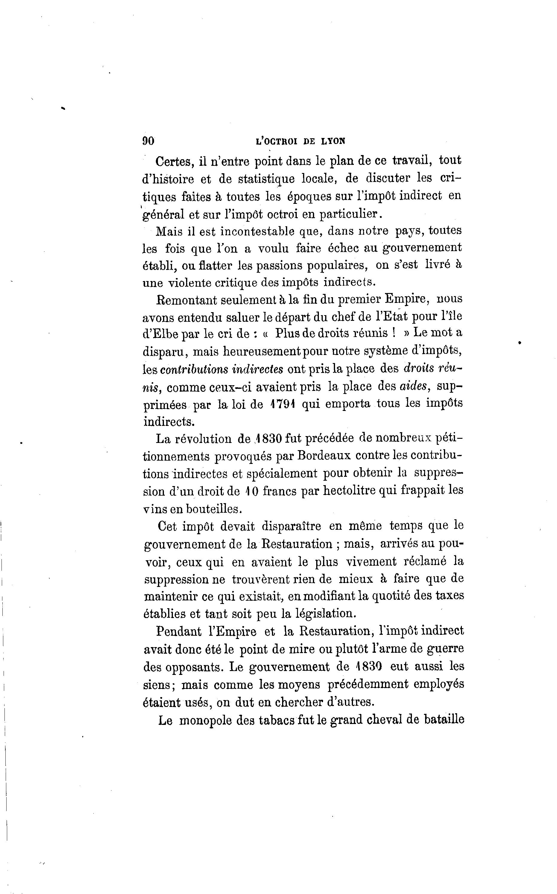 90 L'OCTROI DE LYON Certes, il n'entre point dans le plan de ce travail, tout d'histoire et de statistique locale, de discuter les cri- tiques faites à toutes les époques sur l'impôt indirect en général et sur l'impôt octroi en particulier. Mais il est incontestable que, dans notre pays, toutes les fois que Ton a voulu faire échec au gouvernement établi, ou natter les passions populaires, on s'est livré à une violente critique des impôts indirects. Remontant seulement à la fin du premier Empire, nous avons entendu saluer le départ du chef de l'Etat pour l'île d'Elbe par le cri de : « Plus de droits réunis ! » Le mot a disparu, mais heureusement pour notre système d'impôts, les contributions indirectes ont pris la place des droits réu- nis, comme ceux-ci avaient pris la place des aides, sup- primées par la loi de 4791 qui emporta tous les impôts indirects. La révolution de .1830 fut précédée de nombreux péti- tionnements provoqués par Bordeaux contre les contribu- tions indirectes et spécialement pour obtenir la suppres- sion d'un droit de 10 francs par hectolitre qui frappait les vins en bouteilles. Cet impôt devait disparaître en même temps que le gouvernement de la Restauration ; mais, arrivés au pou- voir, ceux qui en avaient le plus vivement réclamé la suppression ne trouvèrent rien de mieux à faire que de maintenir ce qui existait, en modifiant la quotité des taxes établies et tant soit peu la législation. Pendant l'Empire et la Restauration, l'impôt indirect avait donc été le point de mire ou plutôt l'arme de guerre des opposants. Le gouvernement de 4830 eut aussi les siens; mais comme les moyens précédemment employés étaient usés, on dut en chercher d'autres. Le monopole des tabacs fut le grand cheval de bataille