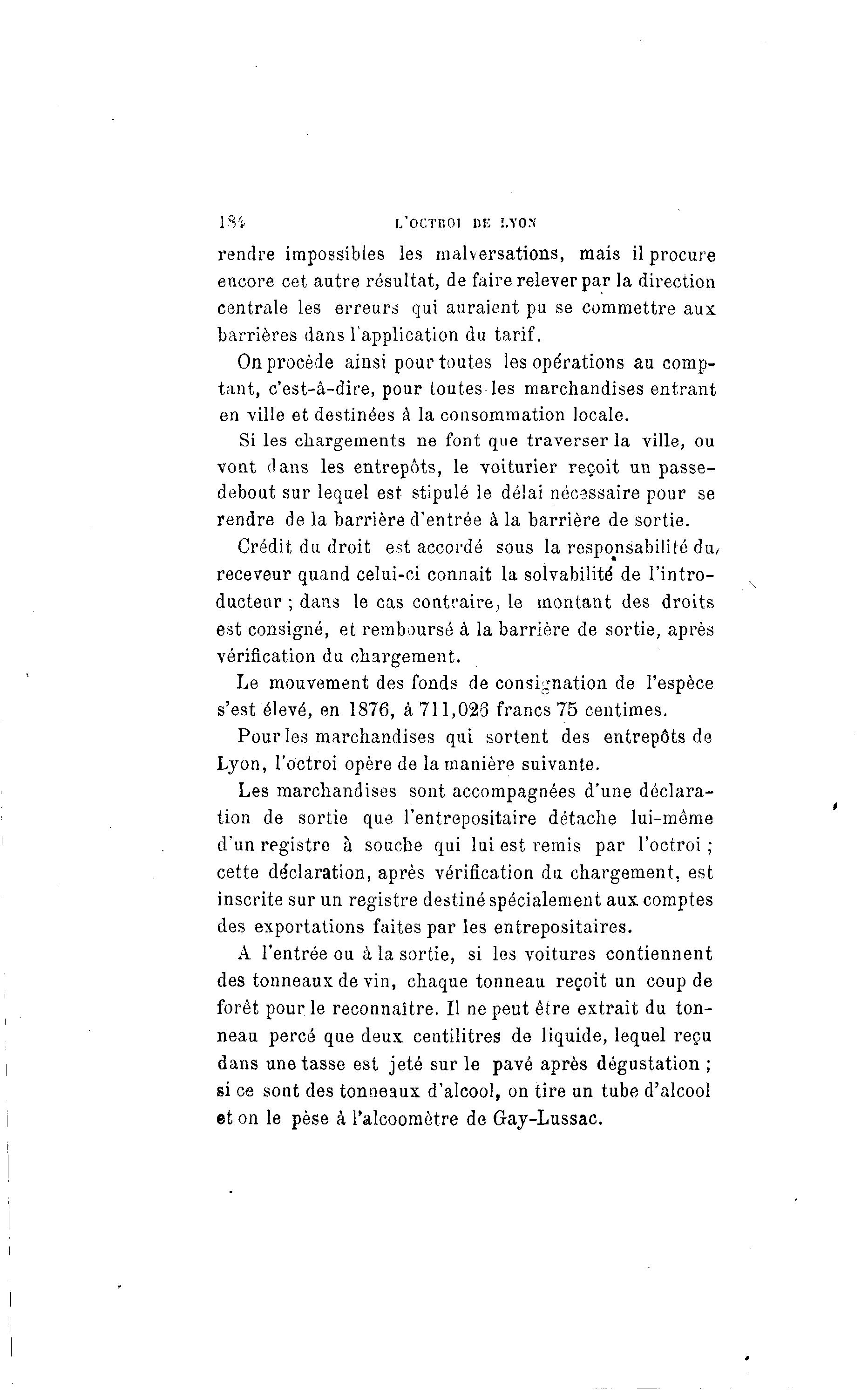 ISi L'OCTUOI DE Î.YO.\ rendre impossibles les malversations, mais il procure encore cet autre résultat, de faire relever par la direction centrale les erreurs qui auraient pu se commettre aux barrières dans l'application du tarif. On procède ainsi pour toutes les opérations au comp- tant, c'est-â-dire, pour toutes-les marchandises entrant en ville et destinées à la consommation locale. Si les chargements ne font que traverser la ville, ou vont dans les entrepôts, le voiturier reçoit un passe- debout sur lequel est stipulé le délai nécessaire pour se rendre de la barrière d'entrée à la barrière de sortie. Crédit, du droit est accordé sous la responsabilité du/ receveur quand celui-ci connait la solvabilité de l'intro- ducteur ; dans le cas contraire, le montant des droits est consigné, et remboursé à la barrière de sortie, après vérification du chargement. Le mouvement des fonds de consignation de l'espèce s'est élevé, en 1876, à 711,028 francs 75 centimes. Pour les marchandises qui sortent des entrepôts de Lyon, l'octroi opère de la manière suivante. Les marchandises sont accompagnées d'une déclara- tion de sortie que l'entrepositaire détache lui-même d'un registre à souche qui lui est remis par l'octroi ; cette déclaration, après vérification du chargement, est inscrite sur un registre destiné spécialement aux comptes des exportations faites par les entrepositaires. A l'entrée ou à la sortie, si les voitures contiennent des tonneaux de vin, chaque tonneau reçoit un coup de forêt pour le reconnaître. Il ne peut être extrait du ton- neau percé que deux centilitres de liquide, lequel reçu dans une tasse est jeté sur le pavé après dégustation ; si ce sont des tonneaux d'alcool, on tire un tube d'alcool et on le pèse à l'alcoomètre de Gay-Lussac.