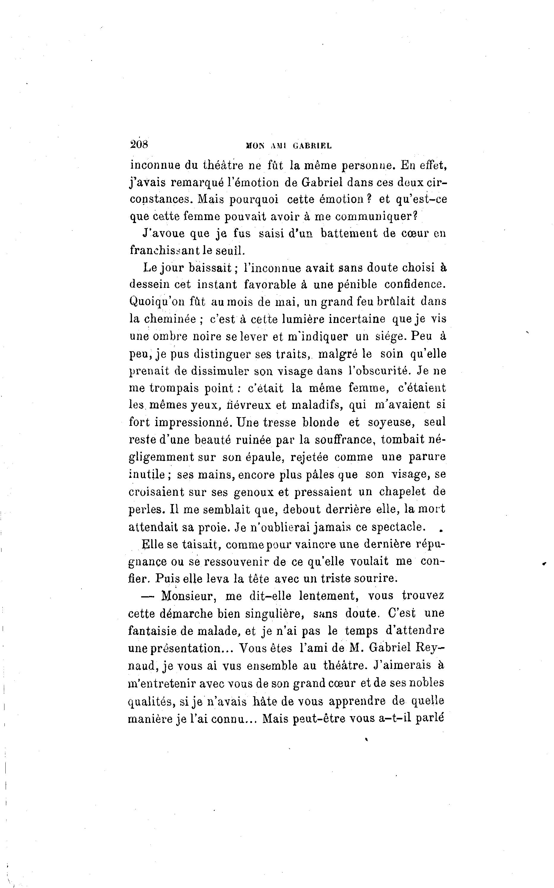 208 MON AMI GABRIEL inconnue du théâtre ne fût la même personne. En effet, j'avais remarqué l'émotion de Gabriel dans ces deux cir- constances. Mais pourquoi cette émotion ? et qu'est-ce que cette femme pouvait avoir à me communiquer? J'avoue que je fus saisi d'un battement de cœur en franchissant le seuil. Le jour baissait; l'inconnue avait sans doute choisi à dessein cet instant favorable à une pénible confidence. Quoiqu'on fût au mois de mai, un grand feu brûlait dans la cheminée ; c'est à cette lumière incertaine que je vis une ombre noire se lever et m'indiquer un siège. Peu à peu, je pus distinguer ses traits, malgré le soin qu'elle prenait de dissimuler son visage dans l'obscurité. Je ne me trompais point : c'était la même femme, c'étaient les mêmes yeux, fiévreux et maladifs, qui m'avaient si fort impressionné. Une tresse blonde et soyeuse, seul reste d'une beauté ruinée par la souffrance, tombait né- gligemment sur son épaule, rejetée comme une parure inutile ; ses mains, encore plus pâles que son visage, se croisaient sur ses genoux et pressaient un chapelet de perles. Il me semblait que, debout derrière elle, la mort attendait sa proie. Je n'oublierai jamais ce spectacle. . Elle se taisait, comme pour vaincre une dernière répu- gnance ou se ressouvenir de ce qu'elle voulait me con- fier. Puis elle leva la tête avec un triste sourire. — Monsieur, me dit-elle lentement, vous trouvez cette démarche bien singulière, sans doute. C'est une fantaisie de malade, et je n'ai pas le temps d'attendre une présentation... Vous êtes l'ami de M. Gabriel Rey- naud, je vous ai vus ensemble au théâtre. J'aimerais à m'entretenir avec vous de son grand cœur et de ses nobles qualités, si je n'avais hâte de vous apprendre de quelle manière je l'ai connu... Mais peut-être vous a-t-il parlé