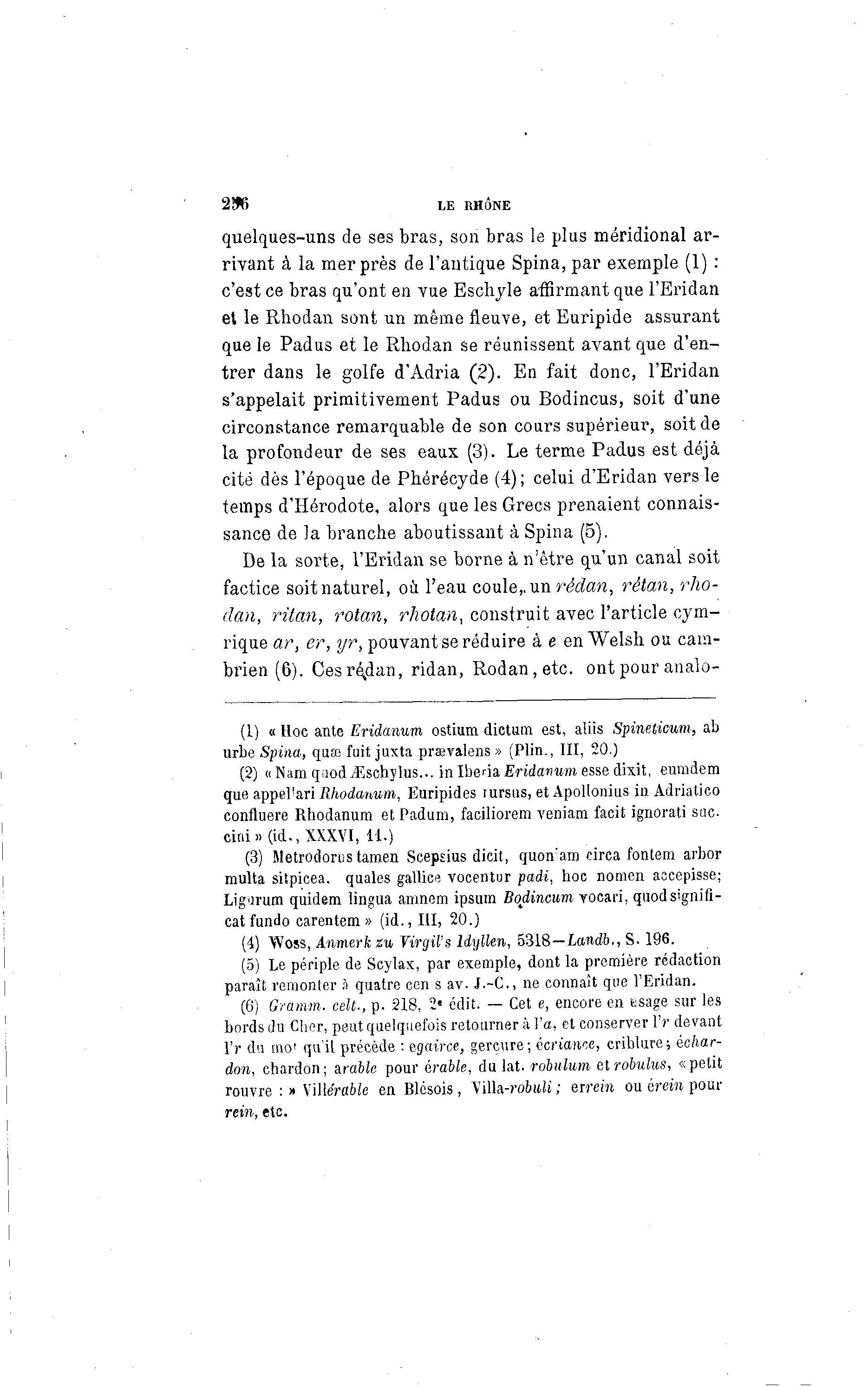 2!*5 LE RHÔNE quelques-uns de ses bras, son bras le plus méridional ar- rivant à la mer près de l'antique Spina, par exemple (1) : c'est ce bras qu'ont en vue Eschyle affirmant que l'Eridan et le Rhodan sont un même fleuve, et Euripide assurant que le Padus et le Rhodan se réunissent avant que d'en- trer dans le golfe d'Adria (2). En fait donc, l'Eridan s'appelait primitivement Padus ou Bodincus, soit d'une circonstance remarquable de son cours supérieur, soit de la profondeur de ses eaux (3). Le terme Padus est déjà cité dès l'époque de Phérécyde (4); celui d'Eridan vers le temps d'Hérodote, alors que les Grecs prenaient connais- sance de la branche aboutissant à Spina (5). De la sorte, l'Eridan se borne à n'être qu'un canal soit factice soitnaturel, où l'eau coule,.unrédan, rétan, rho- dan, ritan, rotan, rhotan, construit avec l'article cym- rique ar, er, yr, pouvant se réduire à e en Welsh ou cam- brien (6). Cesré\dan, ridan, Rodan,etc. ont pour analo- (1) « Hoc ante Eridanum ostium dictum est, aliis Spineticum, ab urbe Spina, quse fuit juxta praevalens » (Plin., III, 20.) (2) «NamquodJEschylus... in Ibena Endawttm esse dhrit, eumdem que appel!ari Rhodanum, Euripides rursus, et Apollonius in Adriatico confluere Rhodanum et Padum, faciliorem veniam facit ignorati suc. cini»(id., XXXVI, 11.) (3) Metrodorustamen Scepsius dicit, quon;aro circa fontem arbor multa sitpicea. quales gallice vocentur padi, hoc nomen accepisse; Lig'irum quidem lingua amnem ipsum Bodincum vocari, quodsignifi- catfundo carentem» (id., III, 20.) (4) Woss, Anmerk 2u Virgil's ldyllen, 5318—Landb., S. 196. (5) Le périple de Scylax, par exemple, dont la première rédaction paraît remonter à quatre cen s av. J . - C , ne connaît que l'Eridan. (6) Gramm. celt-, p. 218, 2< édit. — Cet e, encore en esage sur les bords du Cher, peut quelquefois retourner à l'a, et conserver 1')' devant Yr do mo' qu'il précède : egairce, gerçure; écriawc, criblure; êchar- don, chardon; arable pour érable, du lat. robulum elrobuhts, «petit rouvre : » S'ùlérable en Blcsois, villa-ro&itïi ; errem ou érein pour rein, etc.