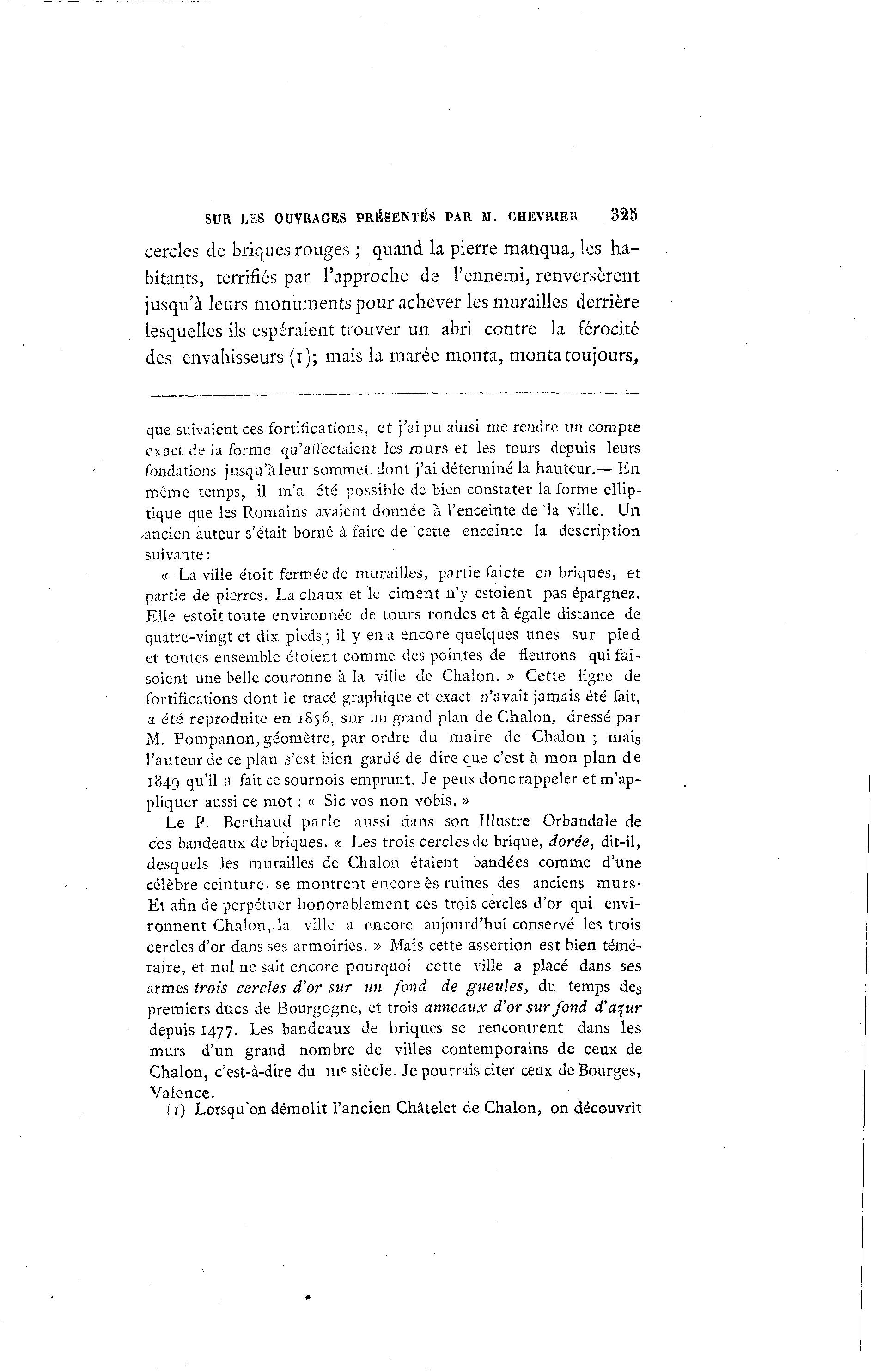 SUR LES OUVRAGES PRÉSENTÉS PAR M. CHEVRTEU 328 cercles de briques rouges ; quand la pierre manqua, les ha- bitants, terrifiés par l'approche de l'ennemi, renversèrent jusqu'à leurs monuments pour achever les murailles derrière lesquelles ils espéraient trouver un abri contre la férocité des envahisseurs (i); mais la marée monta, monta toujours, que suivaient ces fortifications, et j'ai pu ainsi me rendre un compte exact de ia forme qu'affectaient les murs et les tours depuis leurs fondations jusqu'à lenr sommet, dont j'ai déterminé la hauteur.— En même temps, il m'a été possible de bien constater la forme ellip- tique que les Romains avaient donnée à l'enceinte de 'la ville. Un .ancien auteur s'était borné à faire de cette enceinte la description suivante : « La ville étoit fermée de murailles, partie faicte en briques, et partie de pierres. La chaux et le ciment n'y estoient pas épargnez. Elle estoit toute environnée de tours rondes et à égale distance de quatre-vingt et dix pieds ; il y en a encore quelques unes sur pied et toutes ensemble étoient comme des pointes de fleurons qui fai- soient une belle couronne à la ville de Chaion. » Cette ligne de fortifications dont le tracé graphique et exact n'avait jamais été fait, a été reproduite en 1856, sur un grand plan de Chaion, dressé par M. Pompanon, géomètre, par ordre du maire de Chaion; mais l'auteur de ce plan s'est bien gardé de dire que c'est à mon plan de 1849 qu'il a fait ce sournois emprunt. Je peux donc rappeler et m'ap- pliquer aussi ce mot : « Sic vos non vobis. » Le P. Berthaud parle aussi dans son Illustre Orbandale de ces bandeaux de briques. « Les trois cercles de brique, dorée, dit-il, desquels les murailles de Chaion étaient bandées comme d'une célèbre ceinture, se montrent encore es ruines des anciens murs- Et afin de perpétuer honorablement ces trois cercles d'or qui envi- ronnent Chaion, la ville a encore aujourd'hui conservé les trois cercles d'or dans ses armoiries. » Mais cette assertion est bien témé- raire, et nul ne sait encore pourquoi cette ville a placé dans ses armes trois cercles d'or sur un fond de gueules, du temps de s premiers ducs de Bourgogne, et trois anneaux d'or sur fond d'azur depuis 1477. Les bandeaux de briques se rencontrent dans les murs d'un grand nombre de villes contemporains de ceux de Chaion, c'est-à -dire du m c siècle. Je pourrais citer ceux de Bourges, Valence. (1) Lorsqu'on démolit l'ancien Chà telet de Chaion, on découvrit