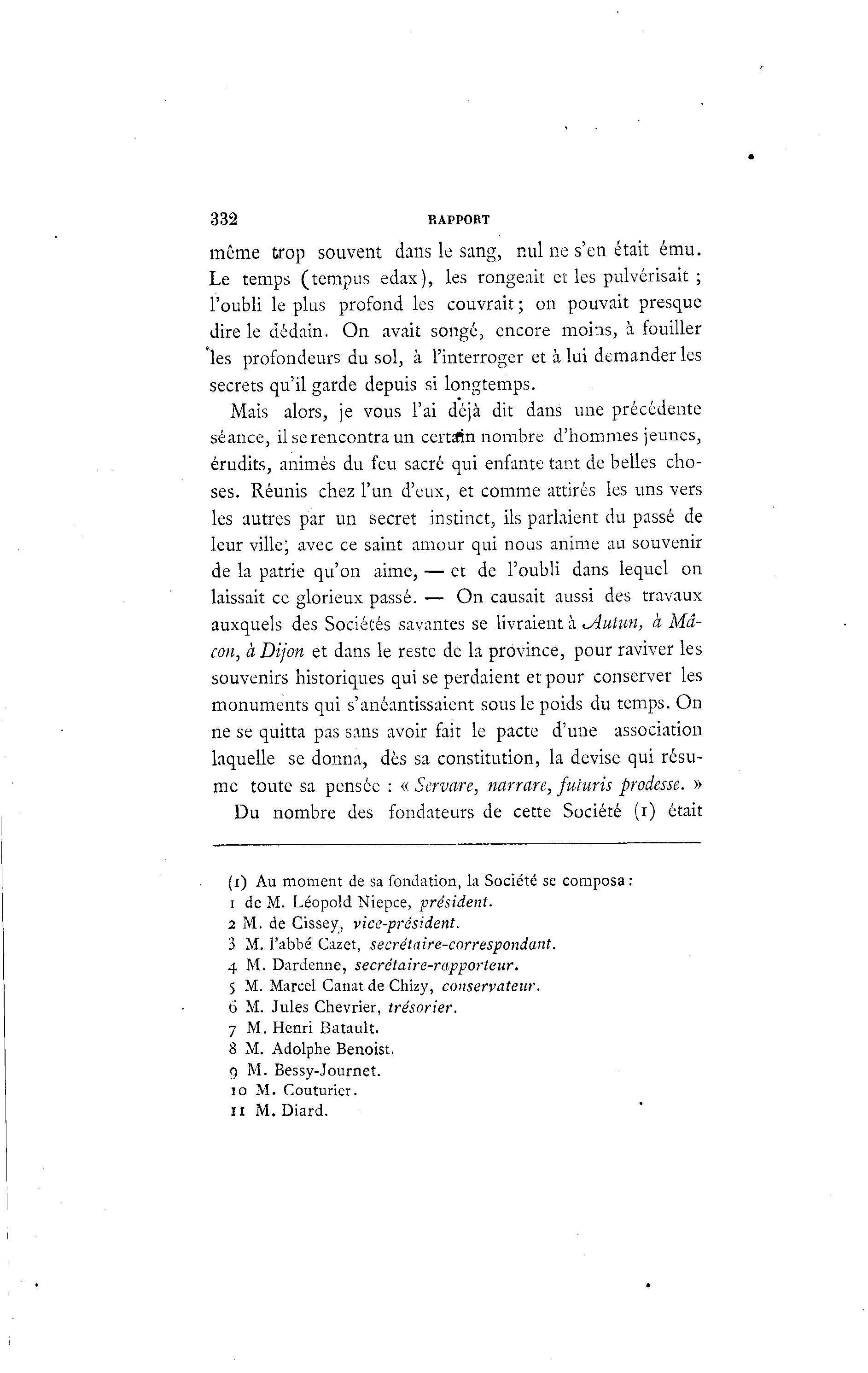 332 RAPPORT même trop souvent dans le sang, nul ne s'en était ému. Le temps (tempus edax), les rongeait et les pulvérisait ; l'oubli le plus profond les couvrait ; on pouvait presque dire le dédain. On avait songé, encore moins, à fouiller les profondeurs du sol, à l'interroger et à lui demander les secrets qu'il garde depuis si longtemps. Mais alors, je vous l'ai déjà dit dans une précédente séance, il se rencontra un certsfin nombre d'hommes jeunes, érudits, animés du feu sacré qui enfante tant de belles cho- ses. Réunis chez l'un d'eux, et comme attirés les uns vers les autres par un secret instinct, ils parlaient du passé de leur ville; avec ce saint amour qui nous anime au souvenir de la patrie qu'on aime, — et de l'oubli dans lequel on laissait ce glorieux passé. — On causait aussi des travaux auxquels des Sociétés savantes se livraient à lAutun, à Ma- çon, à Dijon et dans le reste de la province, pour raviver les souvenirs historiques qui se perdaient et pour conserver les monuments qui s'anéantissaient sous le poids du temps. On ne se quitta pas sans avoir fait le pacte d'une association laquelle se donna, dès sa constitution, la devise qui résu- me toute sa pensée : « Servare, narrare, fuluris prodesse. » Du nombre des fondateurs de cette Société (i) était (i) Au moment de sa fondation, la Société se composa : i de M. Léopold Niepce, président. 2 M. de Cissey, vies-président. 3 M. l'abbé Cazet, secrétaire-correspondant. 4 M. Dardenne, secrétaire-rapporteur. $ M. Marcel Canat de Chizy, conservateur. 6 M. Jules Chevrier, trésorier. 7 M. Henri Batault. 8 M. Adolphe Benoist. g M. Bessy-Journet. io M. Couturier. il M. Diard.