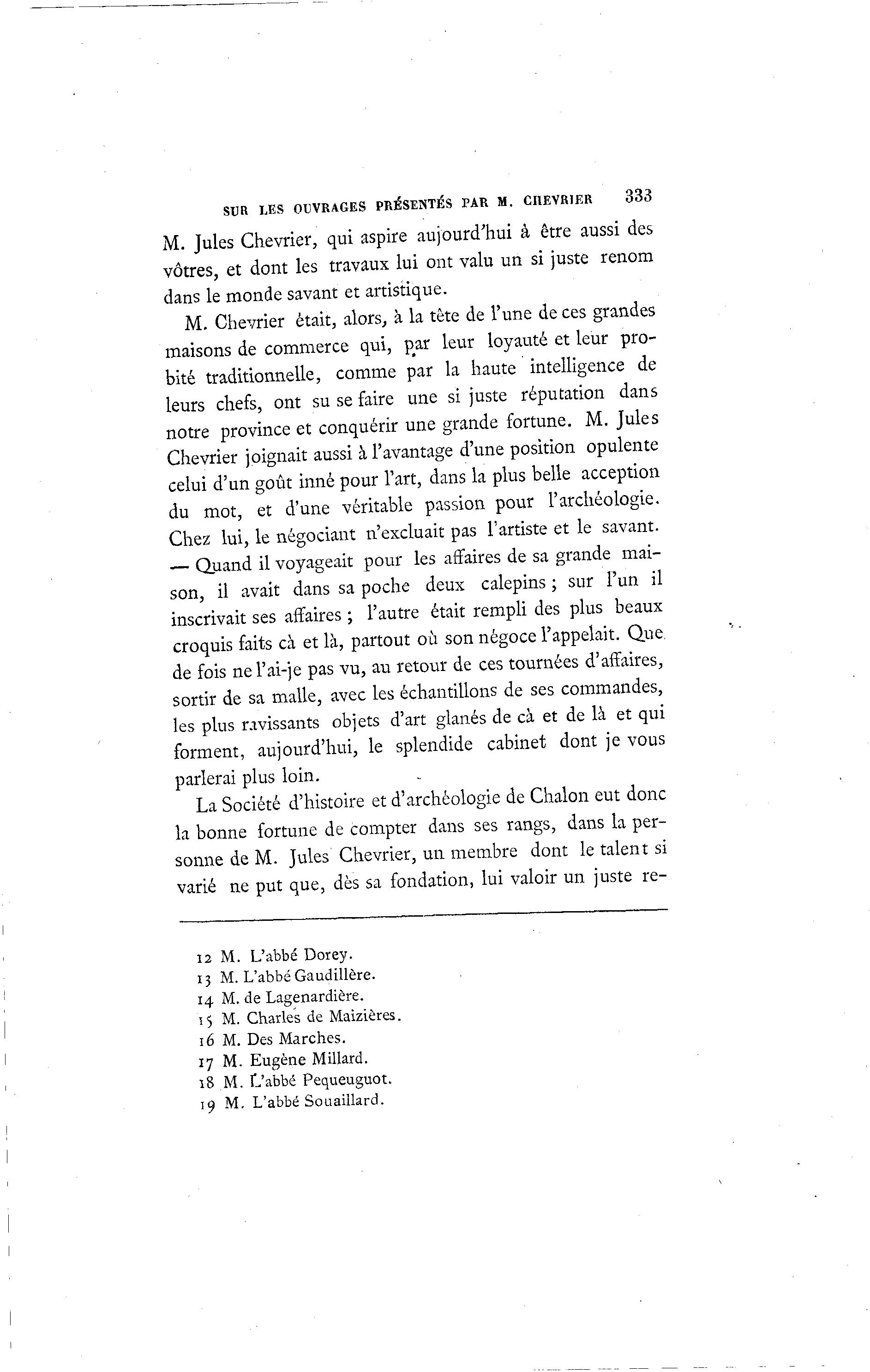 SUR LES OUVRAGES PRÉSENTÉS PAR M. CIIEVRIER 333 M. Jules Chevrier, qui aspire aujourd'hui à être aussi des vôtres, et dont les travaux lui ont valu un si juste renom dans le monde savant et artistique. M. Chevrier était, alors, à la tète de l'une de ces grandes maisons de commerce qui, p_ar leur loyauté et leur pro- bité traditionnelle, comme par la haute intelligence de leurs chefs, ont su se faire une si juste réputation dans notre province et conquérir une grande fortune. M. Jules Chevrier joignait aussi à l'avantage d'une position opulente celui d'un goût inné pour l'art, dans la plus belle acception du mot, et d'une véritable passion pour l'archéologie. Chez lui, le négociant n'excluait pas l'artiste et le savant. — Quand il voyageait pour les affaires de sa grande mai- son, il avait dans sa poche deux calepins ; sur l'un il inscrivait ses affaires ; l'autre était rempli des plus beaux croquis faits cà et là , partout où son négoce l'appelait. Que, de fois nel'ai-je pas vu, au retour de ces tournées d'affaires, sortir de sa malle, avec les échantillons de ses commandes, les plus ravissants objets d'art glanés de cà et de là et qui forment, aujourd'hui, le splendide cabinet dont je vous parlerai plus loin. La Société d'histoire et d'archéologie de Chalon eut donc la bonne fortune de compter dans ses rangs, dans la per- sonne de M. Jules Chevrier, un membre dont le talent si varié ne put que, dès sa fondation, lui valoir un juste re- 12 M. L'abbé Dorey. 13 M. L'abbé Gaudillère. 14 M. de Lagenardière. Î$ M. Charles de Maizières. 16 M. Des Marches. 17 M. Eugène Millard. 18 M. L'abbé Pequeuguot. 19 M. L'abbé Souaillard.