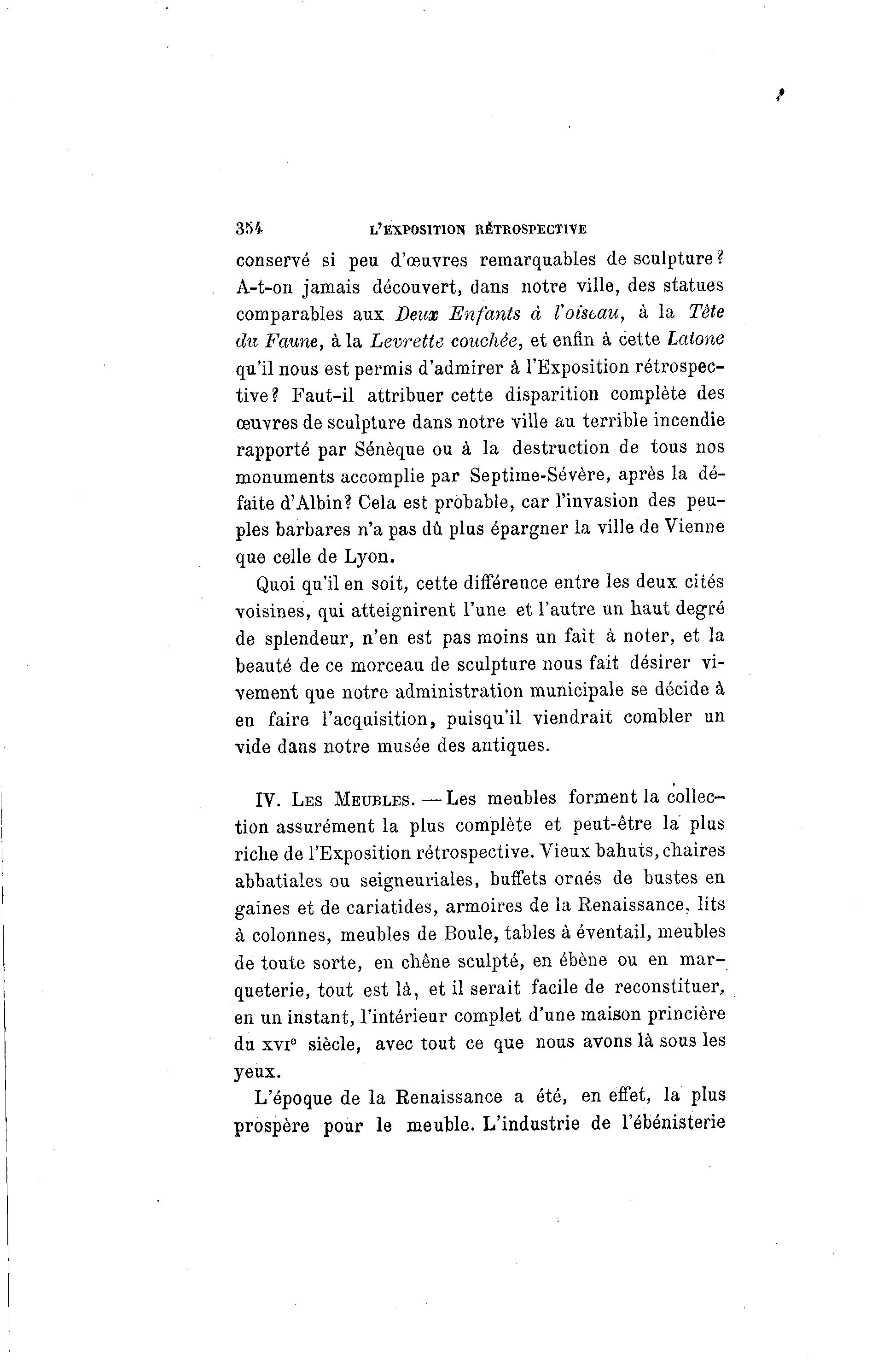 / 354 L'EXPOSITION RÉTROSPECTIVE conservé si peu d'œuvres remarquables de sculpture ? A-t-on jamais découvert, dans notre ville, des statues comparables aux Deux Enfants à l'oiseau, à la Tête du Faune, à la Levrette couchée, et enfin à cette Latone qu'il nous est permis d'admirer à l'Exposition rétrospec- tive ? Faut-il attribuer cette disparition complète des œuvres de sculpture dans notre ville au terrible incendie rapporté par Sénèque ou à la destruction de tous nos monuments accomplie par Septime-Sévère, après la dé- faite d'Albin? Cela est probable, car l'invasion des peu- ples barbares n'a pas dû plus épargner la ville de Vienne que celle de Lyon. Quoi qu'il en soit, cette différence entre les deux cités voisines, qui atteignirent l'une et l'autre un haut degré de splendeur, n'en est pas moins un fait à noter, et la beauté de ce morceau de sculpture nous fait désirer vi- vement que notre administration municipale se décide à en faire l'acquisition, puisqu'il viendrait combler un vide dans notre musée des antiques. IV. LES MEUBLES.—Les meubles forment la collec- tion assurément la plus complète et peut-être la plus riche de l'Exposition rétrospective. Vieux bahuts, chaires abbatiales ou seigneuriales, buffets ornés de bustes en gaines et de cariatides, armoires de la Renaissance, lits à colonnes, meubles de Boule, tables à éventail, meubles de toute sorte, en chêne sculpté, en ébène ou en mar- queterie, tout est là , et il serait facile de reconstituer, en un instant, l'intérieur complet d'une maison princière du xvie siècle, avec tout ce que nous avons là sous les yeux. L'époque de la Renaissance a été, en effet, la plus prospère pour le meuble. L'industrie de l'ébénisterie