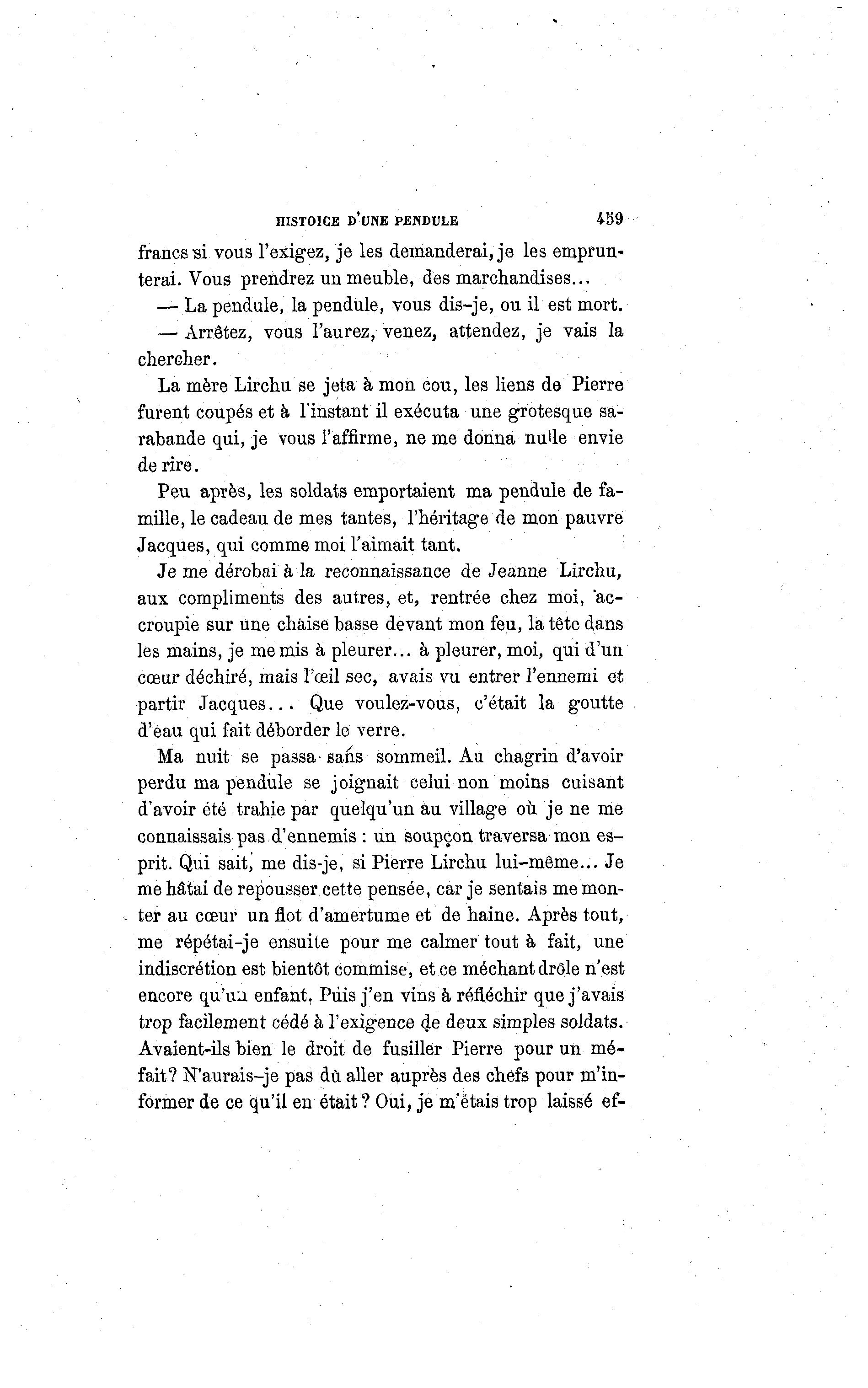 HISTOICE D'UNE PENDULE 459 francs si vous l'exigez, je les demanderai, je les emprun- terai. Vous prendrez un meuble, des marchandises... — La pendule, la pendule, vous dis-je, ou il est mort. — Arrêtez, vous l'aurez, venez, attendez, je vais la chercher. La mère Lirchu se jeta à mon cou, les liens de Pierre furent coupés et à l'instant il exécuta une grotesque sa- rabande qui, je vous l'affirme, ne me donna nu'le envie de rire. Peu après, les soldats emportaient ma pendule de fa- mille, le cadeau de mes tantes, l'héritage de mon pauvre Jacques, qui comme moi l'aimait tant. Je me dérobai à la reconnaissance de Jeanne Lirchu, aux compliments des autres, et, rentrée chez moi, "ac- croupie sur une chaise basse devant mon feu, la tête dans les mains, je me mis à pleurer... h pleurer, moi, qui d'un cœur déchiré, mais l'œil sec, avais vu entrer l'ennemi et partir Jacques... Que voulez-vous, c'était la goutte d'eau qui fait déborder le verre. Ma nuit se passa sans sommeil. Au chagrin d'avoir perdu ma pendule se joignait celui non moins cuisant d'avoir été trahie par quelqu'un au village où je ne me connaissais pas d'ennemis : un soupçon traversa mon es- prit. Qui saitj me dis-je, si Pierre Lirchu lui-même... Je me hâtai de repousser cette pensée, car je sentais me mon- ter au cœur un flot d'amertume et de haine. Après tout, me répétai-je ensuite pour me calmer tout à fait, une indiscrétion est bientôt commise, et ce méchant drôle n'est encore qu'un enfant. Puis j'en vins à réfléchir que j'avais trop facilement cédé à l'exigence de deux simples soldats. Avaient-ils bien le droit de fusiller Pierre pour un mé- fait? N'aurais-je pas dû aller auprès des chefs pour m'in- former de ce qu'il en était ? Oui, je m'étais trop laissé ef-