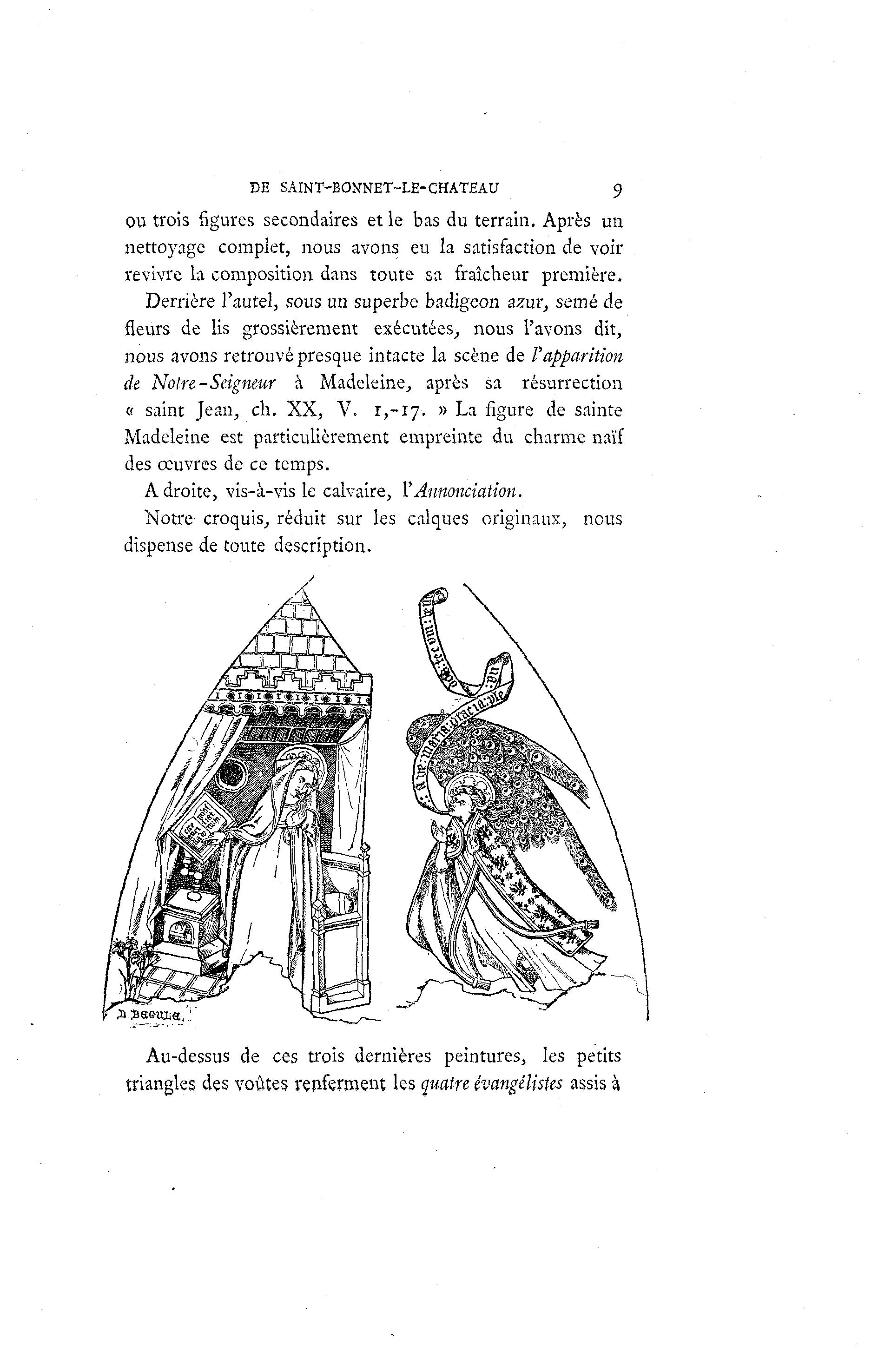 DE SAINT-BONNET-LE-CHATEAU 9 ou trois figures secondaires et le bas du terrain. Après un nettoyage complet, nous avons eu la satisfaction de voir revivre la composition dans toute sa fraîcheur première. Derrière l'autel, sous un superbe badigeon azur, semé de fleurs de lis grossièrement exécutées, nous l'avons dit, nous avons retrouvé presque intacte la scène de Vapparition de Notre-Seigneur à Madeleine, après sa résurrection « saint Jean, ch. XX, V. 1,-17. » La figure de sainte Madeleine est particulièrement empreinte du charme naïf des Å“uvres de ce temps. Adroite, vis-à -vis le calvaire, l'Annonciation. Notre croquis, réduit sur les calques originaux, nous dispense de toute description. Au-dessus de ces trois dernières peintures, les petits triangles des voûtes renferment les quatre évangêlistes assis Ã