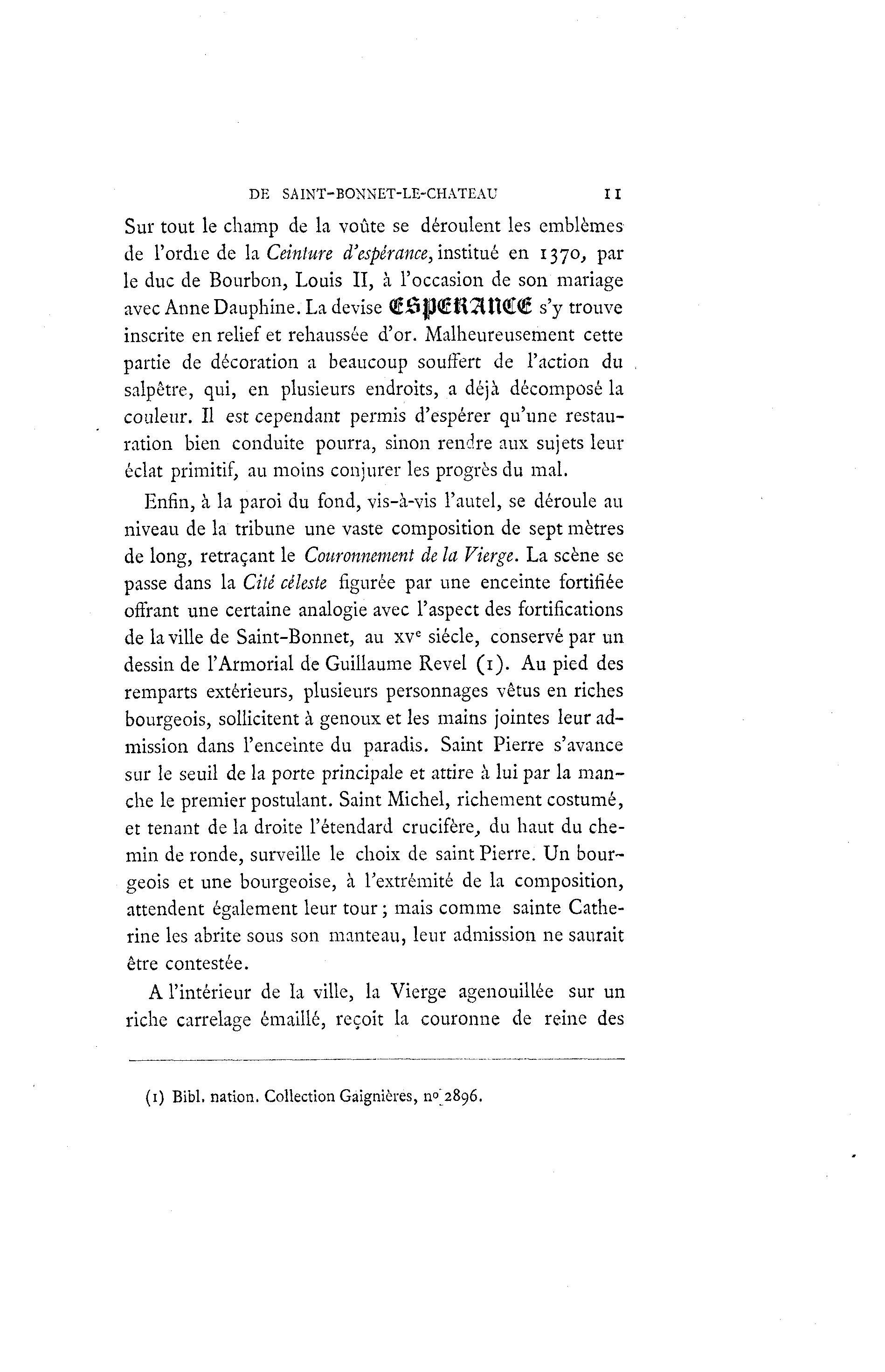DE SAINT-BONNET-LE-CHATEAU II Sur tout le champ de la voûte se déroulent les emblèmes de l'ordie de la Ceinture d'espèrance,'vastixak en 1370, par le duc de Bourbon, Louis II, à l'occasion de son mariage avec Anne Dauphine. La devise €Ô$)€H2U s'y trouve inscrite en relief et rehaussée d'or. Malheureusement cette partie de décoration a beaucoup souffert de l'action du salpêtre, qui, en plusieurs endroits, a déjà décomposé la couleur. Il est cependant permis d'espérer qu'une restau- ration bien conduite pourra, sinon rendre aux sujets leur éclat primitif, au moins conjurer les progrès du mal. Enfin, à la paroi du fond, vis-à -vis l'autel, se déroule au niveau de la tribune une vaste composition de sept mètres de long, retraçant le Couronnement de la Vierge. La scène se passe dans la Cité céleste figurée par une enceinte fortifiée offrant une certaine analogie avec l'aspect des fortifications de la ville de Saint-Bonnet, au xve siècle, conservé par un dessin de l'Armoriai de Guillaume Revel (1). Au pied des remparts extérieurs, plusieurs personnages vêtus en riches bourgeois, sollicitent à genoux et les mains jointes leur ad- mission dans l'enceinte du paradis. Saint Pierre s'avance sur le seuil de la porte principale et attire à lui par la man- che le premier postulant. Saint Michel, richement costumé, et tenant de la droite l'étendard crucifère, du haut du che- min de ronde, surveille le choix de saint Pierre. Un bour- geois et une bourgeoise, à l'extrémité de la composition, attendent également leur tour ; mais comme sainte Cathe- rine les abrite sous son manteau, leur admission ne saurait être contestée. A l'intérieur de la ville, la Vierge agenouillée sur un riche carrelage êmaillé, reçoit la couronne de reine des (1) Bibl, nation. Collection Gaignières, 11^2896.