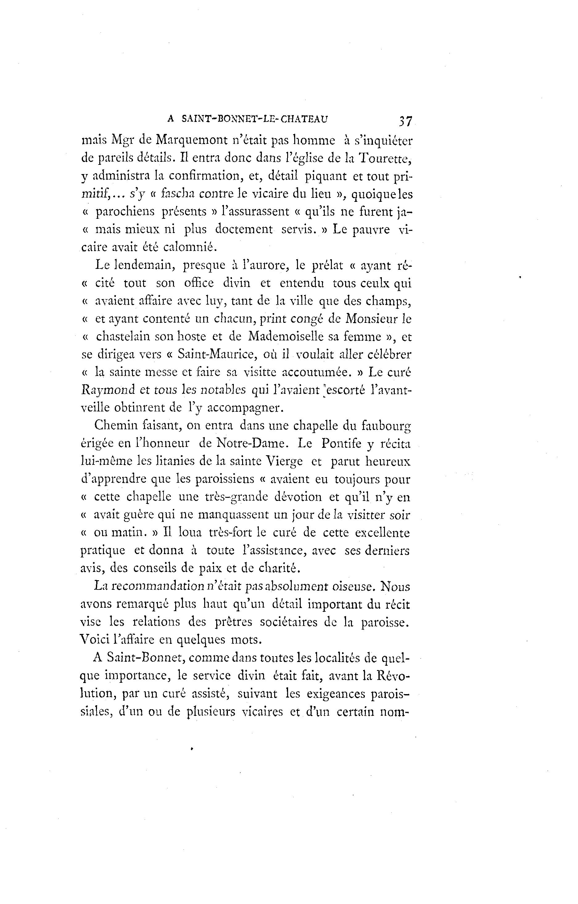 A SAINT-BONNET-LE- CHATEAU 37 mais Mgr de Marquemont n'était pas homme à s'inquiéter de pareils détails. Il entra donc dans l'église de la Tourette, y administra la confirmation, et, détail piquant et tout pri- mitif, ... s'y « fascha contre le vicaire du lieu », quoique les « parochiens présents » l'assurassent « qu'ils ne furent ja- « mais mieux ni plus doctement servis. » Le pauvre vi- caire avait été calomnié. Le lendemain, presque à l'aurore, le prélat « ayant ré- « cité tout son office divin et entendu tous ceulx qui « avaient affaire avec luy, tant de la ville que des champs, « et ayant contenté un chacun, print congé de Monsieur le « chastelain son hoste et de Mademoiselle sa femme », et se dii'igea vers « Saint-Maurice, où il voulait aller célébrer « la sainte messe et faire sa visitte accoutumée. » Le curé Raymond et tous les notables qui l'avaient 'escorté l'avant- veille obtinrent de l'y accompagner. Chemin faisant, on entra dans une chapelle du faubourg érigée en l'honneur de Notre-Dame. Le Pontife y récita lui-même les litanies de la sainte Vierge et parut heureux d'apprendre que les paroissiens « avaient eu toujours pour « cette chapelle une très-grande dévotion et qu'il n'y en « avait guère qui ne manquassent un jour de la visitter soir « ou matin. » Il loua très-fort le curé de cette excellente pratique et donna à toute l'assistance, avec ses derniers avis, des conseils de paix et de charité. La recommandation n'était pas absolument oiseuse. Nous avons remarqué plus haut qu'un détail important du récit vise les relations des prêtres sociétaires de la paroisse. Voici l'affaire en quelques mots. A Saint-Bonnet, comme dans toutes les localités de quel- que importance, le service divin était fait, avant la Révo- lution, par un curé assisté, suivant les exigeances parois- siales, d'un ou de plusieurs vicaires et d'un certain nom-