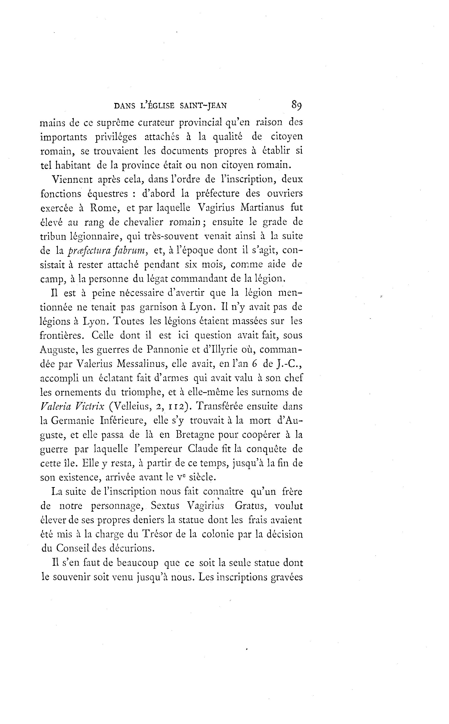 DANS L'ÉGLISE SAINT-JEAN 89 mains de ce suprême curateur provincial qu'en raison des importants privilèges attachés à la qualité de citoyen romain, se trouvaient les documents propres à établir si tel habitant de la province était ou non citoyen romain. Viennent après cela, dans l'ordre de l'inscription, deux fonctions équestres : d'abord la préfecture des ouvriers exercée à Rome, et par laquelle Vagirius Martianus fut élevé au rang de chevalier romain ; ensuite le grade de tribun légionnaire, qui très-souvent venait ainsi à la suite de la prœfectura fabrum, et, à l'époque dont il s'agit, con- sistait à rester attaché pendant six mois,, comme aide de camp, à la personne du légat commandant de la légion. Il est à peine nécessaire d'avertir que la légion men- tionnée ne tenait pas garnison à Lyon. Il n'y avait pas de légions à Lyon. Toutes les légions étaient massées sur les frontières. Celle dont il est ici question avait fait, sous Auguste, les guerres de Pannonie et d'Illyrie où, comman- dée par Valerius Messalinus, elle avait, en l'an 6 de J . - C , accompli un éclatant fait d'armes qui avait valu à son chef les ornements du triomphe, et à elle-même les surnoms de Vakria Victrix (Velleius, 2, 112). Transférée ensuite dans la Germanie Inférieure, elle s'y trouvait à la mort d'Au- guste, et elle passa de là en Bretagne pour coopérer à la guerre par laquelle l'empereur Claude fit la conquête de cette île. Elle y resta, à partir de ce temps, jusqu'à la fin de son existence, arrivée avant le ve siècle. La suite de l'inscription nous fait connaître qu'un frère de notre personnage, Sextus Vagirius Gratus, voulut élever de ses propres deniers la statue dont les frais avaient été mis à la charge du Trésor de la colonie par la décision du Conseil des décurions. Il s'en faut de beaucoup que ce soit la seule statue dont le souvenir soit venu jusqu'à nous. Les inscriptions gravées