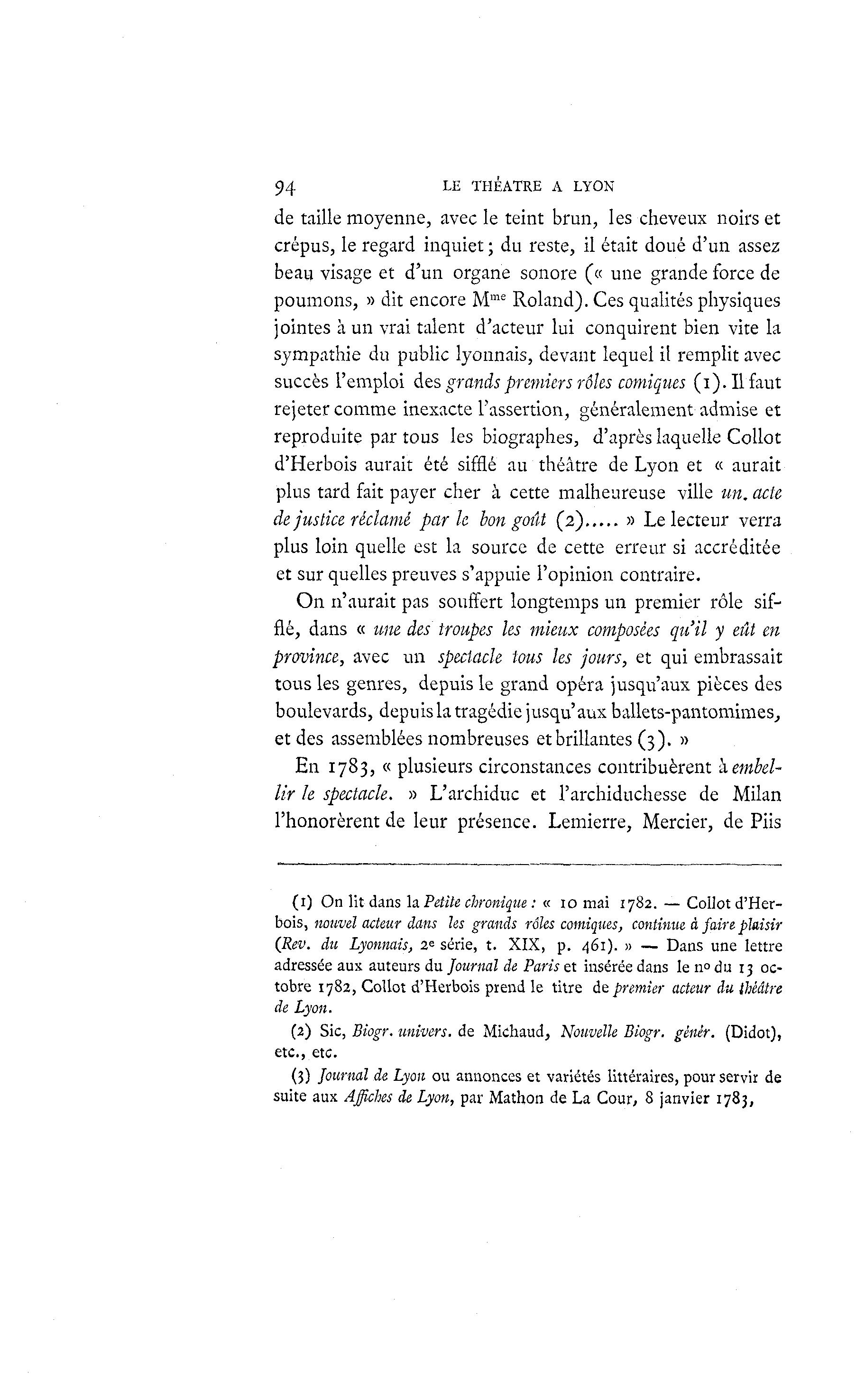 94 LE THÉÂTRE A LYON de taille moyenne, avec le teint brun, les cheveux noirs et crépus, le regard inquiet ; du reste, il était doué d'un assez beau visage et d'un organe sonore (« une grande force de poumons, » dit encore Mme Roland). Ces qualités physiques jointes à un vrai talent d'acteur lui conquirent bien vite la sympathie du public lyonnais, devant lequel il remplit avec succès l'emploi des grands premiers rôles comiques ( i ) . Il faut rejeter comme inexacte l'assertion, généralement admise et reproduite par tous les biographes, d'après laquelle Collot d'Herbois aurait été sifflé au théâtre de Lyon et « aurait plus tard fait payer cher à cette malheureuse ville un. acte de justice réclamé parle bon goût (2) » Le lecteur verra plus loin quelle est la source de cette erreur si accréditée et sur quelles preuves s'appuie l'opinion contraire. On n'aurait pas souffert longtemps un premier rôle sif- flé, dans « une des troupes les mieux composées qu'il y eût en province, avec un spectacle tous les jours, et qui embrassait tous les genres, depuis le grand opéra jusqu'aux pièces des boulevards, depuis la tragédie jusqu'aux ballets-pantomimes,, et des assemblées nombreuses et brillantes (3). » En 1783, « plusieurs circonstances contribuèrent ^embel- lir h spectacle. » L'archiduc et l'archiduchesse de Milan l'honorèrent de leur présence. Lemierre, Mercier, de Piis (1) On lit dans la Petite chronique : « 10 mai 1782. — Collot d'Her- bois, nouvel acteur dans les grands rôles comiques, continue à faire plaisir (Rev. du Lyonnais, 2= série, t. XIX, p. 461). » — Dans une lettre adressée aux auteurs du Journal de Paris et insérée dans le n° du 13 oc- tobre 1782, CoUot d'Herbois prend le titre de premier acteur au théâtre de Lyon. (2) Sic, Biogr. univers, de Michaud, Nouvelle Biogr. gêner. (Didot), etc., etc. (5) Journal de Lyon ou annonces et variétés littéraires, pour servir de suite aux Affiches de Lyon, par Mathon de La Cour, 8 janvier 1783,