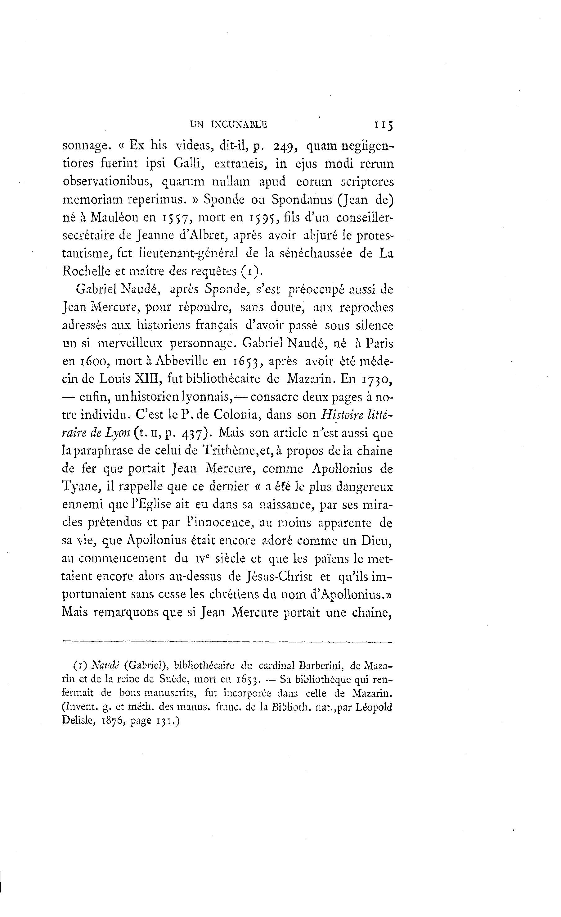 UN INCUNABLE ' 115 sonnage. « Ex his videas, dit-il, p. 249, quam negligen- tiores fuerint ipsi Galli, extraneis, in ejus modi rerum observationibus, quarum nullam apud eorum scriptores memoriam reperimus. » Sponde ou Spondanus (Jean de) né à Mauléon en 1557, mort en 1595, fils d'un conseiller- secrétaire de Jeanne d'Albret, après avoir abjuré le protes- tantisme, fut lieutenant-général de la sénéchaussée de La Rochelle et maître des requêtes (1). Gabriel Naudé, après Sponde, s'est préoccupé aussi de Jean Mercure, pour répondre, sans doute, aux reproches adressés aux historiens français d'avoir passé sous silence un si merveilleux personnage. Gabriel Naudé, né à Paris en 1600, mort à Abbeville en 1653, après avoir été méde- cin de Louis XIII, fut bibliothécaire de Mazarin. En 1730, — enfin, unhistorien lyonnais,-— consacre deux pages à no- tre individu. C'est leP.de Colonia, dans son Histoire litté- raire de Lyon (t. 11, p. 437). Mais son article n'est aussi que la paraphrase de celui de Trithème,et, à propos delà chaine de fer que portait Jean Mercure, comme Apollonius de Tyane, il rappelle que ce dernier « a éfé le plus dangereux ennemi que l'Eglise ait eu dans sa naissance, par ses mira- cles prétendus et par l'innocence, au moins apparente de sa vie, que Apollonius était encore adoré comme un Dieu, au commencement du ive siècle et que les païens le met- taient encore alors au-dessus de Jésus-Christ et qu'ils im- portunaient sans cesse les chrétiens du nom d'Apollonius.» Mais remarquons que si Jean Mercure portait une chaine, (1) Naudé (Gabriel), bibliothécaire du cardinal Barberini, de Maza- rin et de la reine de Suède, mort en 1653. — Sa bibliothèque qui ren- fermait de bons manuscrits, fut incorporée dans celle de Mazarin. (Invent. g. et méth. des manus. franc, de la Biblioth. nat.,par Léopold Delisle, 1876, page 131.)