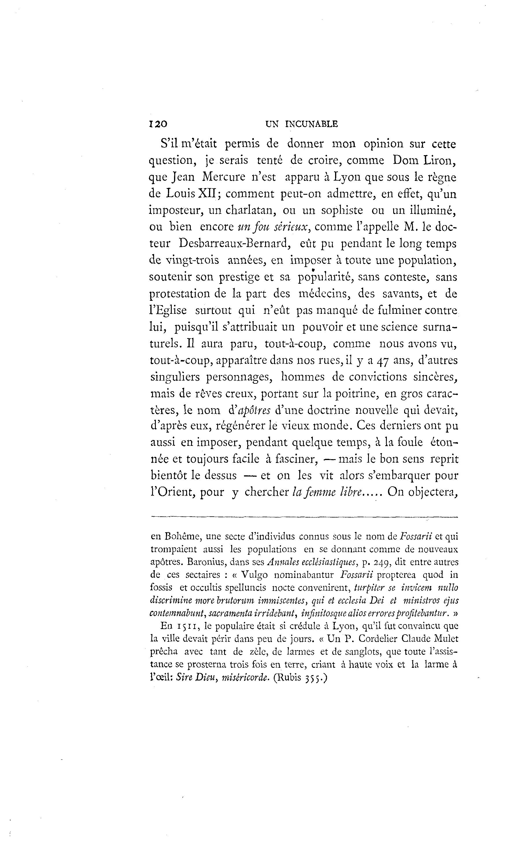 120 UN INCUNABLE S'il m'était permis de donner mon opinion sur cette question, je serais tenté de croire, comme Dom Liron, que Jean Mercure n'est apparu à Lyon que sous le règne de Louis XII; comment peut-on admettre, en effet, qu'un imposteur, un charlatan, ou un sophiste ou un illuminé, ou bien encore un fou sérieux, comme l'appelle M. le doc- teur Desbarreaux-Bernard, eût pu pendant le long temps de vingt-trois années, en imposer à toute une population, soutenir son prestige et sa popularité, sans conteste, sans protestation de la part des médecins, des savants, et de l'Eglise surtout qui n'eût pas manqué de fulminer contre lui, puisqu'il s'attribuait un pouvoir et une science surna- turels. Il aura paru, tout-à -coup, comme nous avons vu, tout-à -coup, apparaître dans nos rues, il y a 47 ans, d'autres singuliers personnages, hommes de convictions sincères, mais de rêves creux, portant sur la poitrine, en gros carac- tères, le nom à 'apôtres d'une doctrine nouvelle qui devait, d'après eux, régénérer le vieux monde. Ces derniers ont pu aussi en imposer, pendant quelque temps, à la foule éton- née et toujours facile à fasciner, —mais le bon sens reprit bientôt le dessus — et on les vit alors s'embarquer pour l'Orient, pour y chercher la femme libre On objectera, en Bohême, une secte d'individus connus sous le nom de Fossarii et qui trompaient aussi les populations en se donnant comme de nouveaux apôtres. Baronius, dans ses Annales ecclésiastiques, p. 249, dit entre autres de ces sectaires : « Vulgo nominabantur Fossarii propterea quod in fossis et occultis spelluncis nocte convenirent, turpiter se invicem nidlo discrimine more brutorwn immiscentes, qui et eccïesia Dei et ministros ejus contemnahunt, sacramenta irriiebant, infinitosque alios errores profitehantur. » En 1511, le populaire était si crédule à Lyon, qu'il fut convaincu que la ville devait périr dans peu de jours. « Un P. Cordelier Claude Mulet prêcha avec tant de zèle, de larmes et de sanglots, que toute l'assis- tance se prosterna trois fois en terre, criant à haute voix et la larme à l'œil: Sire Dieu, miséricorde. (Rubis 355.)