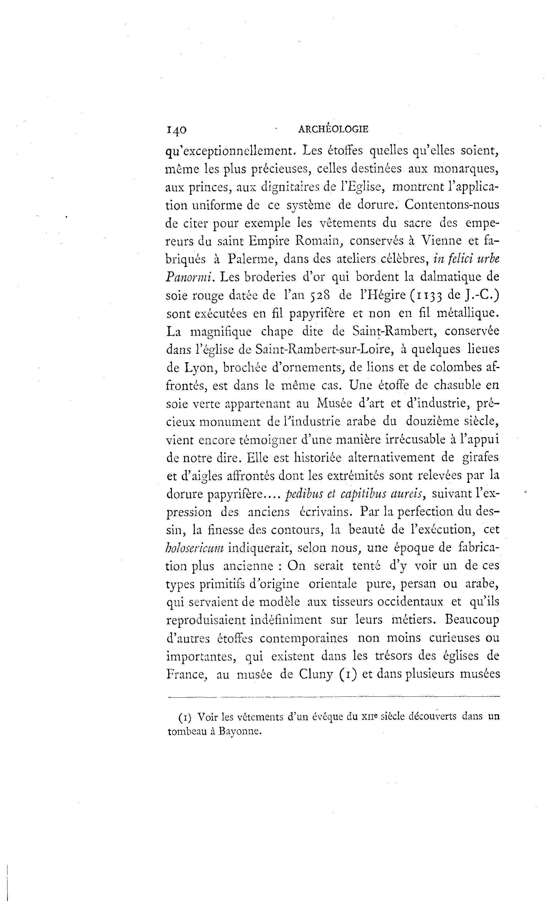 I40 ' ARCHÉOLOGIE qu'exceptionnellement. Les étoffes quelles qu'elles soient, même les plus précieuses, celles destinées aux monarques, aux princes, aux dignitaires de l'Eglise, montrent l'applica- tion uniforme de ce système de dorure. Contentons-nous de citer pour exemple les vêtements du sacre des empe- reurs du saint Empire Romain, conservés à Vienne et fa- briqués à Païenne, dans des ateliers célèbres, in felici urbe Panormi. Les broderies d'or qui bordent la dalmatique de soie rouge datée de l'an 528 de l'Hégire (1133 de J.-C.) sont exécutées en fil papyrifère et non en fil métallique. La magnifique chape dite de Saint-Rambert, conservée dans l'église de Saint-Rambert-sur-Loire, à quelques lieues de Lyon, brochée d'ornements, de lions et de colombes af- frontés, est dans le même cas. Une étoffe de chasuble en soie verte appartenant au Musée d'art et d'industrie, pré- cieux monument de l'industrie arabe du douzième siècle, vient encore témoigner d'une manière irrécusable à l'appui de notre dire. Elle est historiée alternativement de girafes et d'aigles affrontés dont les extrémités sont relevées par la dorure papyrifère pedibus et capitibus auras, suivant l'ex- pression des anciens écrivains. Par la perfection du des- sin, la finesse des contours, la beauté de l'exécution, cet holosericum indiquerait, selon nous, une époque de fabrica- tion plus ancienne : On serait tenté d'y voir un de ces types primitifs d'origine orientale pure, persan ou arabe, qui servaient de modèle aux tisseurs occidentaux et qu'ils reproduisaient indéfiniment sur leurs métiers. Beaucoup d'autres étoffes contemporaines non moins curieuses ou importantes, qui existent dans les trésors des églises de France, au musée de Cluny (1) et dans plusieurs musées (1) Voir les vêtements d'un évêque du XIIe siècle découverts dans un tombeau à Bayonne.