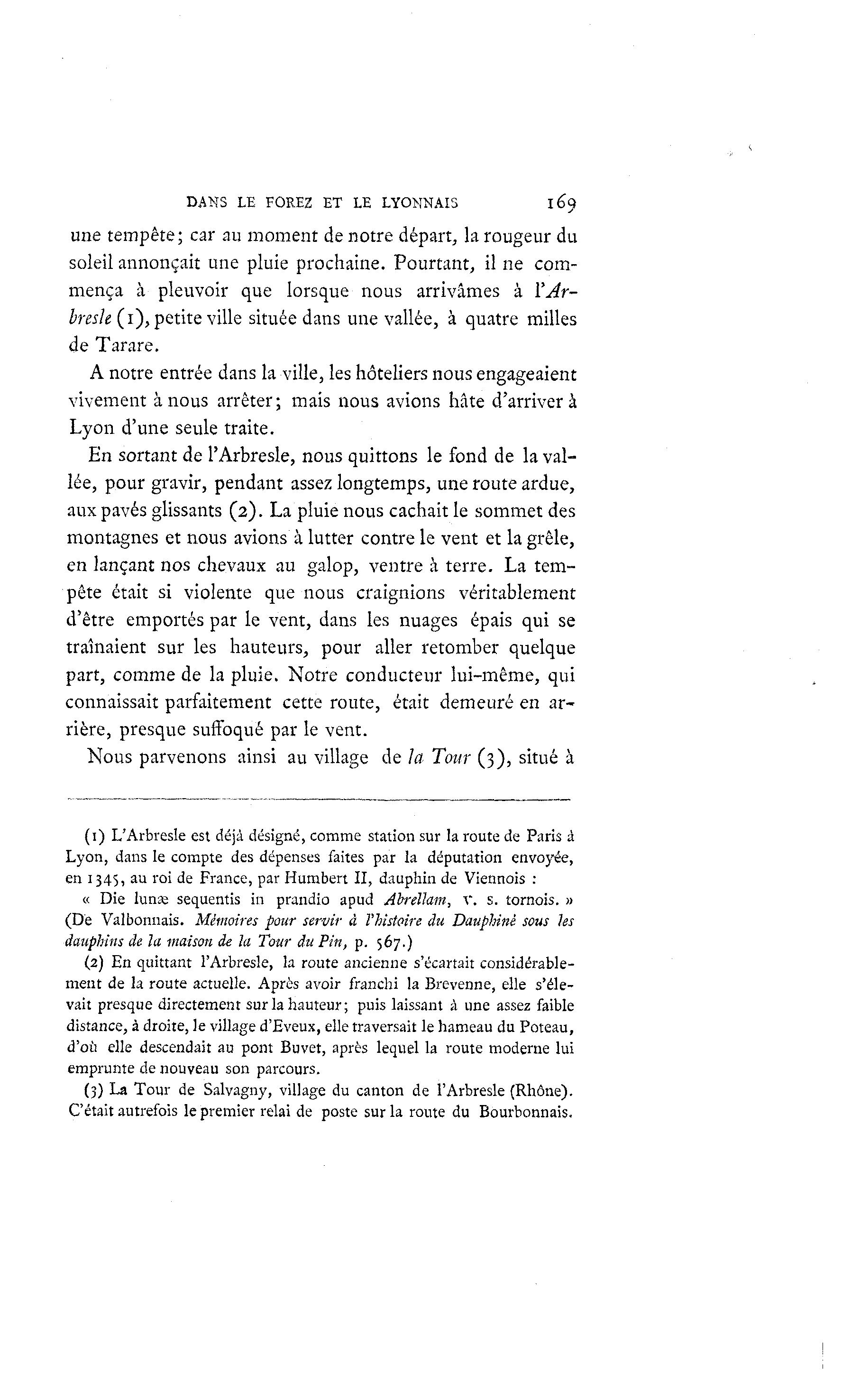 DANS LE FOREZ ET LE LYONNAIS 169 une tempête; car au moment de notre départ, la rougeur du soleil annonçait une pluie prochaine. Pourtant, il ne com- mença à pleuvoir que lorsque nous arrivâmes à i'Ar- bresk (1), petite ville située dans une vallée, à quatre milles de Tarare. A notre entrée dans la ville, les hôteliers nous engageaient vivement à nous arrêter; mais nous avions hâte d'arriver à Lyon d'une seule traite. En sortant de PArbresle, nous quittons le fond de la val- lée, pour gravir, pendant assez longtemps, une route ardue, aux pavés glissants (2). La pluie nous cachait le sommet des montagnes et nous avions à lutter contre le vent et la grêle, en lançant nos chevaux au galop, ventre à terre. La tem- pête était si violente que nous craignions véritablement d'être emportés par le vent, dans les nuages épais qui se traînaient sur les hauteurs, pour aller retomber quelque part, comme de la pluie. Notre conducteur lui-même, qui connaissait parfaitement cette route, était demeuré en ar- rière, presque suffoqué par le vent. Nous parvenons ainsi au village de la Tour (3), situé à (1) L'Arbresle est déjà désigné, comme station sur la route de Paris à Lyon, dans le compte des dépenses faites par la députation envoyée, en 1345, au roi de France, par Humbert II, dauphin de Viennois : « Die lunas sequentis in prandio apud Ahrellam, V. s. tornois. » (De Valbonnais. Mémoires pour servir à l'histoire du Dauphiné sous les dauphins de la maison de la Tour du Pin, p. 567.) (2) En quittant l'Arbresle, la route ancienne s'écartait considérable- ment de la route actuelle. Après avoir franchi la Brevenne, elle s'éle- vait presque directement sur la hauteur; puis laissant à une assez faible distance, à droite, le village d'Eveux, elle traversait le hameau du Poteau, d'où elle descendait au pont Buvet, après lequel la route moderne lui emprunte de nouveau son parcours. (3) La Tour de Salvagny, village du canton de l'Arbresle (Rhône). C'était autrefois le premier relai de poste sur la route du Bourbonnais.