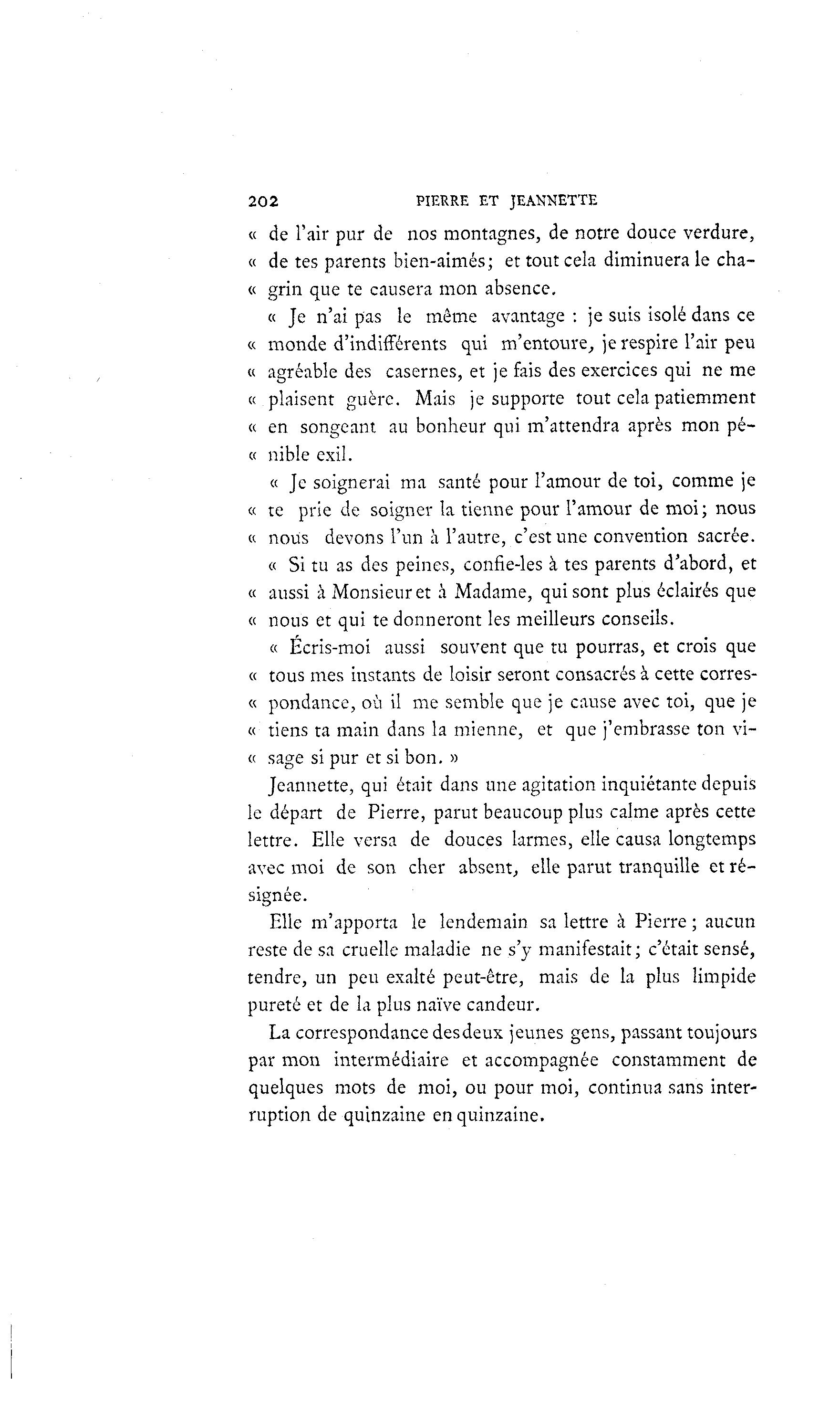 202 PIERRE ET JEANNETTE « de l'air pur de nos montagnes, de notre douce verdure, « de tes parents bien-aimés; et tout cela diminuera le cha- « grin que te causera mon absence. « Je n'ai pas le même avantage : je suis isolé dans ce « monde d'indifférents qui m'entoure, je respire l'air peu « agréable des casernes, et je fais des exercices qui ne me « plaisent guère. Mais je supporte tout cela patiemment « en songeant au bonheur qui m'attendra après mon pé- « nible exil. « Je soignerai ma santé pour l'amour de toi, comme je « te prie de soigner la tienne pour l'amour de moi; nous « nous devons l'un à l'autre, c'est une convention sacrée. « Si tu as des peines, confie-les à tes parents d'abord, et « aussi à Monsieur et à Madame, qui sont plus éclairés que « nous et qui te donneront les meilleurs conseils. « Écris-moi aussi souvent que tu pourras, et crois que « tous mes instants de loisir seront consacrés à cette corres- « pondance, où il me semble que je cause avec toi, que je « tiens ta main dans la mienne, et que j'embrasse ton vi- ce sage si pur et si bon. » Jeannette, qui était dans une agitation inquiétante depuis le départ de Pierre, parut beaucoup plus calme après cette lettre. Elle versa de douces larmes, elle causa longtemps avec moi de son cher absent, elle parut tranquille et ré- signée. Elle m'apporta le lendemain sa lettre à Pierre ; aucun reste de sa cruelle maladie ne s'y manifestait; c'était sensé, tendre, un peu exalté peut-être, mais de la plus limpide pureté et de la plus naïve candeur. La correspondance desdeux jeunes gens, passant toujours par mon intermédiaire et accompagnée constamment de quelques mots de moi, ou pour moi, continua sans inter- ruption de quinzaine en quinzaine.