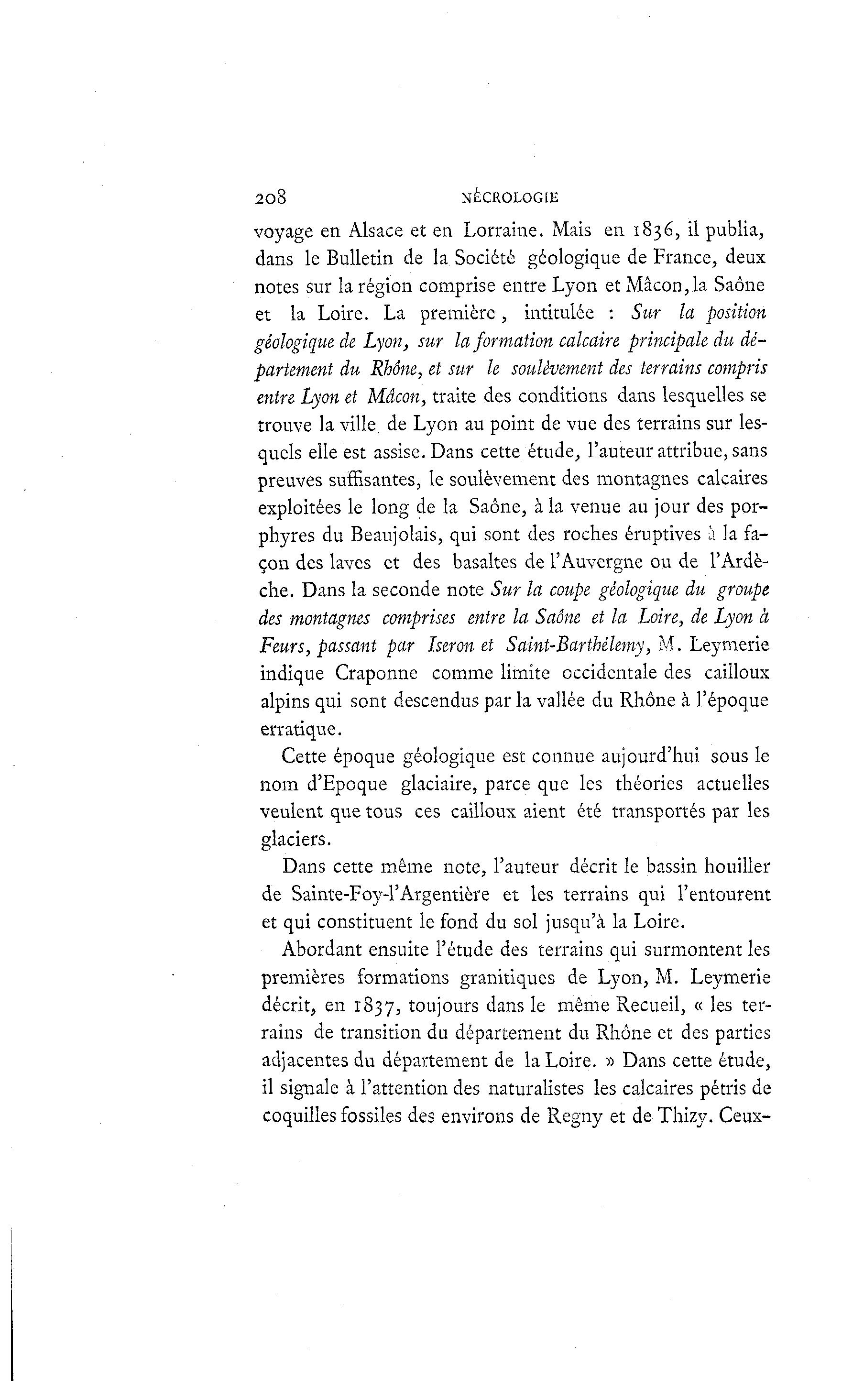 208 NÉCROLOGIE voyage en Alsace et en Lorraine. Mais en 1836, il publia, dans le Bulletin de la Société géologique de France, deux notes sur la région comprise entre Lyon et Mâcon,la Saône et la Loire. La première, intitulée : Sur la position géologique de Lyon, sur la formation calcaire principale du dé- partement du Rhône, et sur le soulèvement des terrains compris entre Lyon et Mâcon, traite des conditions dans lesquelles se trouve la ville, de Lyon au point de vue des terrains sur les- quels elle est assise. Dans cette étude, l'auteur attribue, sans preuves suffisantes, le soulèvement des montagnes calcaires exploitées le long de la Saône, à la venue au jour des por- phyres du Beaujolais, qui sont des roches éruptives l\ la fa- çon des laves et des basaltes de l'Auvergne ou de l'Ardè- che. Dans la seconde note Sur la coupe géologique du groupe des montagnes comprises entre la Saône et la Loire, de Lyon à Feurs, passant par Iseron et Saint-Barthélémy, M. Leymerie indique Craponne comme limite occidentale des cailloux alpins qui sont descendus par la vallée du Rhône à l'époque erratique. Cette époque géologique est connue aujourd'hui sous le nom d'Epoque glaciaire, parce que les théories actuelles veulent que tous ces cailloux aient été transportés par les glaciers. Dans cette même note, l'auteur décrit le bassin houiller de Sainte-Foy-1'Argentière et les terrains qui l'entourent et qui constituent le fond du sol jusqu'à la Loire. Abordant ensuite l'étude des terrains qui surmontent les premières formations granitiques de Lyon, M. Leymerie décrit, en 1837, toujours dans le même Recueil, « les ter- rains de transition du département du Rhône et des parties adjacentes du département de la Loire. » Dans cette étude, il signale à l'attention des naturalistes les calcaires pétris de coquilles fossiles des environs de Regny et de Thizy. Ceux-