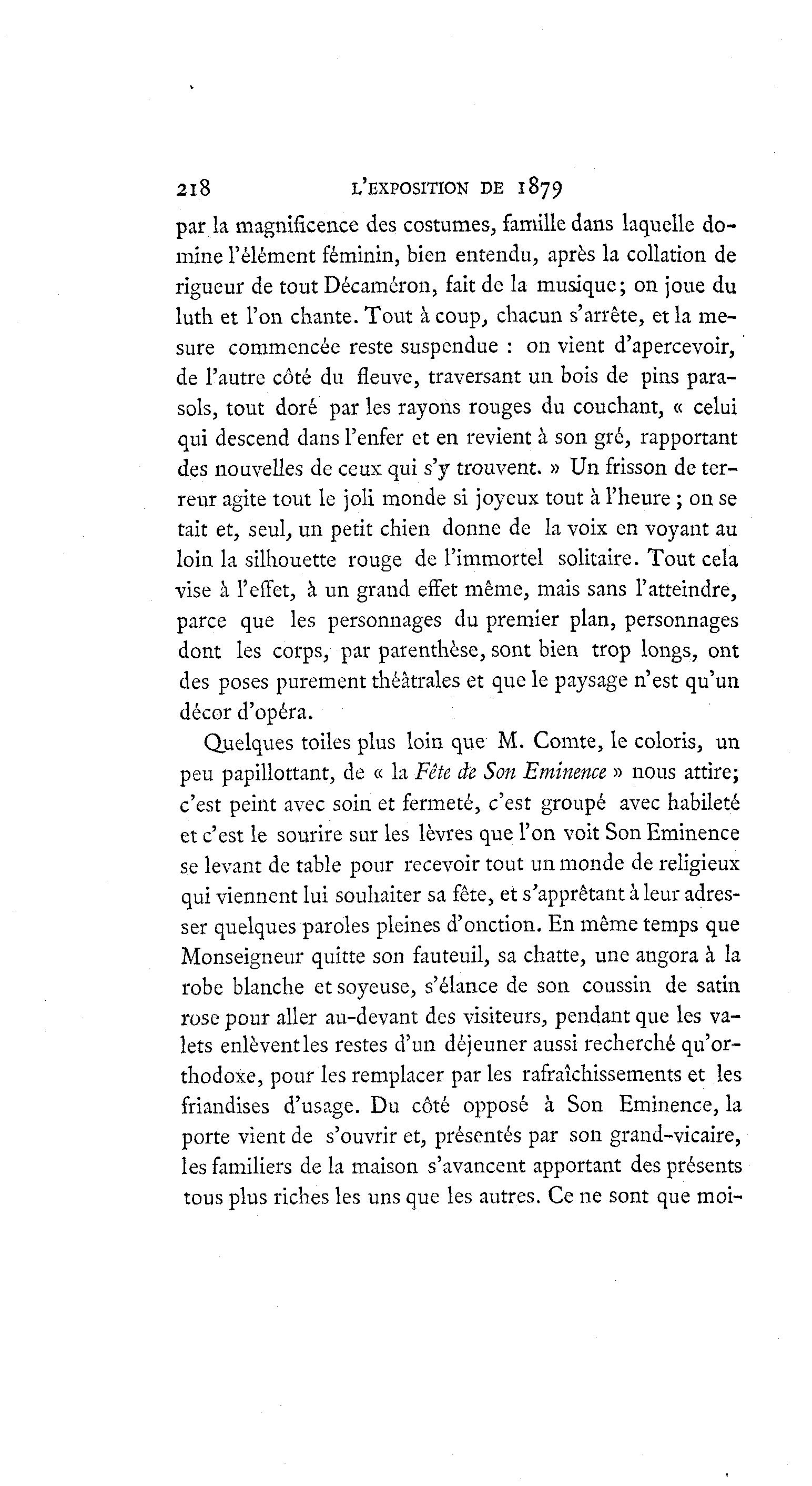 218 L'EXPOSITION DE 1879 par la magnificence des costumes, famille dans laquelle do- mine l'élément féminin, bien entendu, après la collation de rigueur de tout Décaméron, fait de la musique; on joue du luth et l'on chante. Tout à coup, chacun s'arrête, et la me- sure commencée reste suspendue : on vient d'apercevoir, de l'autre côté du fleuve, traversant un bois de pins para- sols, tout doré par les rayons rouges du couchant, « celui qui descend dans l'enfer et en revient à son gré, rapportant des nouvelles de ceux qui s'y trouvent. » Un frisson de ter- reur agite tout le joli monde si joyeux tout à l'heure ; on se tait et, seul, un petit chien donne de la voix en voyant au loin la silhouette rouge de l'immortel solitaire. Tout cela vise à l'effet, à un grand effet même, mais sans l'atteindre, parce que les personnages du premier plan, personnages dont les corps, par parenthèse, sont bien trop longs, ont des poses purement théâtrales et que le paysage n'est qu'un décor d'opéra. Quelques toiles plus loin que M. Comte, le coloris, un peu papillottant, de « la Fête de Son Eminence » nous attire; c'est peint avec soin et fermeté, c'est groupé avec habileté et c'est le sourire sur les lèvres que l'on voit Son Eminence se levant de table pour recevoir tout un monde de religieux qui viennent lui souhaiter sa fête, et s'apprêtant à leur adres- ser quelques paroles pleines d'onction. En même temps que Monseigneur quitte son fauteuil, sa chatte, une angora à la robe blanche et soyeuse, s'élance de son coussin de satin rose pour aller au-devant des visiteurs, pendant que les va- lets enlèvent les restes d'un déjeuner aussi recherché qu'or- thodoxe, pour les remplacer par les rafraîchissements et les friandises d'usage. Du côté opposé à Son Eminence, la porte vient de s'ouvrir et, présentés par son grand-vicaire, les familiers de la maison s'avancent apportant des présents tous plus riches les uns que les autres. Ce ne sont que moi-
