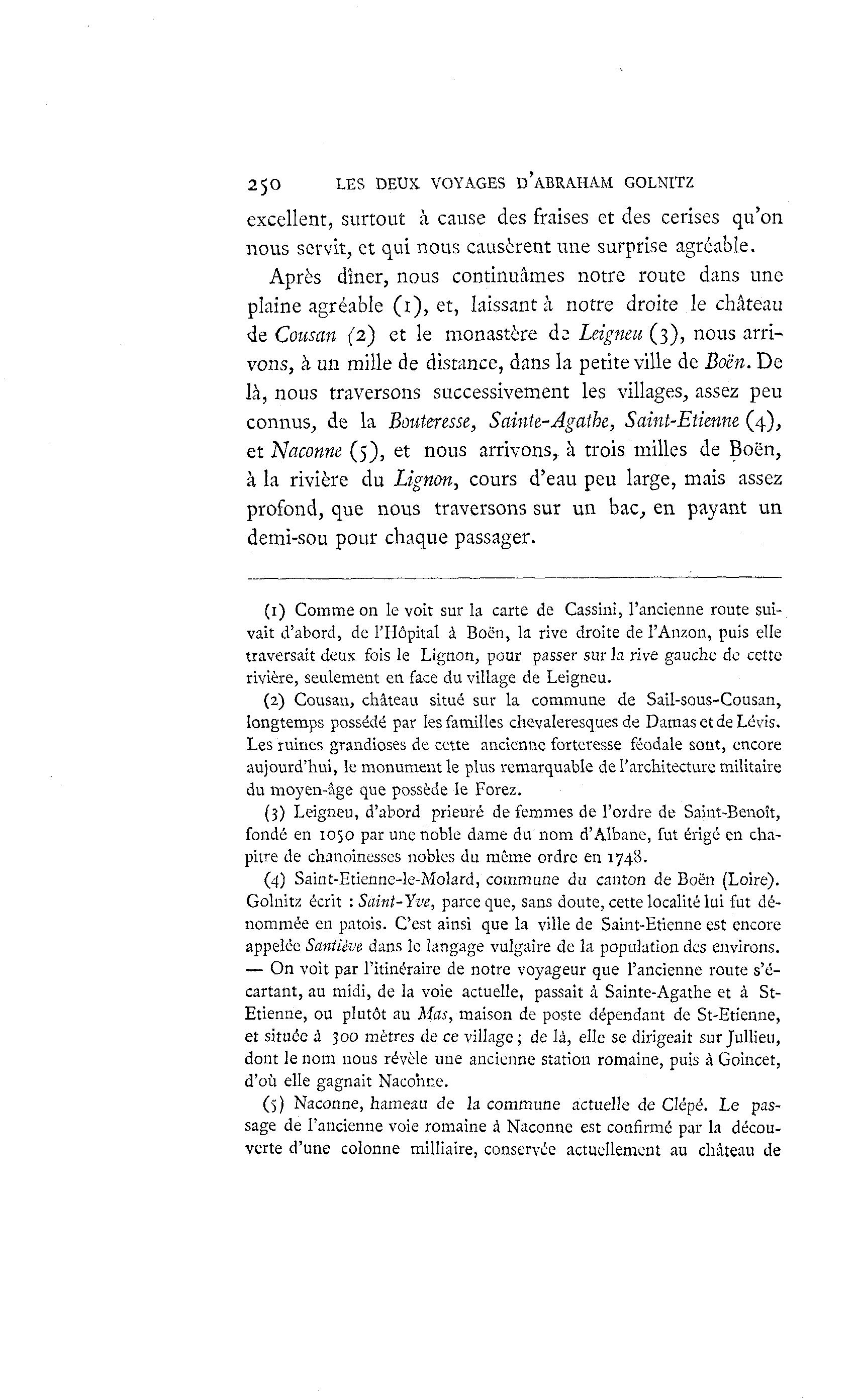 250 LES DEUX VOYAGES D'ABRAHAM GOLNITZ excellent, surtout à cause des fraises et des cerises qu'on nous servit, et qui nous causèrent une surprise agréable. Après dîner, nous continuâmes notre route dans une plaine agréable (1), et, laissant à notre droite le château de Cousan (2) et le monastère à z Leigneu (3), nous arri- vons, à un mille de distance, dans la petite ville de Boën. De là , nous traversons successivement les villages, assez peu connus, de la Bouteresse, Sainte-Agathe, Saint-Etienne (4), et Naconne (5), et nous arrivons, à trois milles de Boën, à la rivière du Lignon, cours d'eau peu large, mais assez profond, que nous traversons sur un bac, en payant un demi-sou pour chaque passager. (1) Comme on le voit sur la carte de Cassini, l'ancienne route sui- vait d'abord, de l'Hôpital à Boën, la rive droite de l'Anzon, puis elle traversait deux fois le Lignon, pour passer sur la rive gauche de cette rivière, seulement en face du village de Leigneu. (2) Cousan, château situé sur la commune de Sail-sous-Cousan, longtemps possédé par les familles chevaleresques de DamasetdeLévis. Les ruines grandioses de cette ancienne forteresse féodale sont, encore aujourd'hui, le monument le plus remarquable de l'architecture militaire du moyen-âge que possède le Forez. (3) Leigneu, d'abord prieuré de femmes de l'ordre de Saint-Benoît, fondé en 1050 par une noble dame du nom d'Albane, fut érigé en cha- pitre de chanoinesses nobles du même ordre en 1748. (4) Saint-Etienne-le-Molard, commune du canton de Boën (Loire). Golnitz écrit : Saint-Yve, parce que, sans doute, cette localité lui fut dé- nommée en patois. C'est ainsi que la ville de Saint-Etienne est encore appelée Saniiève dans le langage vulgaire de la population des environs. — On voit par l'itinéraire de notre voyageur que l'ancienne route s'é- cartant, au midi, de la voie actuelle, passait à Sainte-Agathe et à St- Etienne, ou plutôt au Mas, maison de poste dépendant de St-Etienne, et située à 300 mètres de ce village ; de là , elle se dirigeait sur Jullieu, dont le nom nous révèle une ancienne station romaine, puis à Goincet, d'où elle gagnait Naconne. (5 ) Naconne, hameau de la commune actuelle de Clépé. Le pas- sage de l'ancienne voie romaine à Naconne est confirmé par la décou- verte d'une colonne milliaire, conservée actuellement au château de