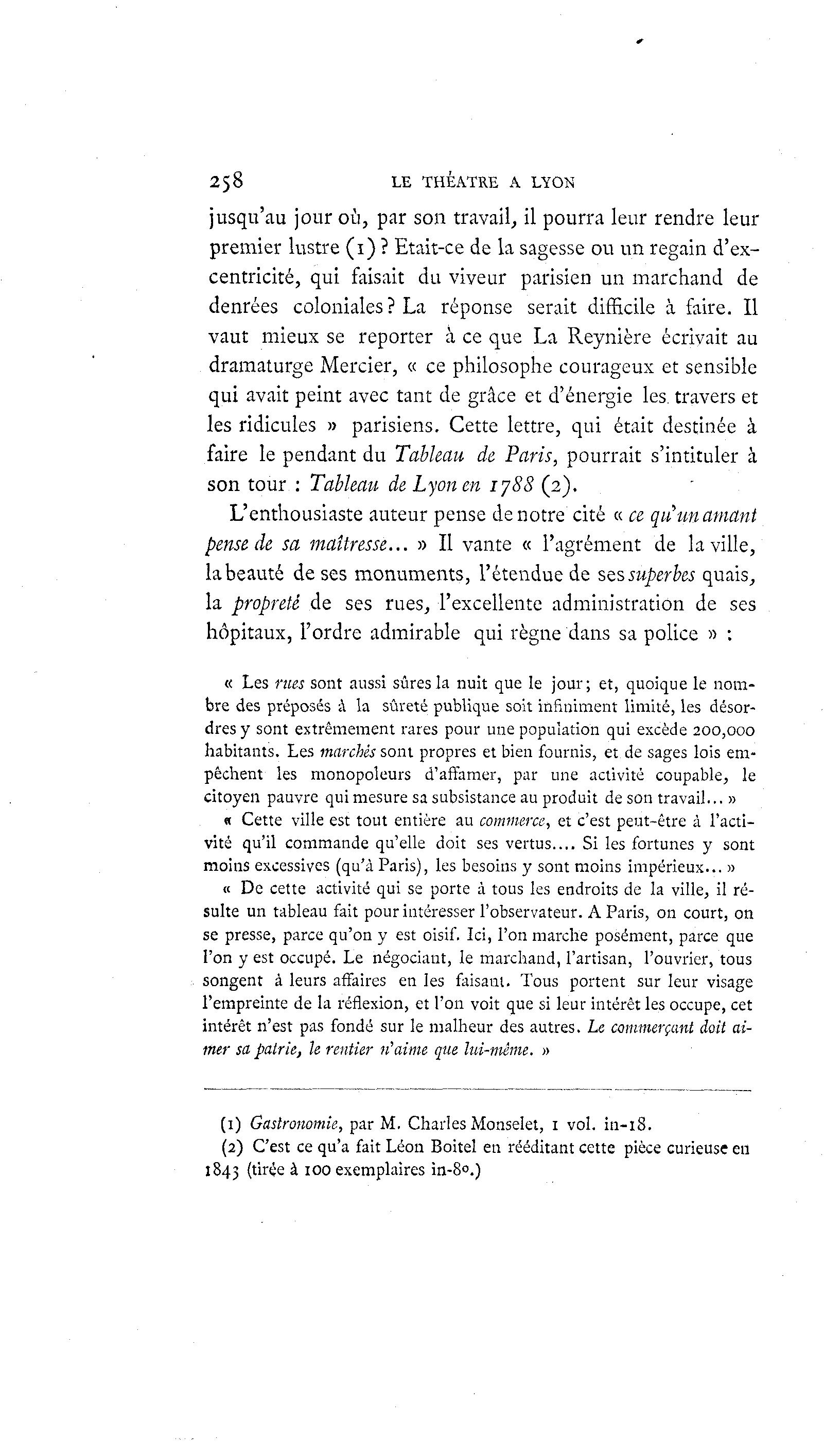258 LE THÉÂTRE A LYON jusqu'au jour où, par son travail, il pourra leur rendre leur premier lustre (1) ? Etait-ce de la sagesse ou un regain d'ex- centricité, qui faisait du viveur parisien un marchand de denrées coloniales ? La réponse serait difficile à faire. Il vaut mieux se reporter à ce que La Reynière écrivait au dramaturge Mercier, « ce philosophe courageux et sensible qui avait peint avec tant de grâce et d'énergie les. travers et les ridicules » parisiens. Cette lettre, qui était destinée à faire le pendant du Tableau de Paris, pourrait s'intituler à son tour : Tableau de Lyon en 1788 (2). L'enthousiaste auteur pense de notre cité « ce qu un amant pense de sa maltresse... » Il vante « l'agrément de la ville, labeauté de ses monuments, l'étendue de stssuperbes quais, la propreté de ses rues, l'excellente administration de ses hôpitaux, l'ordre admirable qui règne dans sa police » : « Les rues sont aussi sûres la nuit que le jour; et, quoique le nom- bre des préposés à la sûreté publique soit infiniment limité, les désor- dres y sont extrêmement rares pour une population qui excède 200,000 habitants. Les marchés sont propres et bien fournis, et de sages lois em- pêchent les monopoleurs d'affamer, par une activité coupable, le citoyen pauvre qui mesure sa subsistance au produit de son travail... » « Cette ville est tout entière au commerce, et c'est peut-être à l'acti- vité qu'il commande qu'elle doit ses vertus.... Si les fortunes y sont moins excessives (qu'à Paris), les besoins y sont moins impérieux... » u De cette activité qui se porte à tous les endroits de la ville, il ré- sulte un tableau fait pour intéresser l'observateur. A Paris, on court, on se presse, parce qu'on y est oisif. Ici, l'on marche posément, parce que l'on y est occupé. Le négociant, le marchand, l'artisan, l'ouvrier, tous songent à leurs affaires en les faisant. Tous portent sur leur visage l'empreinte de la réflexion, et l'on voit que si leur intérêt les occupe, cet intérêt n'est pas fondé sur le malheur des autres. Le commerçant doit ai- mer sa patrie, le rentier n'aime que lui-même. » (1) Gastronomie, par M. Charles Monselet, 1 vol. in-iS. (2) C'est ce qu'a fait Léon Boitel en rééditant cette pièce curieuse eu 1843 (tirée à 100 exemplaires in-8°.)
