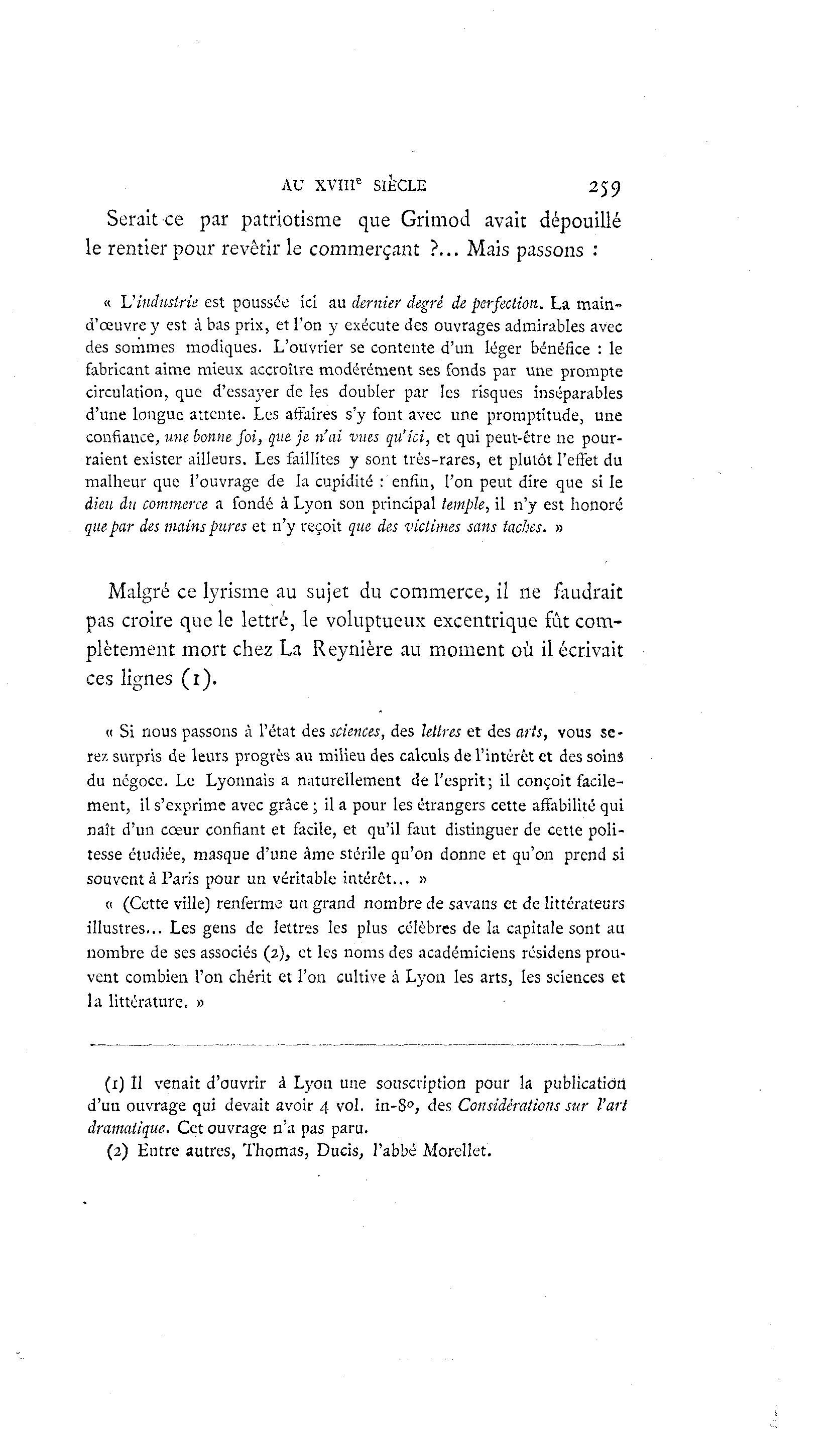 AU XVIIIe SIÈCLE 259 Serait-ce par patriotisme que Grimod avait dépouillé le rentier pour revêtir le commerçant ?... Mais passons : « L'industrie est poussée ici au dernier degré de perfection. La main- d'œuvre y est à bas prix, et l'on y exécute des ouvrages admirables avec des sommes modiques. L'ouvrier se contente d'un léger bénéfice : le fabricant aime mieux accroître modérément ses fonds par une prompte circulation, que d'essayer de les doubler par les risques inséparables d'une longue attente. Les affaires s'y font avec une promptitude, une confiance, une bonne foi, que je n'ai vues qu'ici, et qui peut-être ne pour- raient exister ailleurs. Les faillites y sont très-rares, et plutôt l'effet du malheur que l'ouvrage de la cupidité : enfin, l'on peut dire que si le dieu du commerce a fondé à Lyon son principal temple, il n'y est honoré que par des mains pures et n'y reçoit que des victimes sans taches. » Malgré ce lyrisme au sujet du commerce, il ne faudrait pas croire que le lettré, le voluptueux excentrique fût com- plètement mort chez La Reynière au moment où il écrivait ces lignes (1). « Si nous passons à l'état des sciences, des lettres et des arts, vous se- rez surpris de leurs progrès au milieu des calculs de l'intérêt et des soins du négoce. Le Lyonnais a naturellement de l'esprit; il conçoit facile- ment, il s'exprime avec grâce ; il a pour les étrangers cette affabilité qui naît d'un cœur confiant et facile, et qu'il faut distinguer de cette poli- tesse étudiée, masque d'une âme stérile qu'on donne et qu'on prend si souvent à Paris pour un véritable intérêt... » « (Cette ville) renferme un grand nombre de savans et de littérateurs illustres,.. Les gens de lettres les plus célèbres de la capitale sont au nombre de ses associés (2), et les noms des académiciens résidens prou- vent combien l'on chérit et l'on cultive à Lyon les arts, les sciences et la littérature. » (1) Il venait d'ouvrir à Lyon une souscription pour la publication" d'un ouvrage qui devait avoir 4 vol. in-8°, des Considérations sur l'art dramatique. Cet ouvrage n'a pas paru. (2) Entre autres, Thomas, Ducis, l'abbé Morellet.