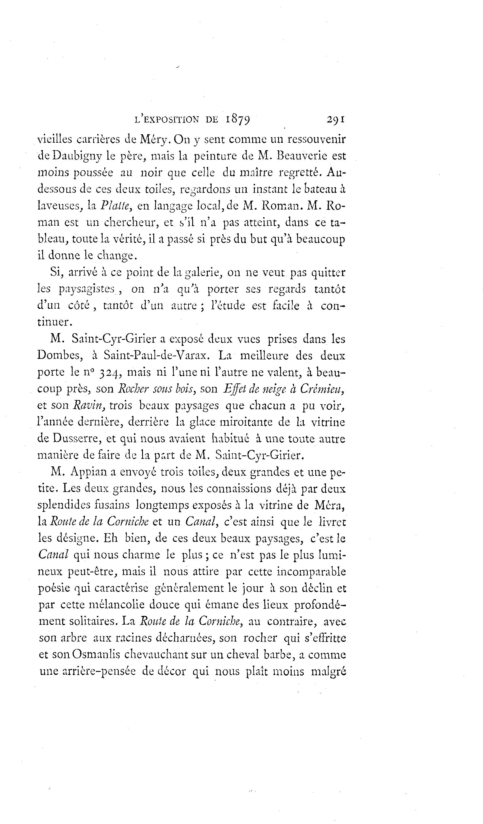 L'EXPOSITION DE 1879 291 vieilles carrières de Méry. On y sent comme un ressouvenir de Daubigny le père, mais la peinture de M. Beauverie est moins poussée au noir que celle du maître regretté. Au- dessous de ces deux toiles, regardons un instant le bateau à laveuses, la Plalfe, en langage local, de M. Roman. M. Ro- man est un chercheur, et s'il n'a pas atteint, dans ce ta- bleau, toute la vérité, il a passé si près du but qu'à beaucoup il donne le change. Si, arrivé à ce point de la galerie, on ne veut pas quitter les paysagistes , on n'a qu'à porter ses regards tantôt d'un côté , tantôt d'un autre ; l'étude est facile à con- tinuer. M. Saint-Cyr-Girier a exposé deux vues prises dans les Dombes, à Saint-Paul-de-Varax. La meilleure des deux porte le n° 324, mais ni l'une ni l'autre ne valent, à beau- coup près, son Rocher sous bois, son Effet de neige à Crèmieu, et son Ravin, trois beaux paysages que chacun a pu voir, l'année dernière, derrière la glace miroitante de la vitrine de Dusserre, et qui nous avaient habitué à une toute autre manière défaire de la part de M. Saint-Cyr-Girier. M. Appian a envoyé trois toiles, deux grandes et une pe- tite. Les deux grandes, nous les connaissions déjà par deux splendides fusains longtemps exposés à la vitrine de Méra, la Route de la Corniche et un Canal, c'est ainsi que le livret les désigne. Eh bien, de ces deux beaux paysages, c'est le Canal qui nous charme le plus ; ce n'est pas le plus lumi- neux peut-être, mais il nous attire par cette incomparable poésie qui caractérise généralement le jour à son déclin et par cette mélancolie douce qui émane des lieux profondé- ment solitaires. La Route de la Corniche, au contraire, avec son arbre aux racines décharnées, son rocher qui s'effritte et sonOsmanlis chevauchant sur un cheval barbe, a comme une arrière-pensée de décor qui nous plaît moins malgré