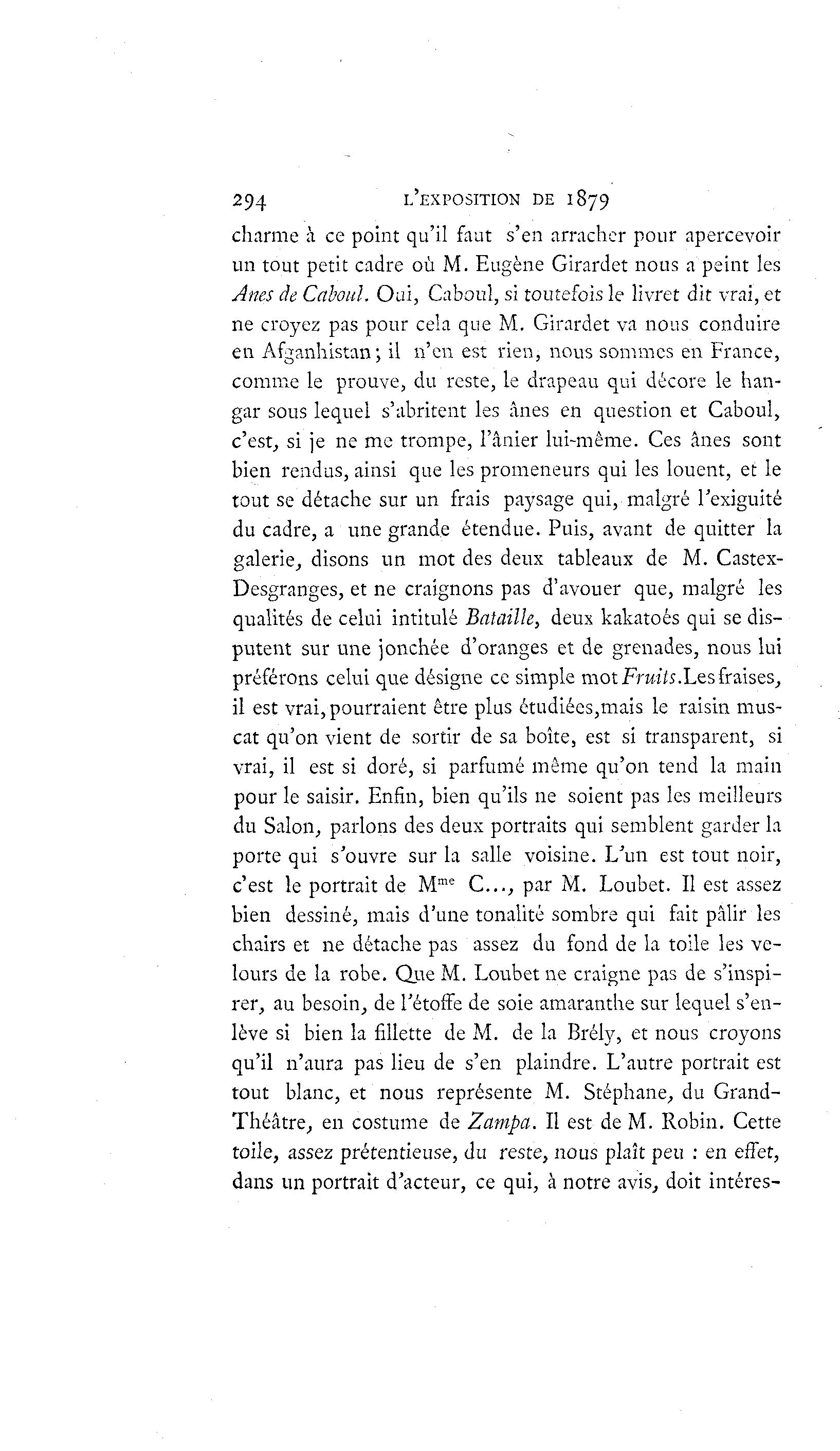 294 L'EXPOSITION DE 1879 charme à ce point qu'il faut s'en arracher pour apercevoir un tout petit cadre où M. Eugène Girardet nous a peint les Anes de Caboul. Oui, Caboul, si toutefois le livret dit vrai, et ne croyez pas pour cela que M. Girardet va nous conduire en Afganhistan ; il n'en est rien, nous sommes en France, comme le prouve, du reste, le drapeau qui décore le han- gar sous lequel s'abritent les ânes en question et Caboul, c'est, si je ne me trompe, l'ânier lui-même. Ces ânes sont bien rendus, ainsi que les promeneurs qui les louent, et le tout se détache sur un frais paysage qui, malgré l'exiguïté du cadre, a une grande étendue. Puis, avant de quitter la galerie, disons un mot des deux tableaux de M. Castex- Desgranges, et ne craignons pas d'avouer que, malgré les qualités de celui intitulé Bataille, deux kakatoès qui se dis- putent sur une jonchée d'oranges et de grenades, nous lui préférons celui que désigne ce simple mot Fruits.Les fraises, il est vrai, pourraient être plus étudiécs,mais le raisin mus- cat qu'on vient de sortir de sa boîte, est si transparent, si vrai, il est si doré, si parfumé même qu'on tend la main pour le saisir. Enfin, bien qu'ils ne soient pas les meilleurs du Salon, parlons des deux portraits qui semblent garder la porte qui s'ouvre sur la salle voisine. L'un est tout noir, c'est le portrait de Mme C..., par M. Loubet. Il est assez bien dessiné, mais d'une tonalité sombre qui fait pâlir les chairs et ne détache pas assez du fond de la toile les ve- lours de la robe. Que M. Loubet ne craigne pas de s'inspi- rer, au besoin, de l'étoffe de soie amaranthe sur lequel s'en- lève si bien la fillette de M. de la Brély, et nous croyons qu'il n'aura pas lieu de s'en plaindre. L'autre portrait est tout blanc, et nous représente M. Stéphane, du Grand- Théâtre, en costume de Zampa. Il est de M. Robin. Cette toile, assez prétentieuse, du reste, nous plaît peu : en effet, dans un portrait d'acteur, ce qui, à notre avis, doit intéres-
