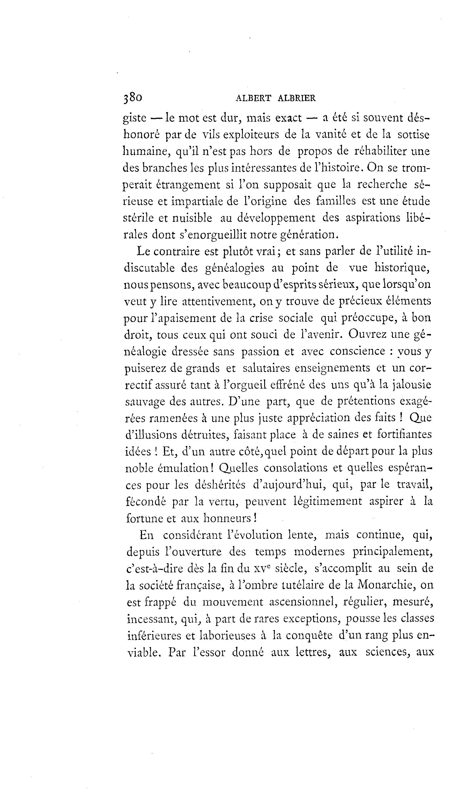 380 ALBERT ALBRIER giste — le mot est dur, mais exact — a été si souvent dés- honoré par de vils exploiteurs de la vanité et de la sottise humaine, qu'il n'est pas hors de propos de réhabiliter une des branches les plus intéressantes de l'histoire. On se trom- perait étrangement si l'on supposait que la recherche sé- rieuse et impartiale de l'origine des familles est une étude stérile et nuisible au développement des aspirations libé- rales dont s'enorgueillit notre génération. Le contraire est plutôt vrai; et sans parler de l'utilité in- discutable des généalogies au point de vue historique, nous pensons, avec beaucoup d'esprits sérieux, que lorsqu'on veut y lire attentivement, on y trouve de précieux éléments pour l'apaisement de la crise sociale qui préoccupe, à bon droit, tous ceux qui ont souci de l'avenir. Ouvrez une gé- néalogie dressée sans passion et avec conscience : vous y puiserez de grands et salutaires enseignements et un cor- rectif assuré tant à l'orgueil effréné des uns qu'à la jalousie sauvage des autres. D'une part, que de prétentions exagé- rées ramenées à une plus juste appréciation des faits ! Que d'illusions détruites, faisant place à de saines et fortifiantes idées 1 Et, d'un autre côté, quel point de départ pour la plus noble émulation! Quelles consolations et quelles espéran- ces pour les déshérités d'aujourd'hui, qui, par le travail, fécondé par la vertu, peuvent légitimement aspirer à la fortune et aux honneurs ! En considérant l'évolution lente, mais continue, qui, depuis l'ouverture des temps modernes principalement, c'est-à -dire dès la fin du xve siècle, s'accomplit au sein de la société française, à l'ombre tutélaire de la Monarchie, on est frappé du mouvement ascensionnel, régulier, mesuré, incessant, qui, à part de rares exceptions, pousse les classes inférieures et laborieuses à la conquête d'un rang plus en- viable. Par l'essor donné aux lettres, aux sciences, aux