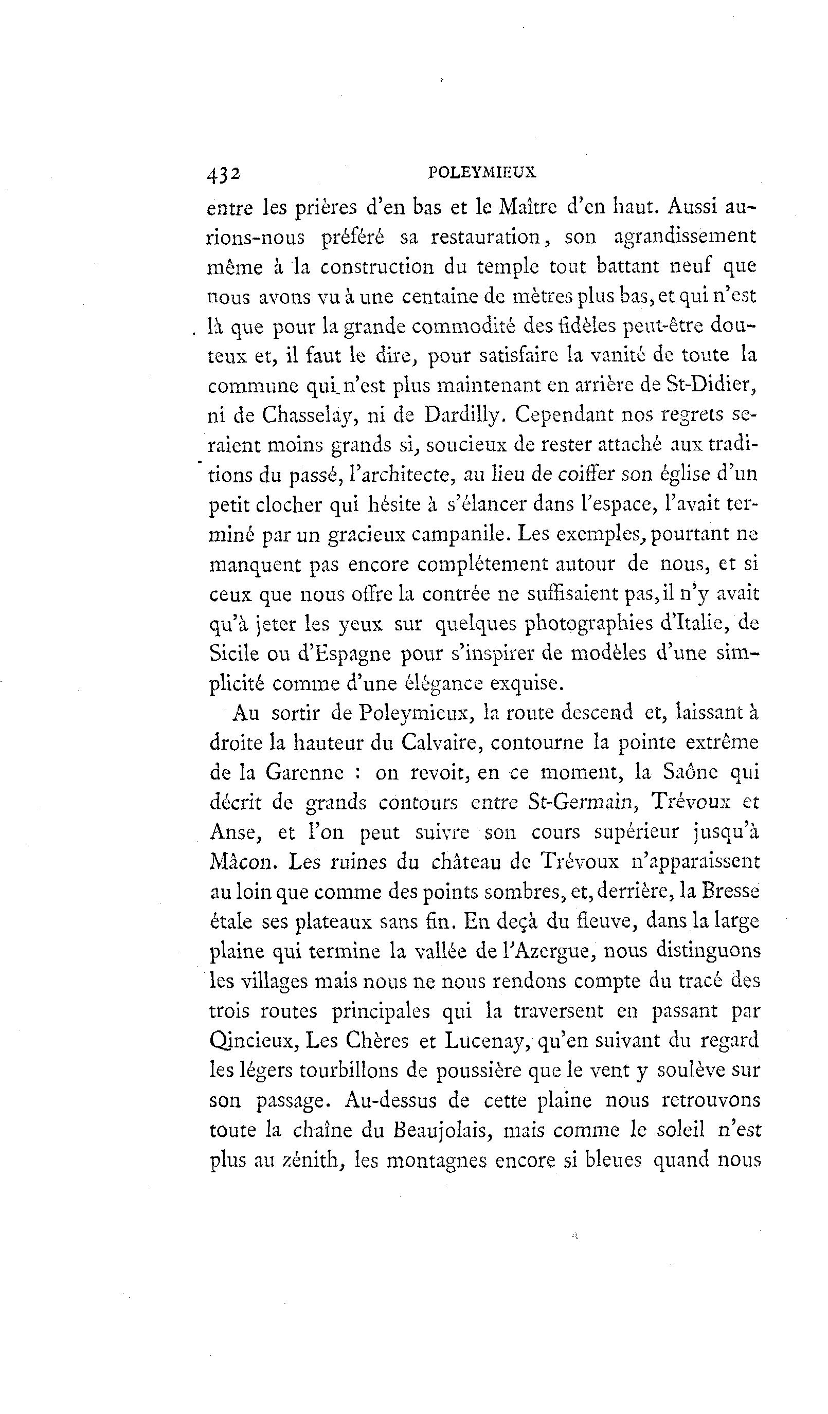 432 POLEYMIEUX entre les prières d'en bas et le Maître d'en haut. Aussi au- rions-nous préféré sa restauration, son agrandissement même à la construction du temple tout battant neuf que nous avons vu à une centaine de mètres plus bas, et qui n'est là que pour la grande commodité des fidèles peut-être dou- teux et, il faut le dire, pour satisfaire la vanité de toute la commune qui. n'est plus maintenant en arrière de St-Didier, ni de Chasselay, ni de Dardilly. Cependant nos regrets se- raient moins grands si, soucieux de rester attaché aux tradi- tions du passé, l'architecte, au lieu de coiffer son église d'un petit clocher qui hésite à s'élancer dans l'espace, l'avait ter- miné par un gracieux campanile. Les exemples, pourtant ne manquent pas encore complètement autour de nous, et si ceux que nous offre la contrée ne suffisaient pas, il n'y avait qu'à jeter les yeux sur quelques photographies d'Italie, de Sicile ou d'Espagne pour s'inspirer de modèles d'une sim- plicité comme d'une élégance exquise. Au sortir de Poleymieux, la route descend et, laissant à droite la hauteur du Calvaire, contourne la pointe extrême de la Garenne : on revoit, en ce moment, la Saône qui décrit de grands contours entre St-Germain, Trévoux et Anse, et l'on peut suivre son cours supérieur jusqu'à Mâcon. Les ruines du château de Trévoux n'apparaissent au loin que comme des points sombres, et, derrière, la Bresse étale ses plateaux sans fin. En deçà du fleuve, dans la large plaine qui termine la vallée de l'Azergue, nous distinguons les villages mais nous ne nous rendons compte du tracé des trois routes principales qui la traversent en passant par Qincieux, Les Chères et Lucenay, qu'en suivant du regard les légers tourbillons de poussière que le vent y soulève sur son passage. Au-dessus de cette plaine nous retrouvons toute la chaîne du Beaujolais, mais comme le soleil n'est plus au zénith, les montagnes encore si bleues quand nous
