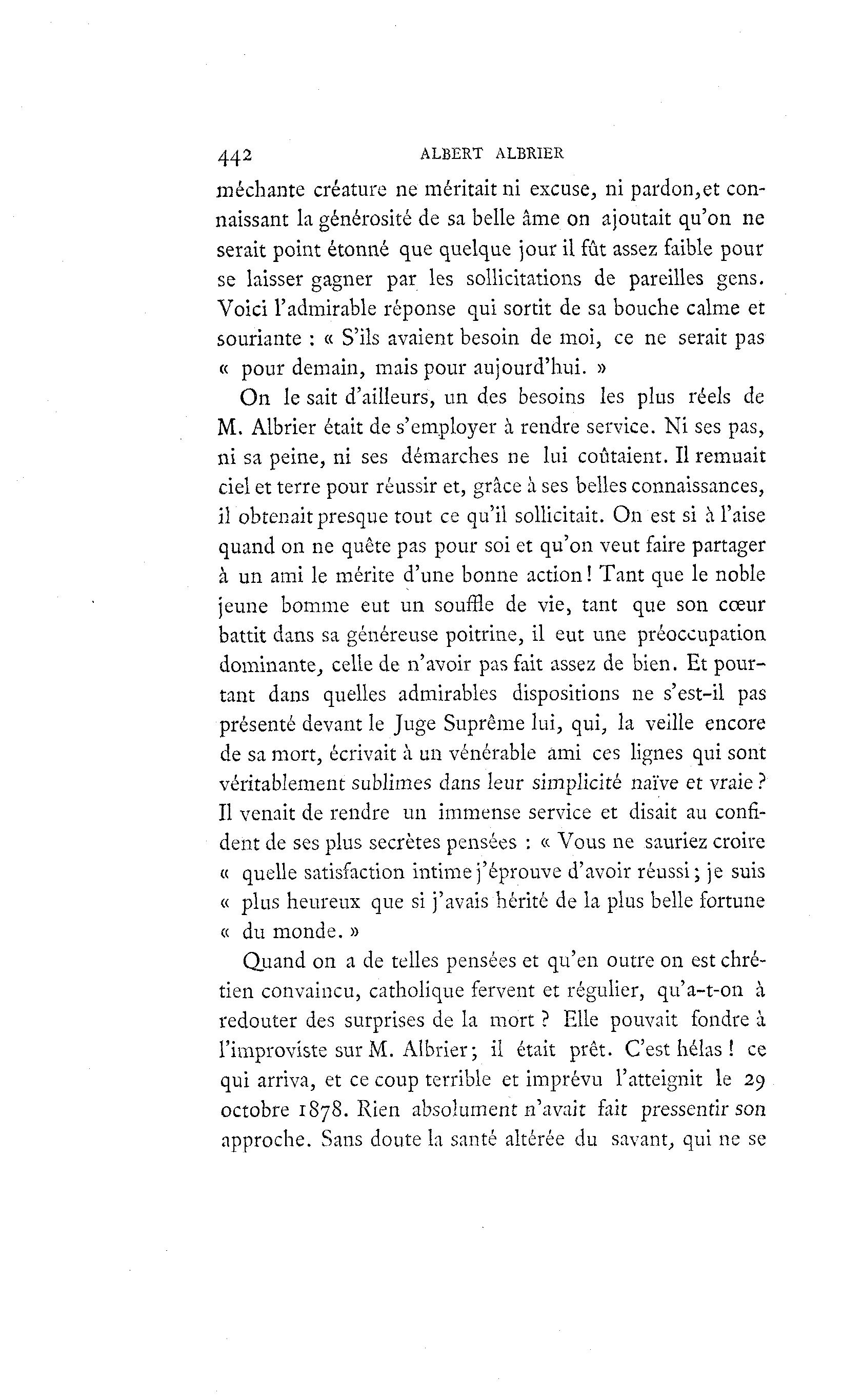 442 ALBERT ALBRIER méchante créature ne méritait ni excuse, ni pardon,et con- naissant la générosité de sa belle âme on ajoutait qu'on ne serait point étonné que quelque jour il fût assez faible pour se laisser gagner par les sollicitations de pareilles gens. Voici l'admirable réponse qui sortit de sa bouche calme et souriante : « S'ils avaient besoin de moi, ce ne serait pas « pour demain, mais pour aujourd'hui. » On le sait d'ailleurs, un des besoins les plus réels de M. Albrier était de s'employer à rendre service. Ni ses pas, ni sa peine, ni ses démarches ne lui coûtaient. Il remuait ciel et terre pour réussir et, grâce à ses belles connaissances, il obtenait presque tout ce qu'il sollicitait. On est si à l'aise quand on ne quête pas pour soi et qu'on veut faire partager à un ami le mérite d'une bonne action ! Tant que le noble jeune bomme eut un souffle de vie, tant que son cœur battit dans sa généreuse poitrine, il eut une préoccupation dominante, celle de n'avoir pas fait assez de bien. Et pour- tant dans quelles admirables dispositions ne s'est-il pas présenté devant le Juge Suprême lui, qui, la veille encore de sa mort, écrivait à un vénérable ami ces lignes qui sont véritablement sublimes dans leur simplicité naïve et vraie ? Il venait de rendre un immense service et disait au confi- dent de ses plus secrètes pensées : « Vous ne sauriez croire « quelle satisfaction intime j'éprouve d'avoir réussi; je suis « plus heureux que si j'avais hérité de la plus belle fortune « du monde. » Quand on a de telles pensées et qu'en outre on est chré- tien convaincu, catholique fervent et régulier, qu'a-t-on à redouter des surprises de la mort ? Elle pouvait fondre à l'improviste sur M. Albrier; il était prêt. C'est hélas ! ce qui arriva, et ce coup terrible et imprévu l'atteignit le 29 octobre 1878. Rien absolument n'avait fait pressentir son approche. Sans doute la santé altérée du savant, qui ne se