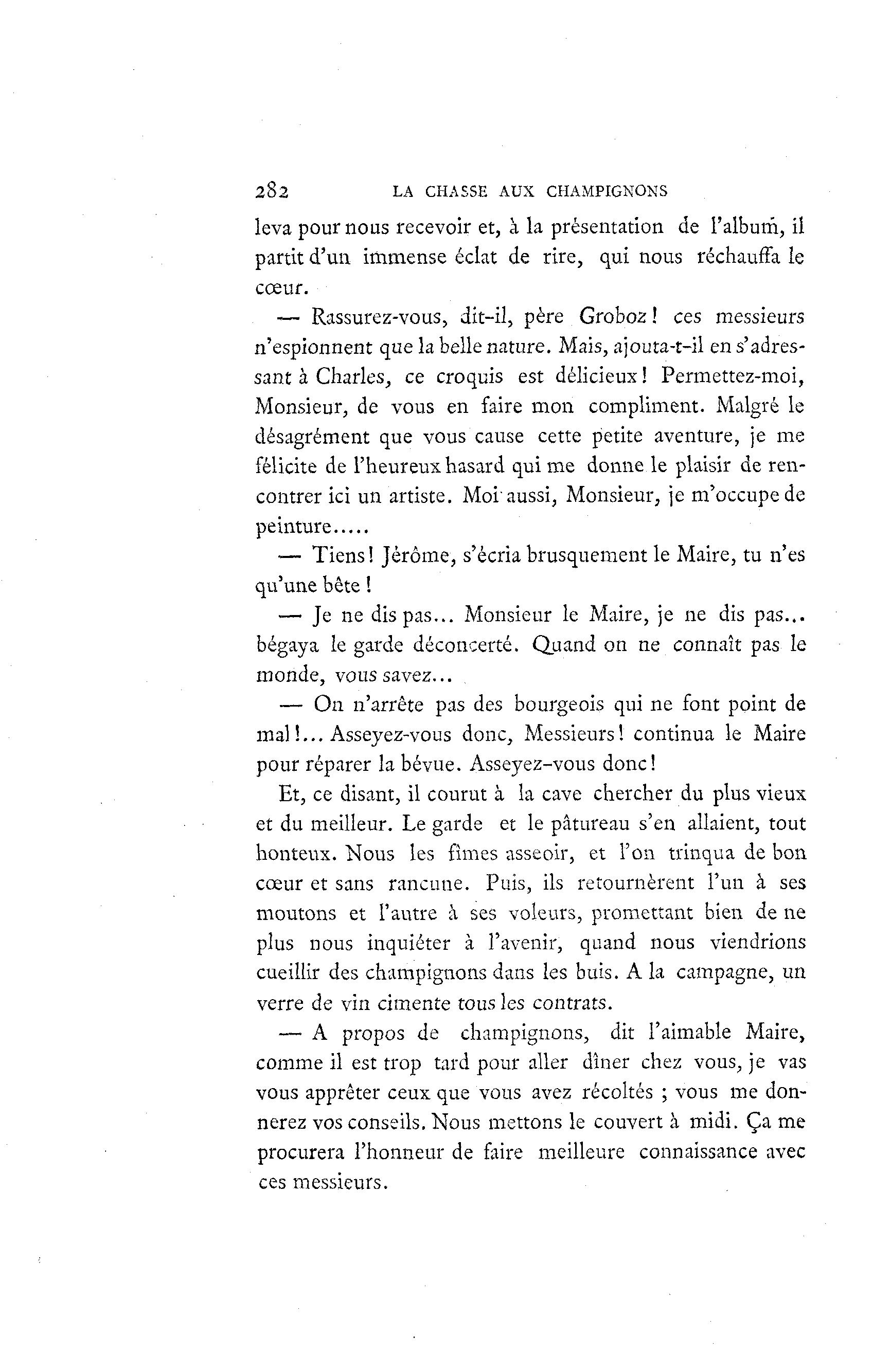 282 LA CHASSE AUX CHAMPIGNONS leva pour nous recevoir et, à la présentation de l'album, il partit d'un immense éclat de rire, qui nous réchauffa le cœur. — Rassurez-vous, dit-il, père Groboz ! ces messieurs n'espionnent que la belle nature. Mais, ajouta-t-il en s'adres- sant à Charles, ce croquis est délicieux ! Permettez-moi, Monsieur, de vous en faire mon compliment. Malgré le désagrément que vous cause cette petite aventure, je me félicite de l'heureux hasard qui me donne le plaisir de ren- contrer ici un artiste. Moi'aussi, Monsieur, je m'occupe de peinture — Tiens ! Jérôme, s'écria brusquement le Maire, tu n'es qu'une bête ! — Je ne dis pas... Monsieur le Maire, je ne dis pas... bégaya le garde déconcerté. Quand on ne connaît pas le monde, vous savez... — On n'arrête pas des bourgeois qui ne font point de mal !... Asseyez-vous donc, Messieurs! continua le Maire pour réparer la bévue. Asseyez-vous donc! Et, ce disant, il courut à la cave chercher du plus vieux et du meilleur. Le garde et le pâtureau s'en allaient, tout honteux. Nous les fîmes asseoir, et l'on trinqua de bon cœur et sans rancune. Puis, ils retournèrent l'un à ses moutons et l'autre à ses voleurs, promettant bien de ne plus nous inquiéter à l'avenir, quand nous viendrions cueillir des champignons dans les buis. A la campagne, un verre de vin cimente tous les contrats. — A propos de champignons, dit l'aimable Maire, comme il est trop tard pour aller dîner chez vous, je vas vous apprêter ceux que vous avez récoltés ; vous me don- nerez vos conseils. Nous mettons le couvert à midi. Ça me procurera l'honneur de faire meilleure connaissance avec ces messieurs.