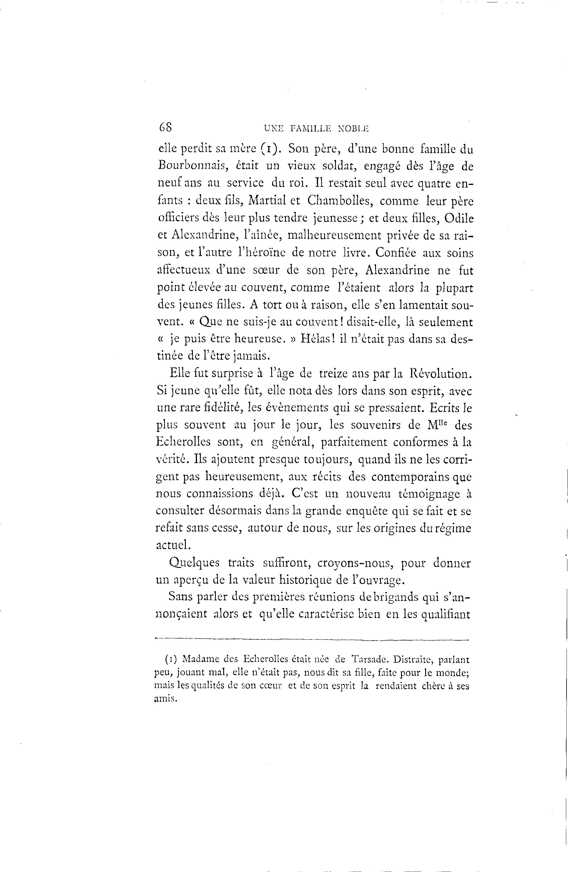 68 USE FAMILLE KOBI.E elle perdit sa mère ( i ) . Son père, d'une bonne famille du Bourbonnais, était un vieux soldat, engagé dès l'âge de neuf ans au service du roi. Il restait seul avec quatre en- fants : deux fils, Martial et Chambolles, comme leur père officiers dès leur plus tendre jeunesse ; et deux filles, Odile et Alexandrine, l'aînée, malheureusement privée de sa rai- son, et l'autre l'héroïne de notre livre. Confiée aux soins affectueux d'une sœur de son père, Alexandrine ne fut point élevée au couvent, comme l'étaient alors la plupart des jeunes filles. A tort ou à raison, elle s'en lamentait sou- vent. « Que ne suis-je au couvent! disait-elle, là seulement « je puis être heureuse. » Hélas! il n'était pas dans sa des- tinée de l'être jamais. Elle fut surprise à l'âge de treize ans par la Révolution. Si jeune qu'elle fût, elle nota dès lors dans son esprit, avec une rare fidélité, les événements qui se pressaient. Ecrits le plus souvent au jour le jour, les souvenirs de MIle des Echerolles sont, en général, parfaitement conformes à la vérité. Ils ajoutent presque toujours, quand ils ne les corri- gent pas heureusement, aux récits des contemporains que nous connaissions déjà . C'est un nouveau témoignage à consulter désormais dans la grande enquête qui se fait et se refait sans cesse, autour de nous, sur les origines du régime actuel. Quelques traits suffiront, croyons-nous, pour donner un aperçu de la valeur historique de l'ouvrage. Sans parler des premières réunions de brigands qui s'an- nonçaient alors et qu'elle caractérise bien en les qualifiant (i) Madame des Echerolles était née de Tarsade. Distraite, parlant peu., jouant mal, elle n'était pas, nous dit sa fille, faite pour le inonde; mais les qualités de son cœur et de son esprit la rendaient chère à ses amis.