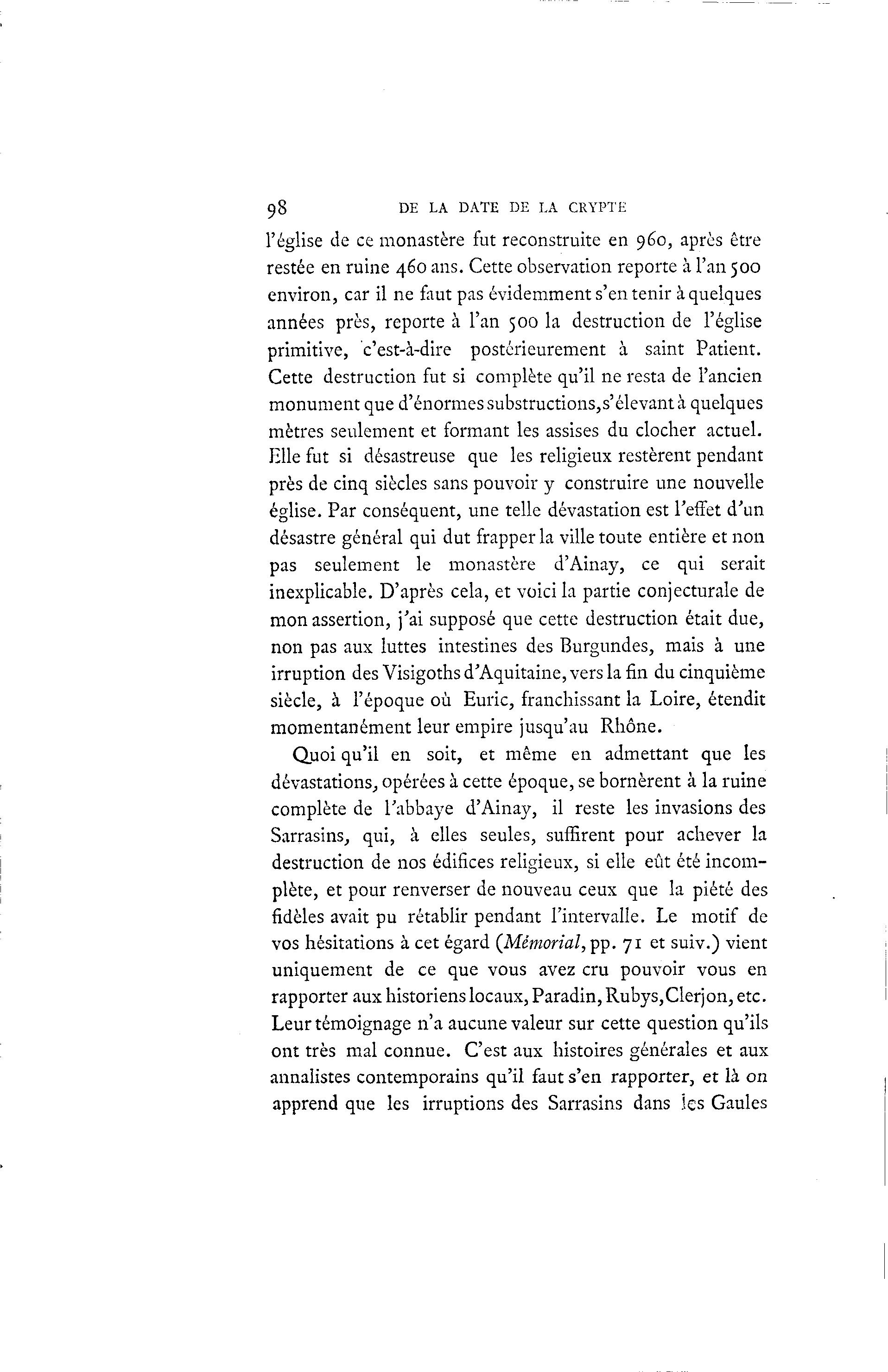 98 DE LA DATE DE LA CRYPTE l'église de ce monastère fut reconstruite en 960, après être restée en ruine 460 ans. Cette observation reporte à l'an 500 environ, car il ne faut pas évidemment s'en tenir à quelques années près, reporte à l'an 500 la destruction de l'église primitive, c'est-à -dire postérieurement à saint Patient. Cette destruction fut si complète qu'il ne resta de l'ancien monument que d'énormes substructions,s'élevant à quelques mètres seulement et formant les assises du clocher actuel. Elle fut si désastreuse que les religieux restèrent pendant près de cinq siècles sans pouvoir y construire une nouvelle église. Par conséquent, une telle dévastation est l'effet d'un désastre général qui dut frapper la ville toute entière et non pas seulement le monastère d'Ainay, ce qui serait inexplicable. D'après cela, et voici la partie conjecturale de mon assertion, j'ai supposé que cette destruction était due, non pas aux luttes intestines des Burgundes, mais à une irruption des Visigoths d'Aquitaine, vers la fin du cinquième siècle, à l'époque où Euric, franchissant la Loire, étendit momentanément leur empire jusqu'au Rhône. Quoi qu'il en soit, et même en admettant que les dévastations, opérées à cette époque, se bornèrent à la ruine complète de l'abbaye d'Ainay, il reste les invasions des Sarrasins, qui, à elles seules, suffirent pour achever la destruction de nos édifices religieux, si elle eût été incom- plète, et pour renverser de nouveau ceux que la piété des fidèles avait pu rétablir pendant l'intervalle. Le motif de vos hésitations à cet égard (Mémorial, pp. 71 et suiv.) vient uniquement de ce que vous avez cru pouvoir vous en rapporter aux historiens locaux, Paradin, Rubys,Clerjon, etc. Leur témoignage n'a aucune valeur sur cette question qu'ils ont très mal connue. C'est aux histoires générales et aux annalistes contemporains qu'il faut s'en rapporter, et là on apprend que les irruptions des Sarrasins dans les Gaules