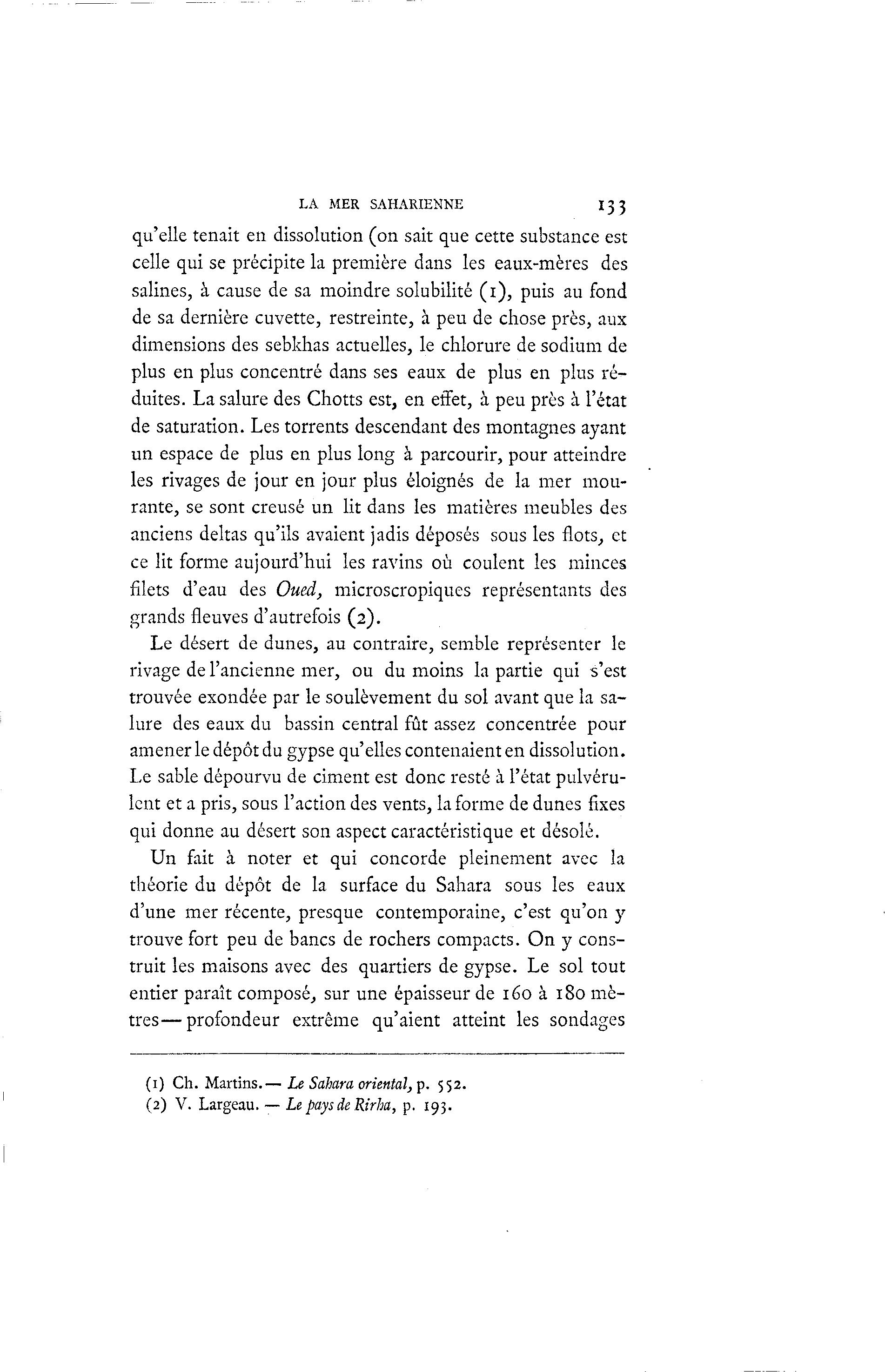 LA MER SAHARIENNE 133 qu'elle tenait en dissolution (on sait que cette substance est celle qui se précipite la première dans les eaux-mères des salines, à cause de sa moindre solubilité ( i ) , puis au fond de sa dernière cuvette, restreinte, à peu de chose près, aux dimensions des sebkhas actuelles, le chlorure de sodium de plus en plus concentré dans ses eaux de plus en plus ré- duites. La salure des Chotts est, en effet, à peu près à l'état de saturation. Les torrents descendant des montagnes ayant un espace de plus en plus long à parcourir, pour atteindre les rivages de jour en jour plus éloignés de la mer mou- rante, se sont creusé un lit dans les matières meubles des anciens deltas qu'ils avaient jadis déposés sous les flots, et ce lit forme aujourd'hui les ravins où coulent les minces filets d'eau des Oued, microscropiques représentants des grands fleuves d'autrefois (2). Le désert de dunes, au contraire, semble représenter le rivage de l'ancienne mer, ou du moins la partie qui s'est trouvée exondée par le soulèvement du sol avant que la sa- lure des eaux du bassin central fût assez concentrée pour amener le dépôt du gypse qu'elles contenaient en dissolution. Le sable dépourvu de ciment est donc resté à l'état pulvéru- lent et a pris, sous l'action des vents, la forme de dunes fixes qui donne au désert son aspect caractéristique et désolé. Un fait à noter et qui concorde pleinement avec la théorie du dépôt de la surface du Sahara sous les eaux d'une mer récente, presque contemporaine, c'est qu'on y trouve fort peu de bancs de rochers compacts. On y cons- truit les maisons avec des quartiers de gypse. Le sol tout entier paraît composé, sur une épaisseur de 160 à 180 mè- tres— profondeur extrême qu'aient atteint les sondages (1) Ch. Martins.— Le Sahara oriental, p. 552. (2) V. Largeau. — Le pays de Rirha, p. 193.