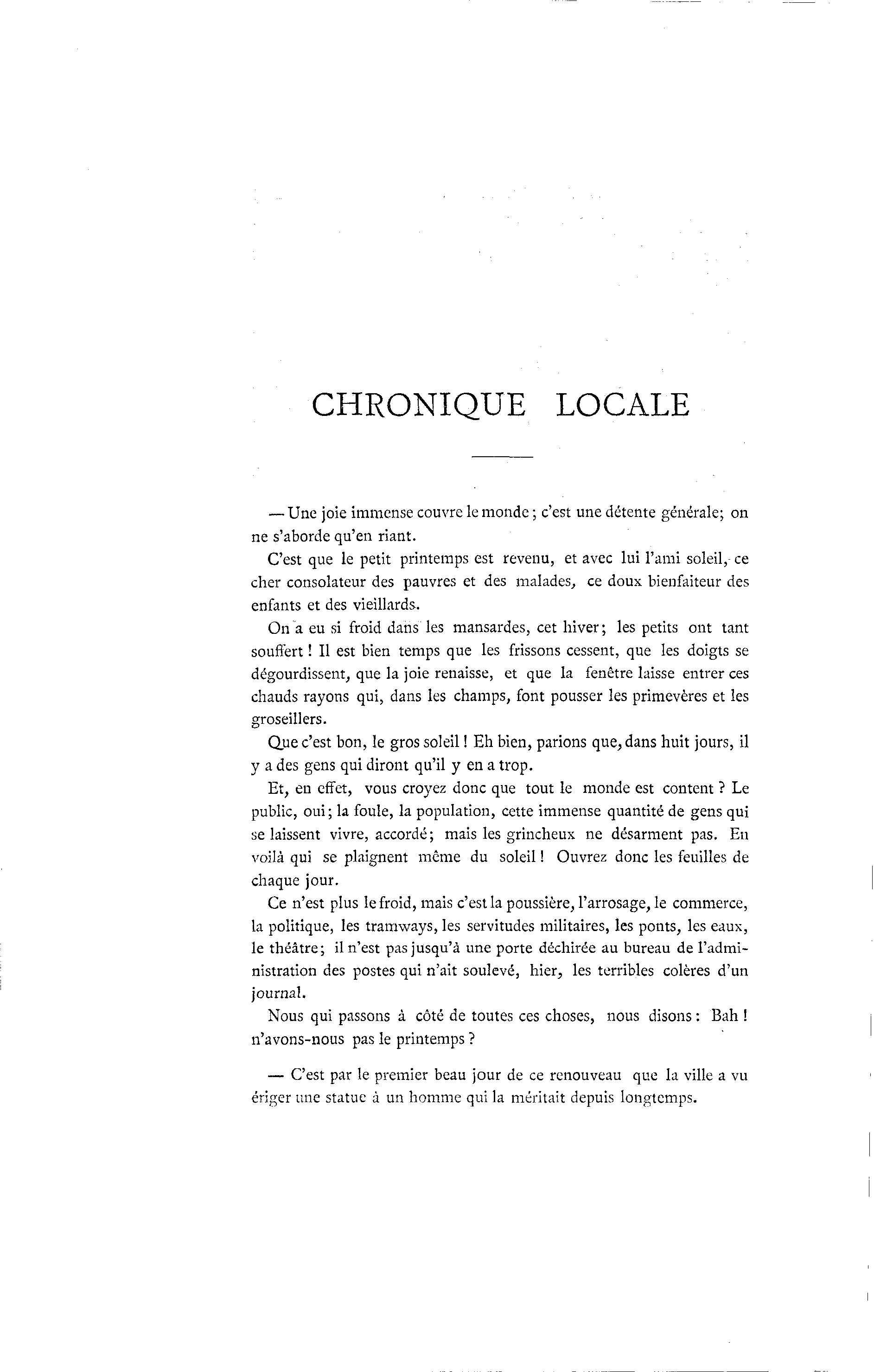 CHRONIQUE LOCALE — Une joie immense couvre le monde ; c'est une détente générale; on ne s'aborde qu'en riant. C'est que le petit printemps est revenu, et avec lui l'ami soleil, ce cher consolateur des pauvres et des malades, ce doux bienfaiteur des enfants et des vieillards. On "a eu si froid dans les mansardes, cet hiver; les petits ont tant souffert ! Il est bien temps que les frissons cessent, que les doigts se dégourdissent, que la joie renaisse, et que la fenêtre laisse entrer ces chauds rayons qui, dans les champs, font pousser les primevères et les groseillers. Que c'est bon, le gros soleil ! Eh bien, parions que, dans huit jours, il y a des gens qui diront qu'il y en a trop. Et, en effet, vous croyez donc que tout le monde est content ? Le public, oui ; la foule, la population, cette immense quantité de gens qui se laissent vivre, accordé ; mais les grincheux ne désarment pas. Eu voilà qui se plaignent même du soleil ! Ouvrez donc les feuilles de chaque jour. Ce n'est plus le froid, mais c'est la poussière, l'arrosage, le commerce, la politique, les tramways, les servitudes militaires, les ponts, les eaux, le théâtre; il n'est pas jusqu'à une porte déchirée au bureau de l'admi- nistration des postes qui n'ait soulevé, hier, les terribles colères d'un journal. Nous qui passons à côté de toutes ces choses, nous disons : Bah ! n'avons-nous pas le printemps ? — C'est par le premier beau jour de ce renouveau que la ville a vu ériger une statue à un homme qui la méritait depuis longtemps.
