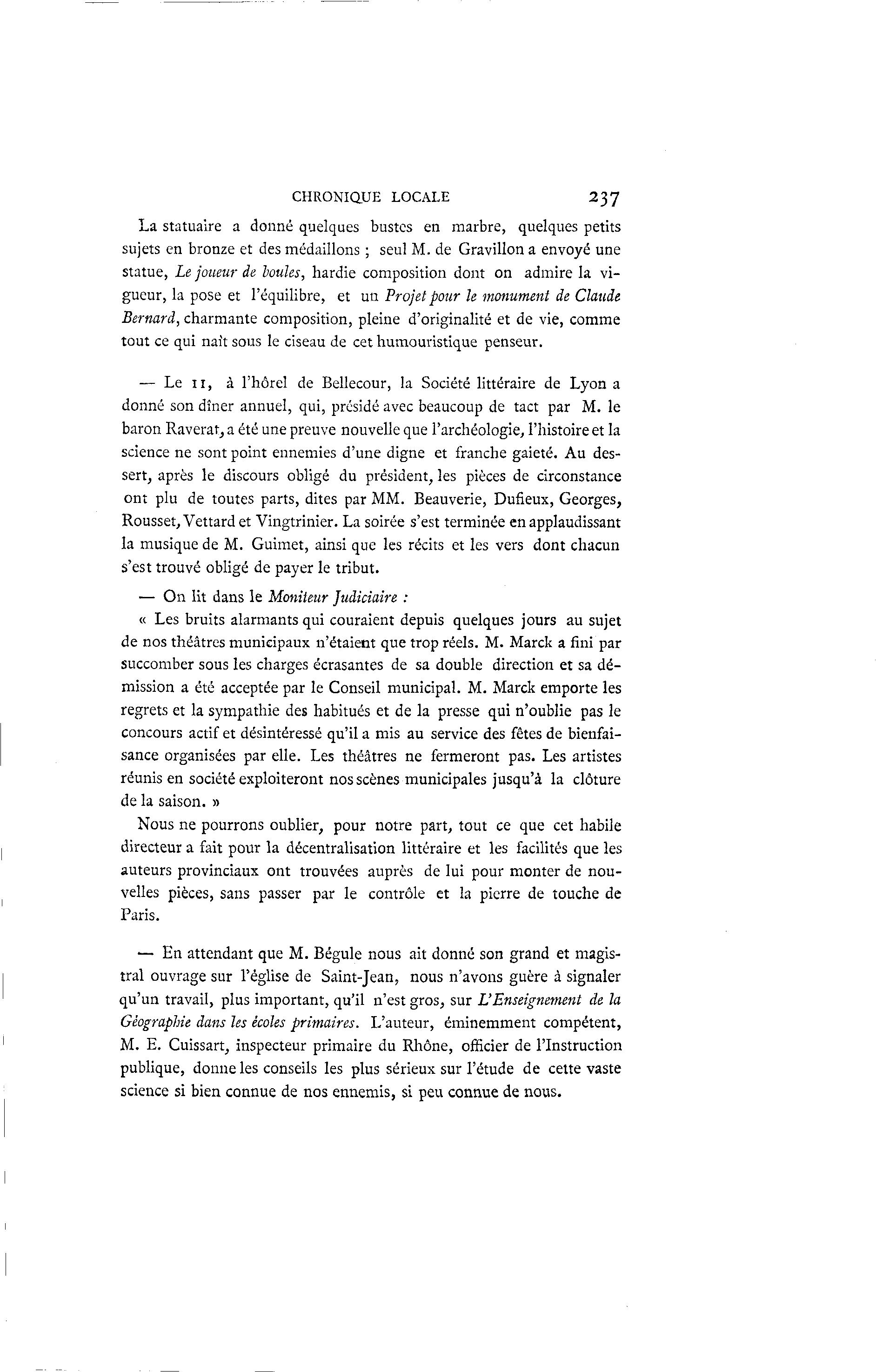 CHRONIQUE LOCALE 237 La statuaire a donné quelques bustes en marbre, quelques petits sujets en bronze et des médaillons ; seul M. de Gravillon a envoyé une statue, Le joueur de boules, hardie composition dont on admire la vi- gueur, la pose et l'équilibre, et mi. Projet pour le monument de Claude Bernard, charmante composition, pleine d'originalité et de vie, comme tout ce qui nait sous le ciseau de cet humouristique penseur. — Le i l , à l'hôrel de Bellecour, la Société littéraire de Lyon a donné son dîner annuel, qui, présidé avec beaucoup de tact par M. le baron Raverar, a été une preuve nouvelle que l'archéologie, l'histoire et la science ne sont point ennemies d'une digne et franche gaieté. Au des- sert, après le discours obligé du président, les pièces de circonstance ont plu de toutes parts, dites par MM. Beauverie, Dufieux, Georges, Rousset, Vettard et Vingtrinier. La soirée s'est terminée en applaudissant la musique de M. Guimet, ainsi que les récits et les vers dont chacun s'est trouvé obligé de payer le tribut. — On lit dans le Moniteur Judiciaire : « Les bruits alarmants qui couraient depuis quelques jours au sujet de nos théâtres municipaux n'étaient que trop réels. M. Marck a fini par succomber sous les charges écrasantes de sa double direction et sa dé- mission a été acceptée par le Conseil municipal. M. Marck emporte les regrets et la sympathie des habitués et de la presse qui n'oublie pas le concours actif et désintéressé qu'il a mis au service des fêtes de bienfai- sance organisées par elle. Les théâtres ne fermeront pas. Les artistes réunis en société exploiteront nos scènes municipales jusqu'à la clôture de la saison. » Nous ne pourrons oublier, pour notre part, tout ce que cet habile directeur a fait pour la décentralisation littéraire et les facilités que les auteurs provinciaux ont trouvées auprès de lui pour monter de nou- velles pièces, sans passer par le contrôle et la pierre de touche de Paris. — En attendant que M. Bégule nous ait donné son grand et magis- tral ouvrage sur l'église de Saint-Jean, nous n'avons guère à signaler qu'un travail, plus important, qu'il n'est gros, sur L'Enseignement de la Géographie dans les écoles primaires. L'auteur, éminemment compétent, M. E. Cuissart, inspecteur primaire du Rhône, officier de l'Instruction publique, donne les conseils les plus sérieux sur l'étude de cette vaste science si bien connue de nos ennemis, si peu connue de nous.