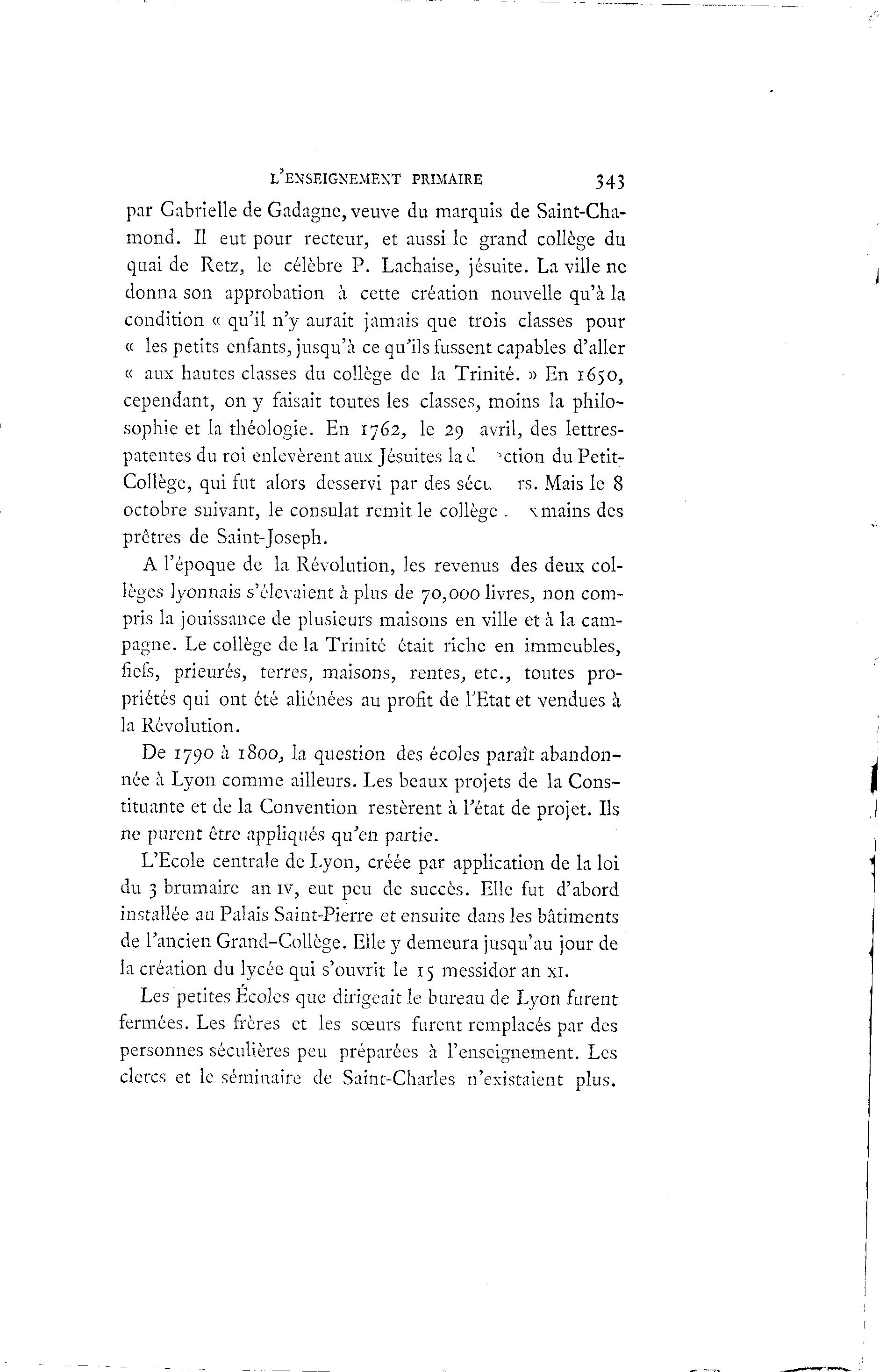 L'ENSEIGNEMENT PRIMAIRE 343 par Gabrielle de Gadagne, veuve du marquis de Saint-Cha- mond. Il eut pour recteur, et aussi le grand collège du quai de Retz, le célèbre P. Lachaise, jésuite. La ville ne donna son approbation à cette création nouvelle qu'à la condition « qu'il n'y aurait jamais que trois classes pour « les petits enfants, jusqu'à ce qu'ils fussent capables d'aller « aux hautes classes du collège de la Trinité. » En 1650, cependant, on y faisait toutes les classes, moins la philo- sophie et la théologie. En 1762, le 29 avril, des lettres- patentes du roi enlevèrent aux Jésuites la d ^ction du Petit- Collège, qui fut alors desservi par des sécu rs. Mais le 8 octobre suivant, le consulat remit le collège . s.mains des prêtres de Saint-Joseph. A l'époque de la Révolution, les revenus des deux col- lèges lyonnais s'élevaient à plus de 70,000 livres, non com- pris la jouissance de plusieurs maisons en ville et à la cam- pagne. Le collège de la Trinité était riche en immeubles, fiefs, prieurés, terres, maisons, rentes, etc., toutes pro- priétés qui ont été aliénées au profit de l'Etat et vendues à la Révolution. De 1790 à 1800, la question des écoles paraît abandon- née à Lyon comme ailleurs. Les beaux projets de la Cons- tituante et de la Convention restèrent à l'état de projet. Us ne purent être appliqués qu'en partie. L'Ecole centrale de Lyon, créée par application de la loi du 3 brumaire an iv, eut peu de succès. Elle fut d'abord installée au Palais Saint-Pierre et ensuite dans les bâtiments de l'ancien Grand-Collège. Elle y demeura jusqu'au jour de la création du lycée qui s'ouvrit le 15 messidor an xi. Les petites Ecoles que dirigeait le bureau de Lyon furent fermées. Les frères et les sœurs furent remplacés par des personnes séculières peu préparées à l'enseignement. Les clercs et le séminaire de Saint-Charles n'existaient plus.
