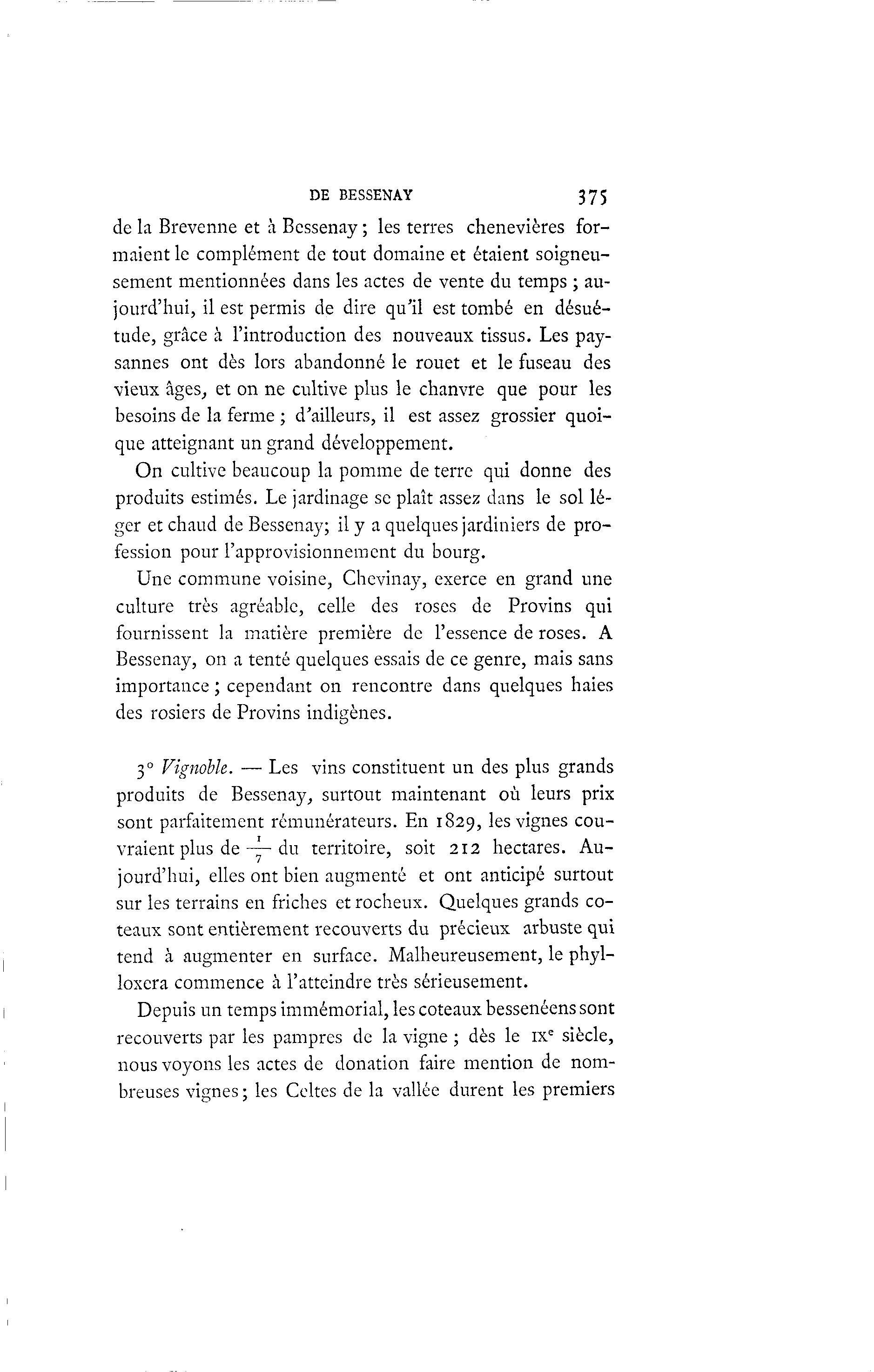 DE BESSENAY 375 de la Brevenne et à Bcssenay ; les terres chenevières for- maient le complément de tout domaine et étaient soigneu- sement mentionnées dans les actes de vente du temps ; au- jourd'hui, il est permis de dire qu'il est tombé en désué- tude, grâce à l'introduction des nouveaux tissus. Les pay- sannes ont dès lors abandonné le rouet et le fuseau des vieux âges, et on ne cultive plus le chanvre que pour les besoins de la ferme ; d'ailleurs, il est assez grossier quoi- que atteignant un grand développement. On cultive beaucoup la pomme de terre qui donne des produits estimés. Le jardinage se plaît assez dans le sol lé- ger et chaud de Bessenay; il y a quelques jardiniers de pro- fession pour l'approvisionnement du bourg. Une commune voisine, Chcvinay, exerce en grand une culture très agréable, celle des roses de Provins qui fournissent la matière première de l'essence de roses. A Bessenay, on a tenté quelques essais de ce genre, mais sans importance ; cependant on rencontre dans quelques haies des rosiers de Provins indigènes. 3 0 Vignoble. — Les vins constituent un des plus grands produits de Bessenay, surtout maintenant où leurs prix sont parfaitement rémunérateurs. En 1829, les vignes cou- vraient plus de —- du territoire, soit 212 hectares. Au- jourd'hui, elles ont bien augmenté et ont anticipé surtout sur les terrains en friches et rocheux. Quelques grands co- teaux sont entièrement recouverts du précieux arbuste qui tend à augmenter en surface. Malheureusement, le phyl- loxéra commence à l'atteindre très sérieusement. Depuis un temps immémorial, les coteaux bessenéens sont recouverts par les pampres de la vigne ; dès le IXe siècle, nous voyons les actes de donation faire mention de nom- breuses vignes ; les Celtes de la vallée durent les premiers