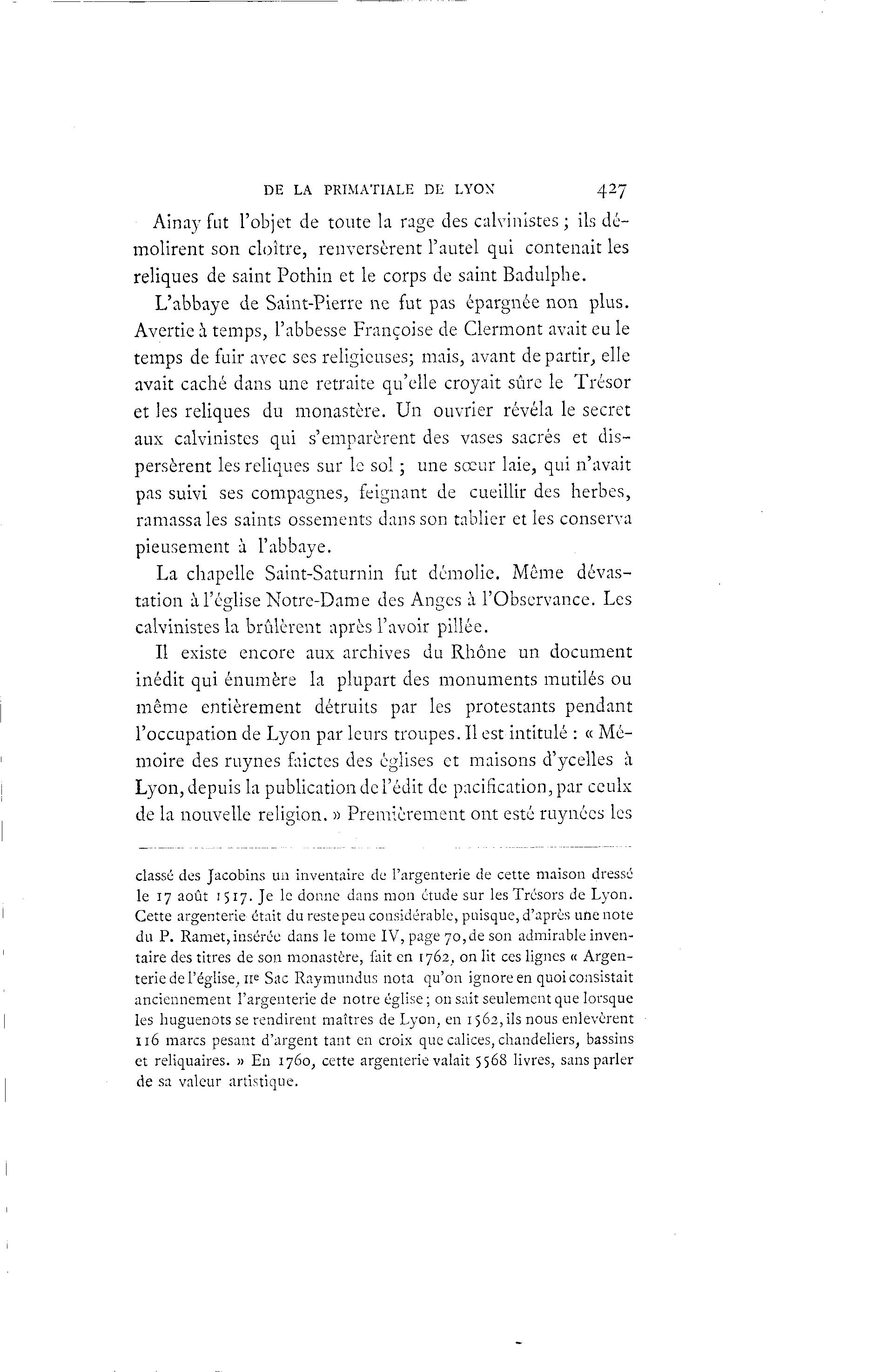 DE LA PRIMATIALE DE LYON 427 Ainay fut l'objet de toute la rage des calvinistes; ils dé- molirent son cloître, renversèrent l'autel qui contenait les reliques de saint Pothin et le corps de saint Badulphe. L'abbaye de Saint-Pierre ne fut pas épargnée non plus. Avertie à temps, l'abbesse Françoise de Clermont avait eu le temps de fuir avec ses religieuses; mais, avant départir, elle avait caché dans une retraite qu'elle croyait sûre le Trésor et les reliques du monastère. Un ouvrier révéla le secret aux calvinistes qui s'emparèrent des vases sacrés et dis- persèrent les reliques sur le sol ; une sœur laie, qui n'avait pas suivi ses compagnes, feignant de cueillir des herbes, ramassa les saints ossements dans son tablier et les conserva pieusement à l'abbaye. La chapelle Saint-Saturnin fut démolie. Même dévas- tation à l'église Notre-Dame des Anges à l'Observance. Les calvinistes la brûlèrent après l'avoir pillée. Il existe encore aux archives du Rhône un document inédit qui énumère la plupart des monuments mutilés ou même entièrement détruits par les protestants pendant l'occupation de Lyon par leurs troupes. Il est intitulé : « Mé- moire des ruynes faictes des églises et maisons d'ycelles à Lyon, depuis la publication de l'édit de pacification, par ceulx de la nouvelle religion. » Premièrement ont esté ruynécs les classé des Jacobins un inventaire de l'argenterie de cette maison dressé le 17 août 1517. Je le donne dans mon étude sur les Trésors de Lyon. Cette argenterie était du reste peu considérable, puisque, d'après une note du P. Ramet,insérée dans le tome IV, page 70,de son admirable inven- taire des titres de son monastère, fait en 1762, on lit ces lignes « Argen- terie de l'église, 11e Sac Raymundus nota qu'on ignore en quoi consistait anciennement l'argenterie de notre église; on sait seulement que lorsque les huguenots se rendirent maîtres de Lyon, en 1562, ils nous enlevèrent 116 marcs pesant d'argent tant en croix que calices, chandeliers, bassins et reliquaires. » En 1760, cette argenterie valait 5568 livres, sans parler de sa valeur artistique.