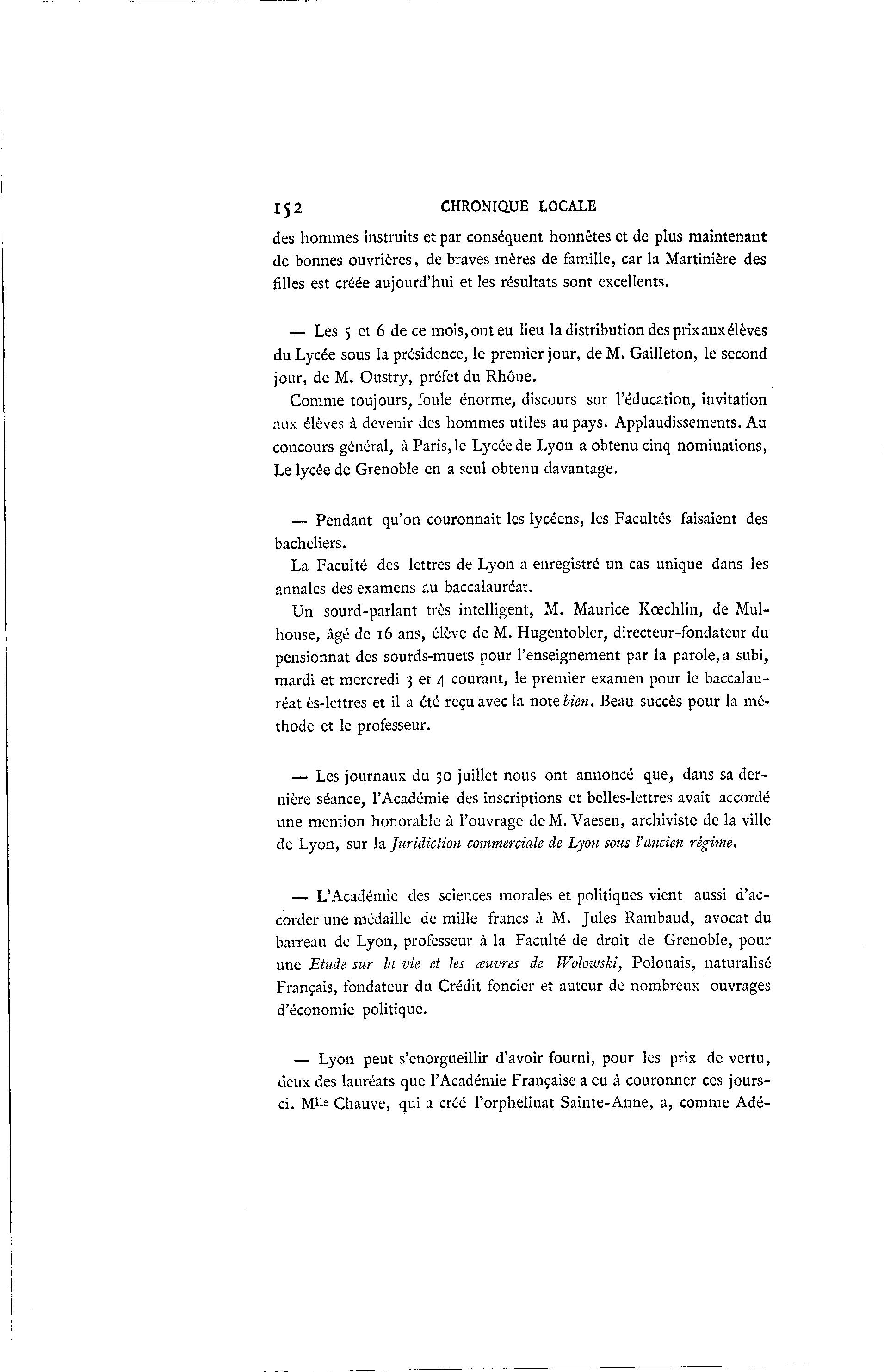 152 CHRONIQUE LOCALE des hommes instruits et par conséquent honnêtes et de plus maintenant de bonnes ouvrières, de braves mères de famille, car la Martinière des filles est créée aujourd'hui et les résultats sont excellents. — Les 5 et 6 de ce mois, ont eu lieu la distribution des prix aux élèves du Lycée sous la présidence, le premier jour, de M. Gailleton, le second jour, de M. Oustry, préfet du Rhône. Comme toujours, foule énorme, discours sur l'éducation, invitation aux élèves à devenir des hommes utiles au pays. Applaudissements, Au concours général, à Paris, le Lycée de Lyon a obtenu cinq nominations, Le lycée de Grenoble en a seul obtenu davantage. — Pendant qu'on couronnait les lycéens, les Facultés faisaient des bacheliers. La Faculté des lettres de Lyon a enregistré un cas unique dans les annales des examens au baccalauréat. Un sourd-parlant très intelligent, M. Maurice Kcechlin, de Mul- house, âgé de 16 ans, élève de M. Hugentobler, directeur-fondateur du pensionnat des sourds-muets pour l'enseignement par la parole, a subi, mardi et mercredi 3 et 4 courant, le premier examen pour le baccalau- réat ès-lettres et il a été reçu avec la note bien. Beau succès pour la mé- thode et le professeur. — Les journaux du 30 juillet nous ont annoncé que, dans sa der- nière séance, l'Académie des inscriptions et belles-lettres avait accordé une mention honorable à l'ouvrage de M. Vaesen, archiviste de la ville de Lyon, sur la Juridiction commerciale de Lyon sous l'ancien régime. — L'Académie des sciences morales et politiques vient aussi d'ac- corder une médaille de mille francs à M. Jules Rambaud, avocat du barreau de Lyon, professeur à la Faculté de droit de Grenoble, pour une Etude sur la vie et les auvres de Wolowski, Polonais, naturalisé Français, fondateur du Crédit foncier et auteur de nombreux ouvrages d'économie politique. — Lyon peut s'enorgueillir d'avoir fourni, pour les prix de vertu, deux des lauréats que l'Académie Française a eu à couronner ces jours- ci. M'is Chauve, qui a créé l'orphelinat Sainte-Anne, a, comme Adé-