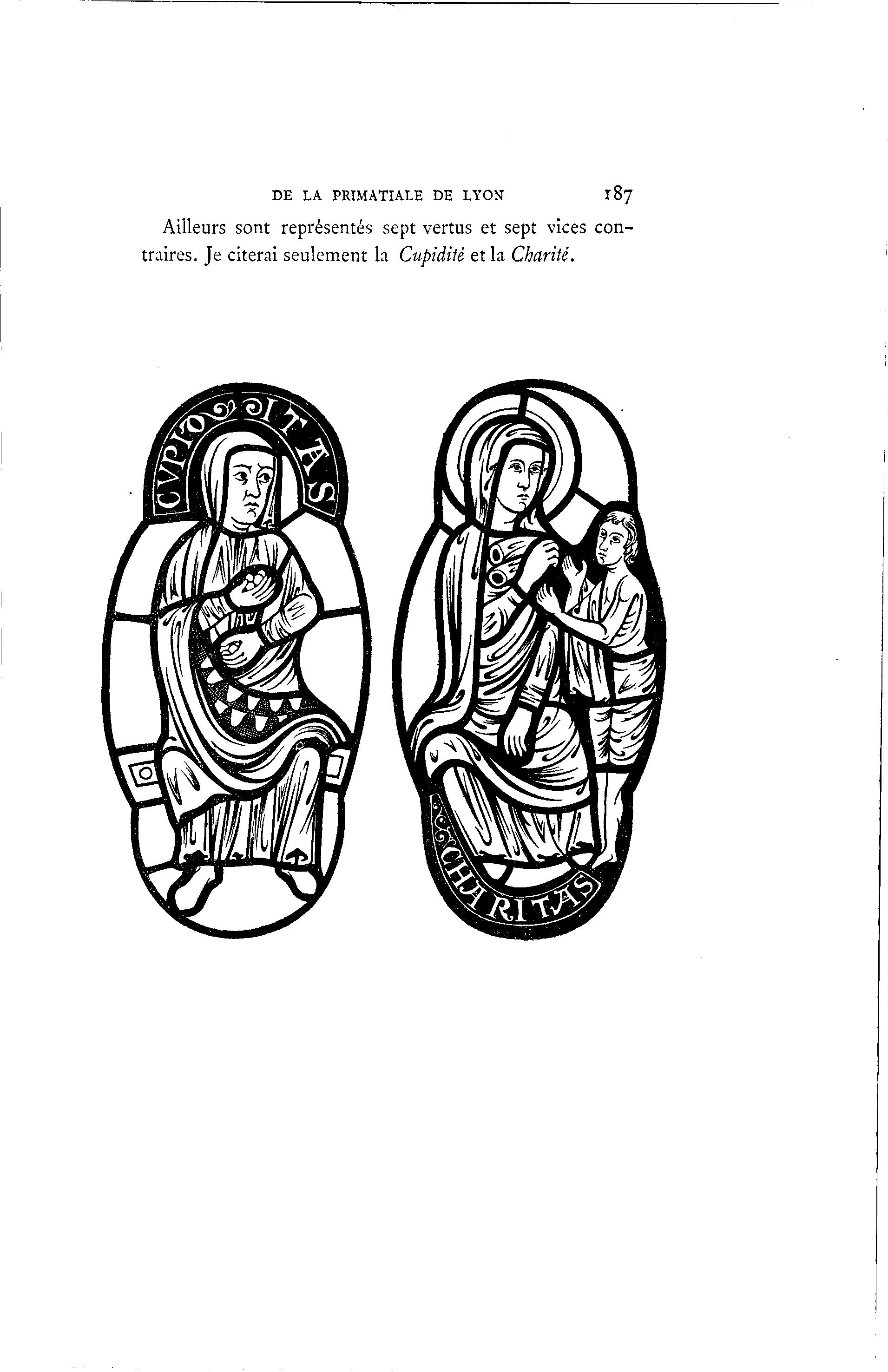 DE LA PRIMATIALE DE LYON 187 Ailleurs sont représentés sept vertus et sept vices con- traires. Je citerai seulement la Cupidité et la Charité.
