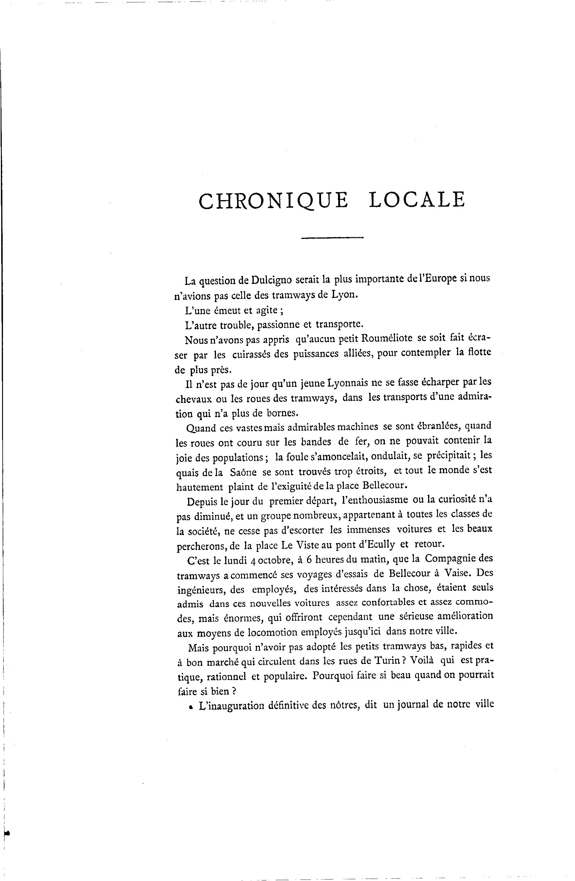 CHRONIQUE LOCALE La question de Dulcigno serait la plus importante de l'Europe si nous n'avions pas celle des tramways de Lyon. L'une émeut et agite ; L'autre trouble, passionne et transporte. Nous n'avons pas appris qu'aucun petit Rouméliote se soit fait écra- ser par les cuirassés des puissances alliées, pour contempler la flotte de plus près. Il n'est pas de jour qu'un jeune Lyonnais ne se fasse écharper par les chevaux ou les roues des tramways, dans les transports d'une admira- tion qui n'a plus de bornes. Quand ces vastes mais admirables machines se sont ébranlées, quand les roues ont couru sur les bandes de fer, on ne pouvait contenir la joie des populations ; la foule s'amoncelait, ondulait, se précipitait ; les quais de la Saône se sont trouvés trop étroits, et tout le monde s'est hautement plaint de l'exiguité de la place Bellecour. Depuis le jour du premier départ, l'enthousiasme ou la curiosité n'a pas diminué, et un groupe nombreux, appartenant à toutes les classes de la société, ne cesse pas d'escorter les immenses voitures et les beaux percherons, de la place Le Viste au pont d'Ecully et retour. C'est le lundi 4 octobre, à 6 heures du matin, que la Compagnie des tramways a commencé ses voyages d'essais de Bellecour à Vaise. Des ingénieurs, des employés, des intéressés dans la chose, étaient seuls admis dans ces nouvelles voitures assez confortables et assez commo- des, mais énormes, qui offriront cependant une sérieuse amélioration aux moyens de locomotion employés jusqu'ici dans notre ville. Mais pourquoi n'avoir pas adopté les petits tramways bas, rapides et à bon marché qui circulent dans les rues de Turin ? Voilà qui est pra- tique, rationnel et populaire. Pourquoi faire si beau quand on pourrait faire si bien ? » L'inauguration définitive des nôtres, dit un journal de notre ville