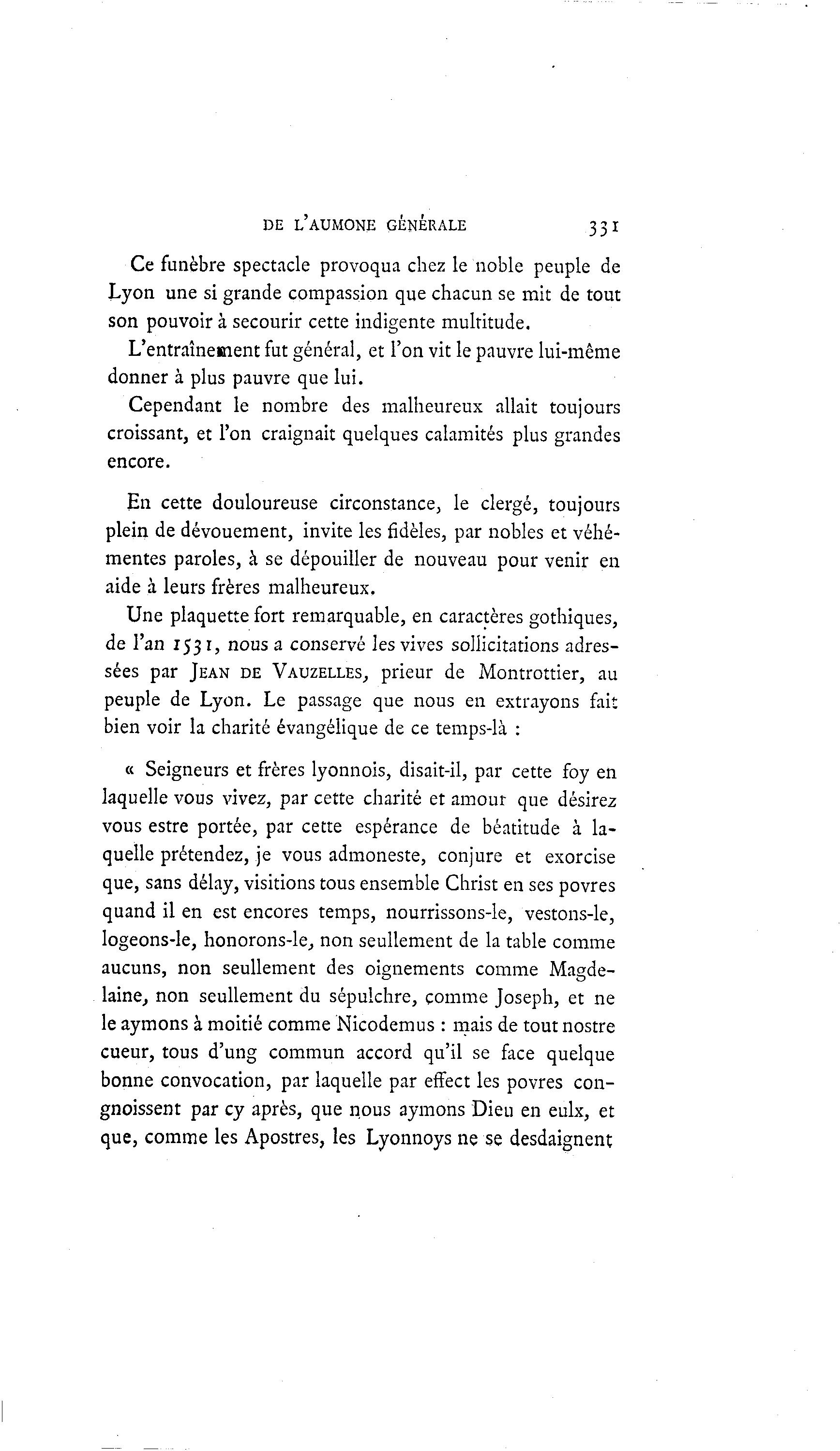 DE L'AUMONE GÉNÉRALE 331 Ce funèbre spectacle provoqua chez le noble peuple de Lyon une si grande compassion que chacun se mit de tout son pouvoir à secourir cette indigente multitude. L'entraînement fut général, et l'on vit le pauvre lui-même donner à plus pauvre que lui. Cependant le nombre des malheureux allait toujours croissant, et l'on craignait quelques calamités plus grandes encore. En cette douloureuse circonstance, le clergé, toujours plein de dévouement, invite les fidèles, par nobles et véhé- mentes paroles, à se dépouiller de nouveau pour venir en aide à leurs frères malheureux. Une plaquette fort remarquable, en caractères gothiques, de l'an 1531, nous a conservé les vives sollicitations adres- sées par JEAN DE VAUZELLES, prieur de Montrottier, au peuple de Lyon. Le passage que nous en extrayons fait bien voir la charité évangélique de ce temps-là : « Seigneurs et frères lyonnois, disait-il, par cette foy en laquelle vous vivez, par cette charité et amour que désirez vous estre portée, par cette espérance de béatitude à la- quelle prétendez, je vous admoneste, conjure et exorcise que, sans délay, visitions tous ensemble Christ en ses povres quand il en est encores temps, nourrissons-le, vestons-le, logeons-le, honorons-le., non seullement de la table comme aucuns, non seullement des oignements comme Magde- laine, non seullement du sépulchre, comme Joseph, et ne le aymons à moitié comme Nicodemus : mais de tout nostre cueur, tous d'ung commun accord qu'il se face quelque bonne convocation, par laquelle par effect les povres con- gnoissent par cy après, que nous aymons Dieu en eulx, et que, comme les Apostres, les Lyonnoys ne se desdaignent