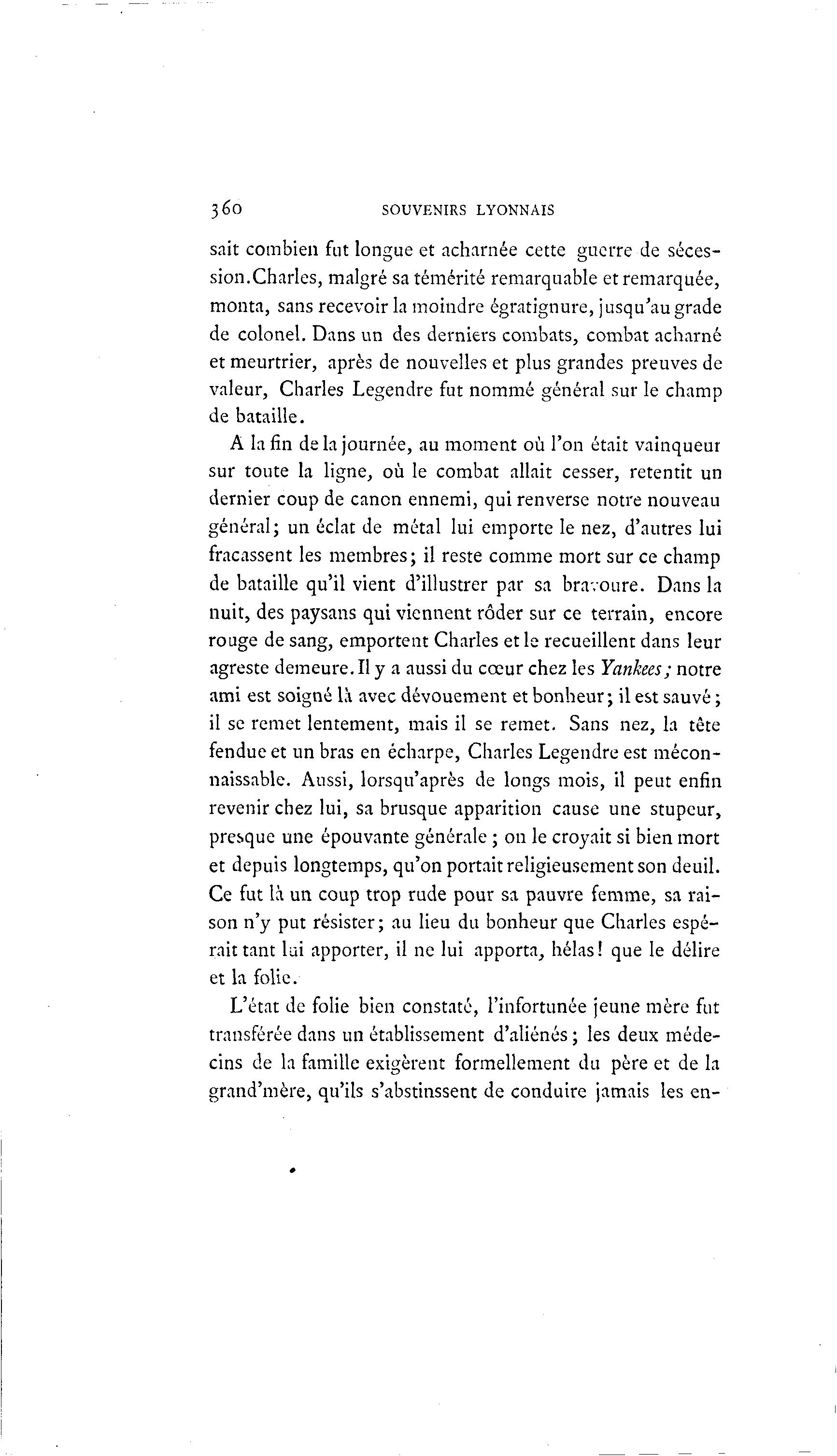 360 SOUVENIRS LYONNAIS sait combien fut longue et acharnée cette guerre de séces- sion.Charles, malgré sa témérité remarquable et remarquée, monta, sans recevoir la moindre égratignure, jusqu'au grade de colonel. Dans un des derniers combats, combat acharné et meurtrier, après de nouvelles et plus grandes preuves de valeur, Charles Legendre fut nommé général sur le champ de bataille. A la fin de la journée, au moment où l'on était vainqueur sur toute la ligne, où le combat allait cesser, retentit un dernier coup de canon ennemi, qui renverse notre nouveau général; un éclat de métal lui emporte le nez, d'autres lui fracassent les membres; il reste comme mort sur ce champ de bataille qu'il vient d'illustrer par sa bravoure. Dans la nuit, des paysans qui viennent rôder sur ce terrain, encore rouge de sang, emportent Charles et le recueillent dans leur agreste demeure. Il y a aussi du cœur chez les Yankees; notre ami est soigné là avec dévouement et bonheur; il est sauvé ; il se remet lentement, mais il se remet. Sans nez, la tête fendue et un bras en écharpe, Charles Legendre est mécon- naissable. Aussi, lorsqu'après de longs mois, il peut enfin revenir chez lui, sa brusque apparition cause une stupeur, presque une épouvante générale ; on le croyait si bien mort et depuis longtemps, qu'on portait religieusement son deuil. Ce fut là un coup trop rude pour sa pauvre femme, sa rai- son n'y put résister; au lieu du bonheur que Charles espé- rait tant lui apporter, il ne lui apporta, hélas! que le délire et la folie. L'état de folie bien constaté, l'infortunée jeune mère fut transférée dans un établissement d'aliénés ; les deux méde- cins de la famille exigèrent formellement du père et de la grand'mère, qu'ils s'abstinssent de conduire jamais les en-