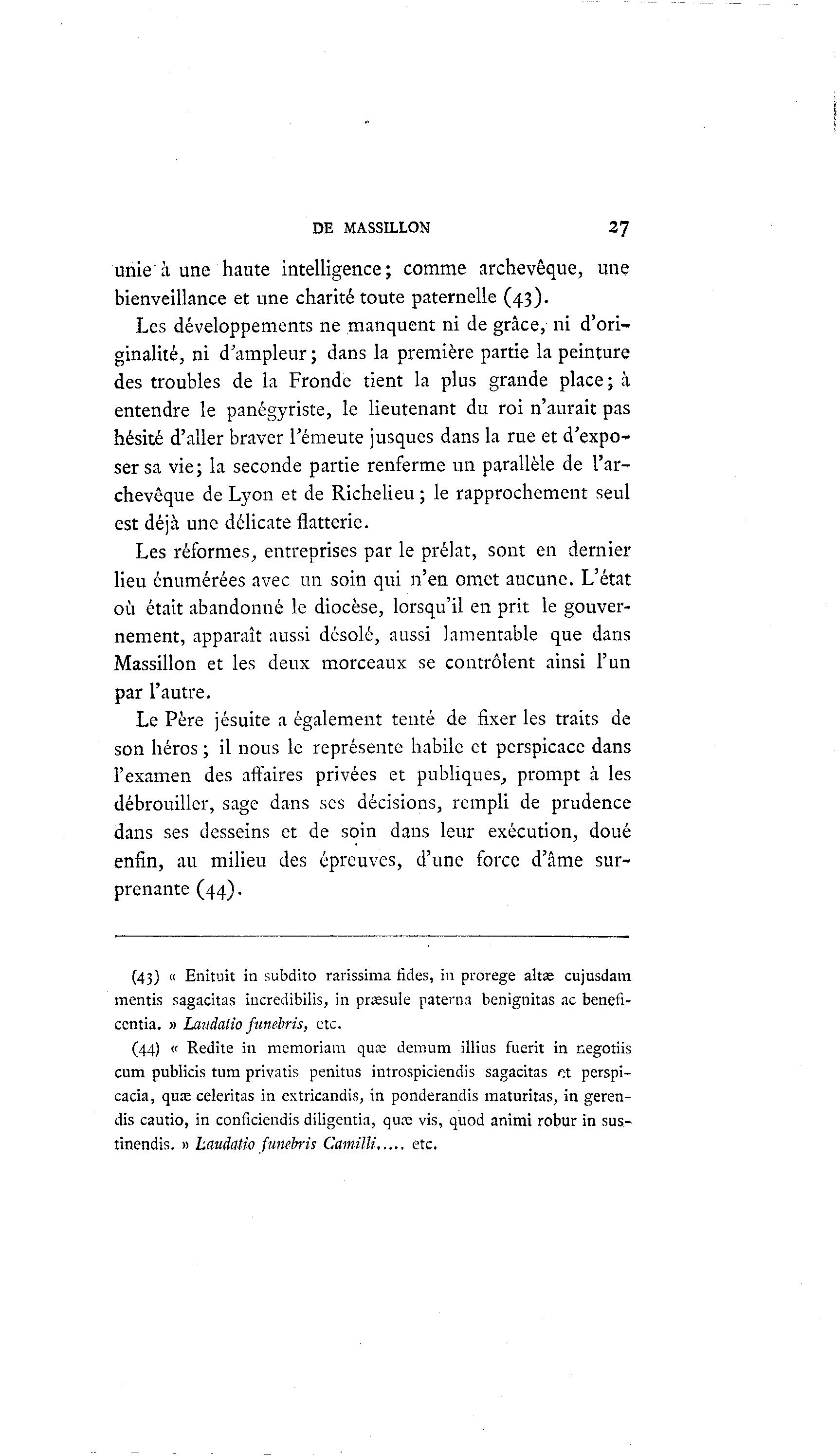 DE MASSILLON 27 unie à une haute intelligence; comme archevêque, une bienveillance et une charité toute paternelle (43). Les développements ne manquent ni de grâce, ni d'ori- ginalité, ni d'ampleur ; dans la première partie la peinture des troubles de la Fronde tient la plus grande place ; à entendre le panégyriste, le lieutenant du roi n'aurait pas hésité d'aller braver l'émeute jusques dans la rue et d'expo- ser sa vie; la seconde partie renferme un parallèle de l'ar- chevêque de Lyon et de Richelieu ; le rapprochement seul est déjà une délicate flatterie. Les réformes, entreprises par le prélat, sont en dernier lieu énumérées avec un soin qui n'en omet aucune. L'état où était abandonné le diocèse, lorsqu'il en prit le gouver- nement, apparaît aussi désolé, aussi lamentable que dans Massillon et les deux morceaux se contrôlent ainsi l'un par l'autre. Le Père jésuite a également tenté de fixer les traits de son héros ; il nous le représente habile et perspicace dans l'examen des affaires privées et publiques, prompt à les débrouiller, sage dans ses décisions, rempli de prudence dans ses desseins et de soin dans leur exécution, doué enfin, au milieu des épreuves, d'une force d'âme sur- prenante (44). (43) « Enituit in subdito rarissima fides, in protège ait» cujusdam mentis sagacitas incredibilis, in prasule paterna benignitas ac benefi- centia. » Laudatio funebris, etc. (44) « Redite in memoriam quee demum illius fuerit in negotiis cum publicis tum privatis penitus introspiciendis sagacitas ot perspi- cacia, qua; celeritas in extricandis, in ponderandis maturitas, in geren- dis cautio, in conficiendis diligentia, qure vis, quod animi robur in sus- tinendis. » Laudatio funebris Camilli etc.