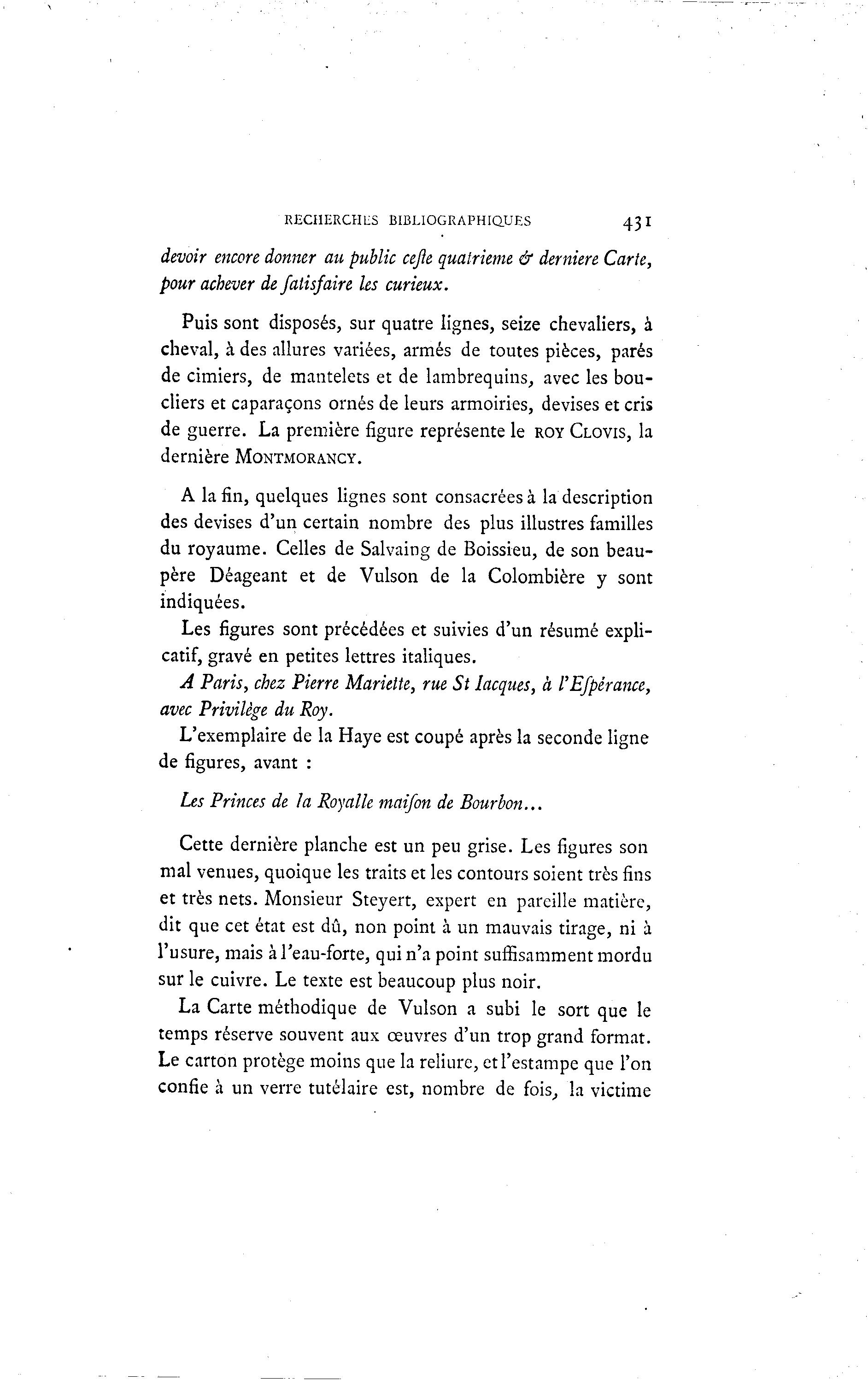 RECHERCHES BIBLIOGRAPHIQUES 43 I devoir encore donner au public cejle quatrième & dernière Carte, pour achever defatisfaire les curieux. Puis sont disposés, sur quatre lignes, seize chevaliers, à cheval, à des allures variées, armés de toutes pièces, parés de cimiers, de mantelets et de lambrequins, avec les bou- cliers et caparaçons ornés de leurs armoiries, devises et cris de guerre. La première figure représente le ROY CLOVIS, la dernière MONTMORANCY. A la fin, quelques lignes sont consacrées à la description des devises d'un certain nombre des plus illustres familles du royaume. Celles de Salvaing de Boissieu, de son beau- père Déageant et de Vulson de la Colombière y sont indiquées. Les figures sont précédées et suivies d'un résumé expli- catif, gravé en petites lettres italiques. A Paris, chez Pierre Mariette, rue St Lacques, à l'Efpèrance, avec Privilège du Roy. L'exemplaire de la Haye est coupé après la seconde ligne de figures, avant : Les Princes de la Royalle mai/on de Bourbon... Cette dernière planche est un peu grise. Les figures son mal venues, quoique les traits et les contours soient très fins et très nets. Monsieur Steyert, expert en pareille matière, dit que cet état est dû, non point à un mauvais tirage, ni à l'usure, mais à l'eau-forte, qui n'a point suffisamment mordu sur le cuivre. Le texte est beaucoup plus noir. La Carte méthodique de Vulson a subi le sort que le temps réserve souvent aux œuvres d'un trop grand format. Le carton protège moins que la reliure, et l'estampe que l'on confie à un verre tutélaire est, nombre de fois, la victime